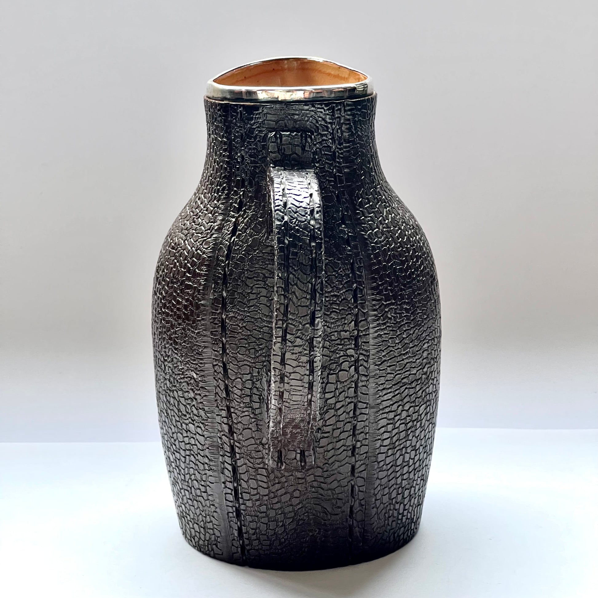 Beautiful Doulton Lambeth Leather Ware Slaters blackjack jug with Sterling Silver Rim, marked for London, 1892, Cornelius Desormeaux Saunders & James Francis Hollings (Frank) Shepherd.