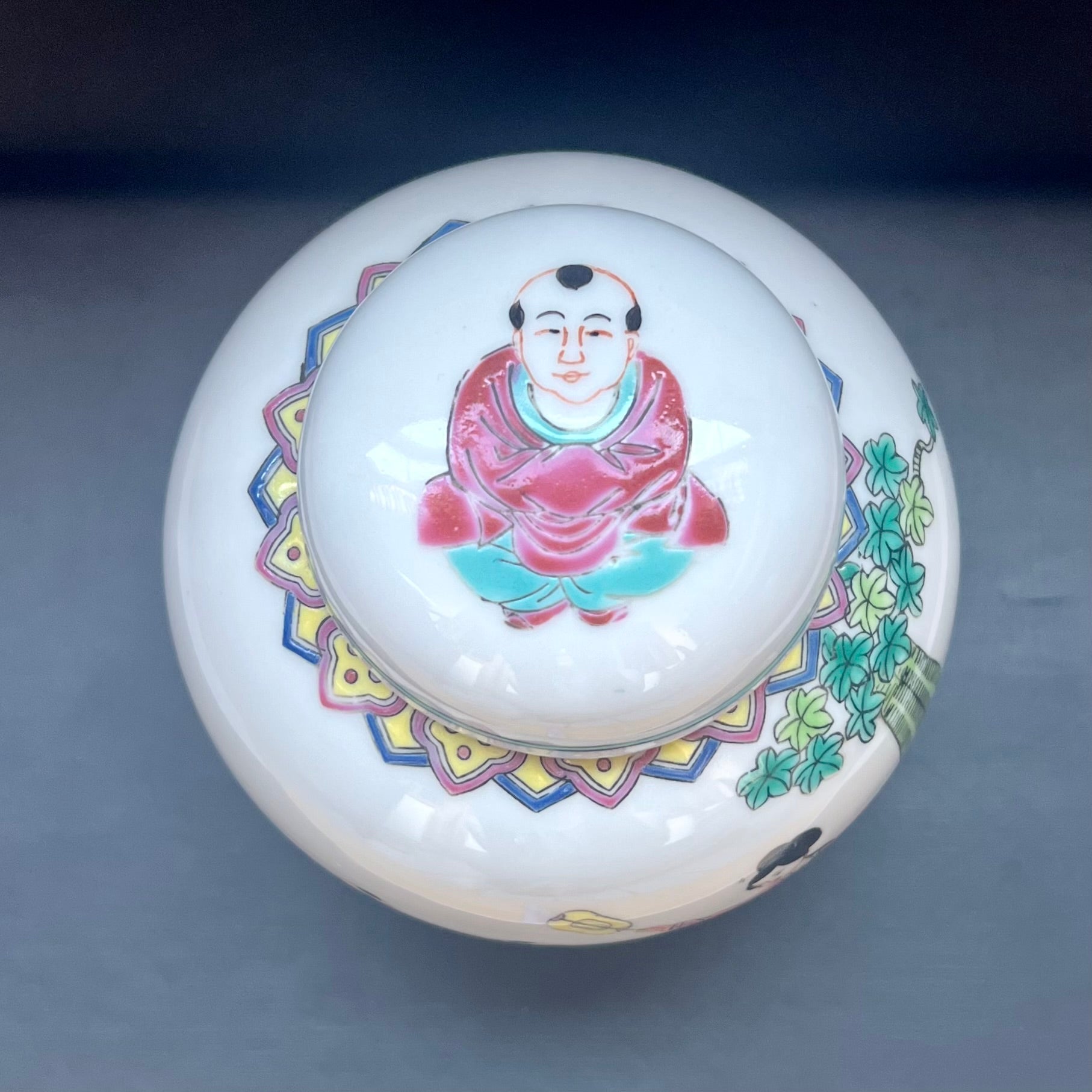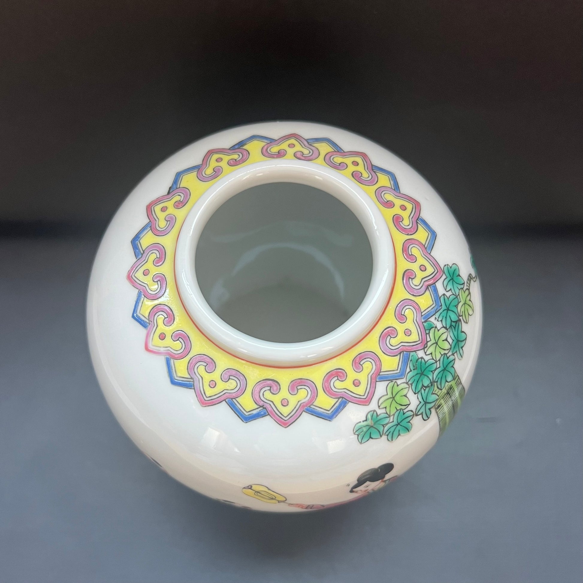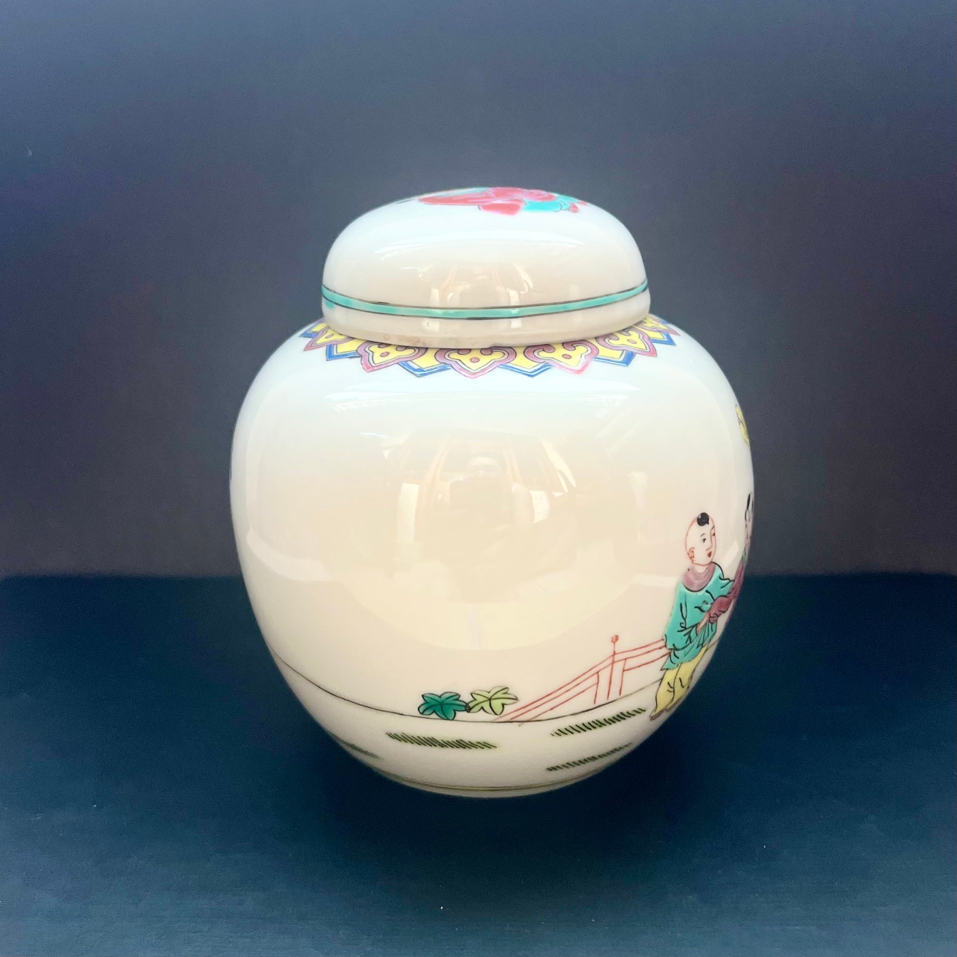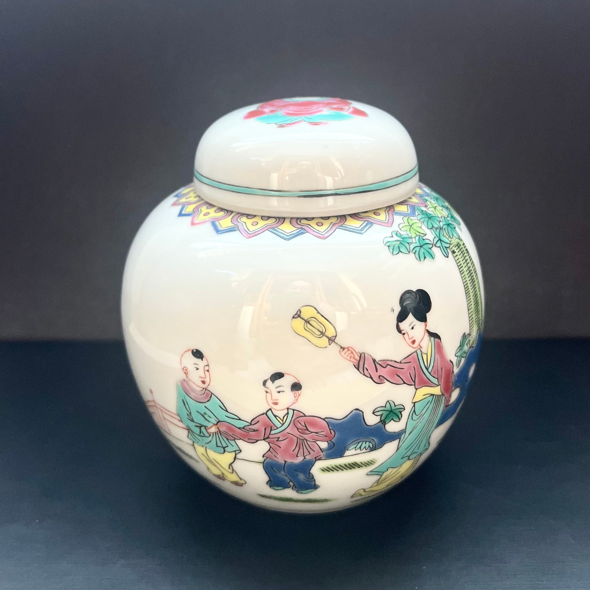 This is a beautiful vintage 20th century lidded Chinese jar from Jingdezhen with an apocryphal Yongzheng red transfer stamped seal to base. With a classic motif of a courtyard scene depicting a mother and two children, what is unusual is the man painted on the top of the lid, possibly the father of this family.