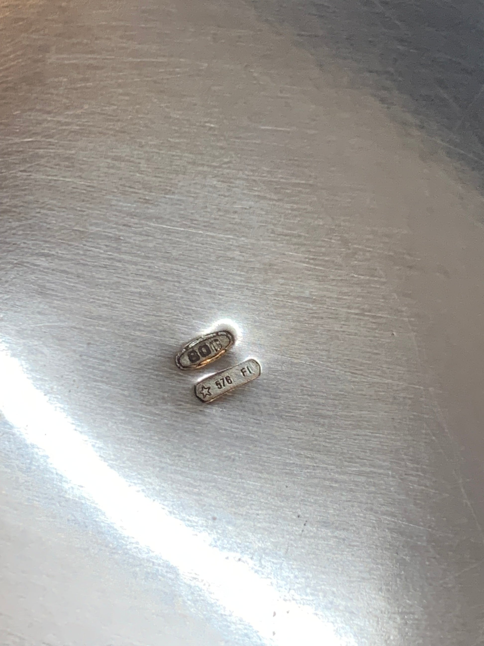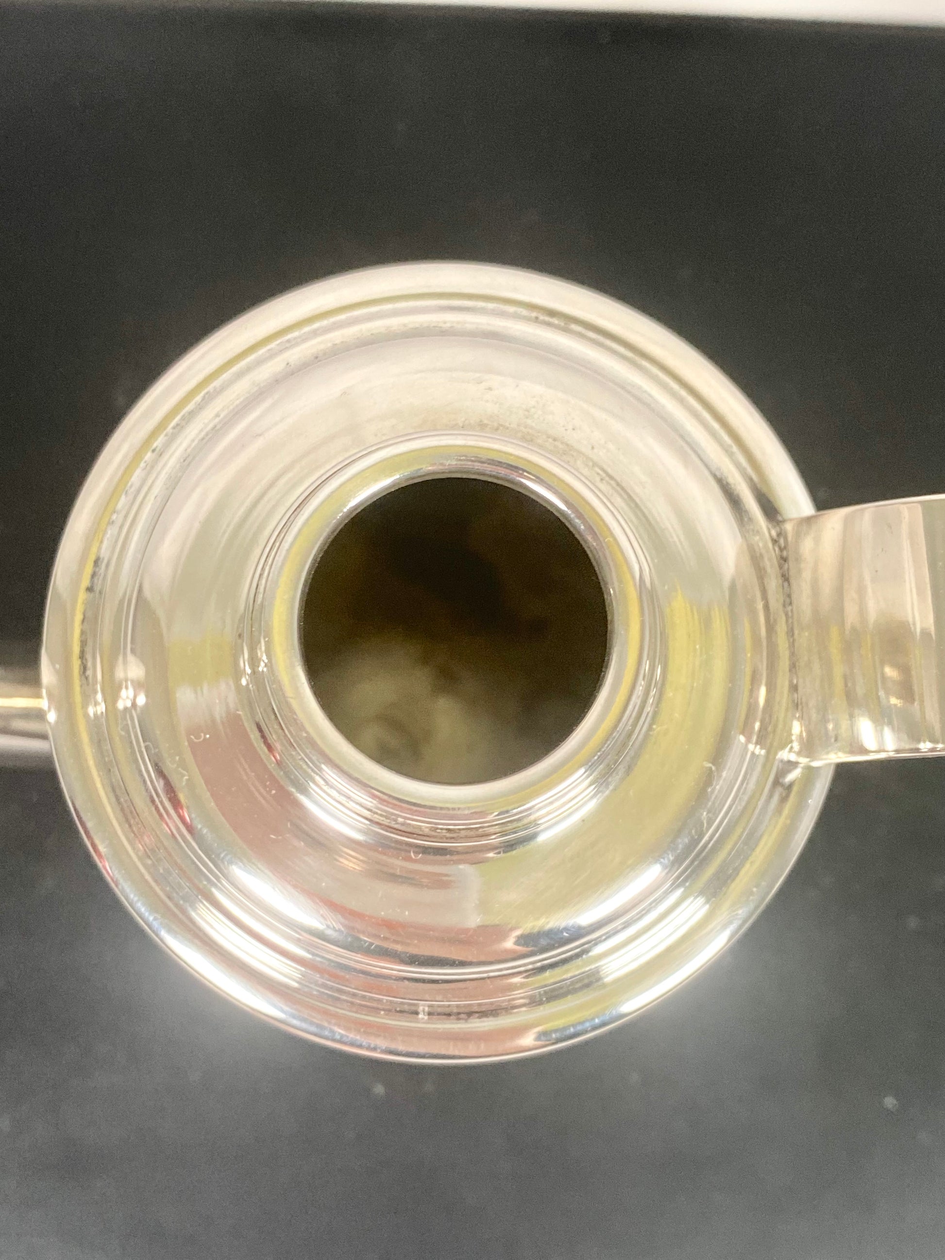 A fine .800 silver olive oil decanter / dispenser in a classic “motor oil can” design. Marked FI576 for a Firenze (Florentine) maker, circa 1970s to the present day. While the maker is unknown, a very similar style was produced by Brandimarte, a Florentine contemporary, in the 1960s. We believe ours to be circa 1970s-80s. We have two complementary pieces in a similar style; this listing is for the daintier of the two.