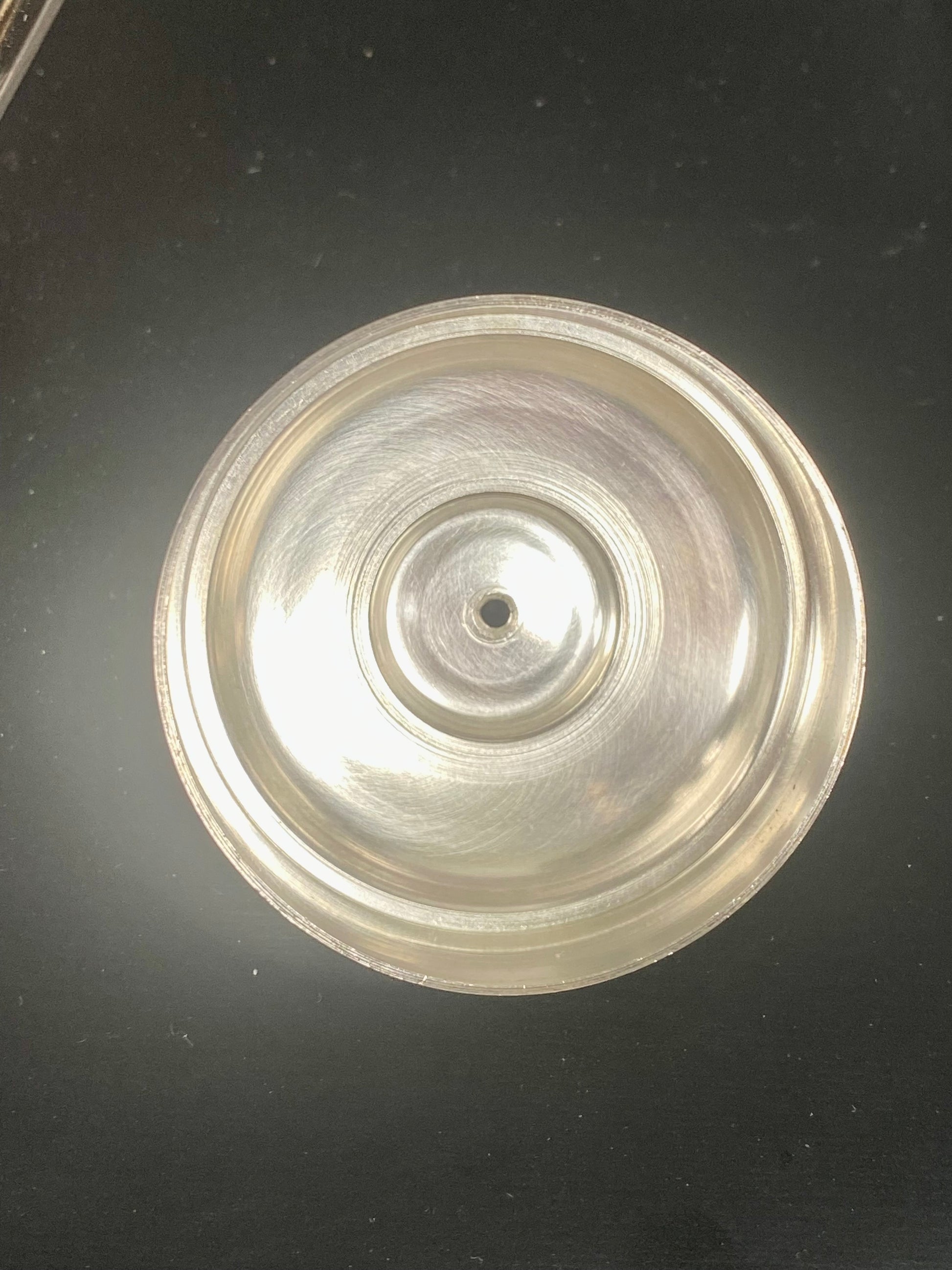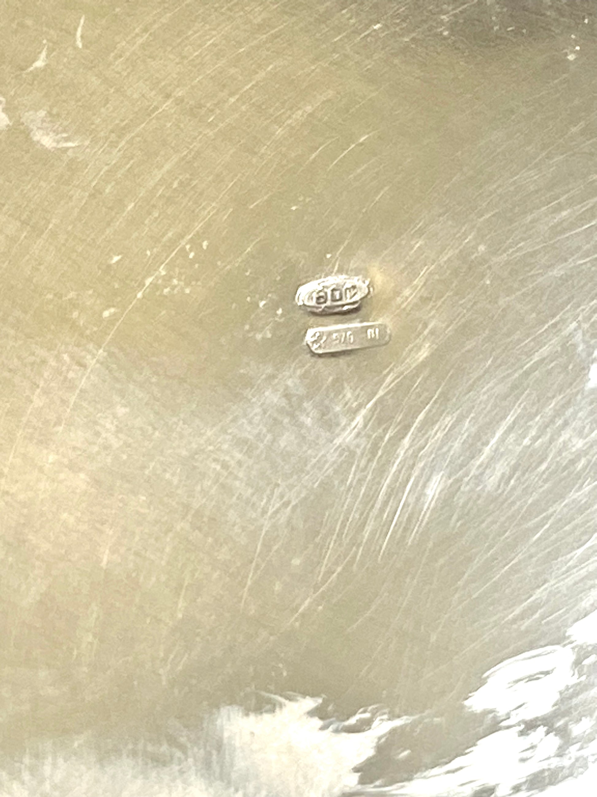 A fine .800 silver olive oil decanter / dispenser in a classic “motor oil can” design. Marked FI576 for a Firenze (Florentine) maker, circa 1970s to the present day. While the maker is unknown, a very similar style was produced by Brandimarte, a Florentine contemporary, in the 1960s. We believe ours to be circa 1970s-80s. We have two complementary pieces in a similar style; this listing is for the larger of the two.