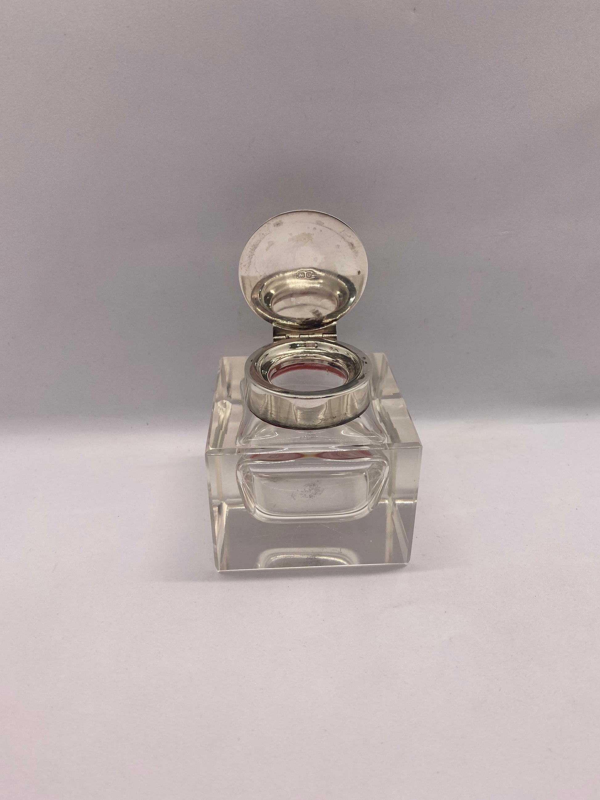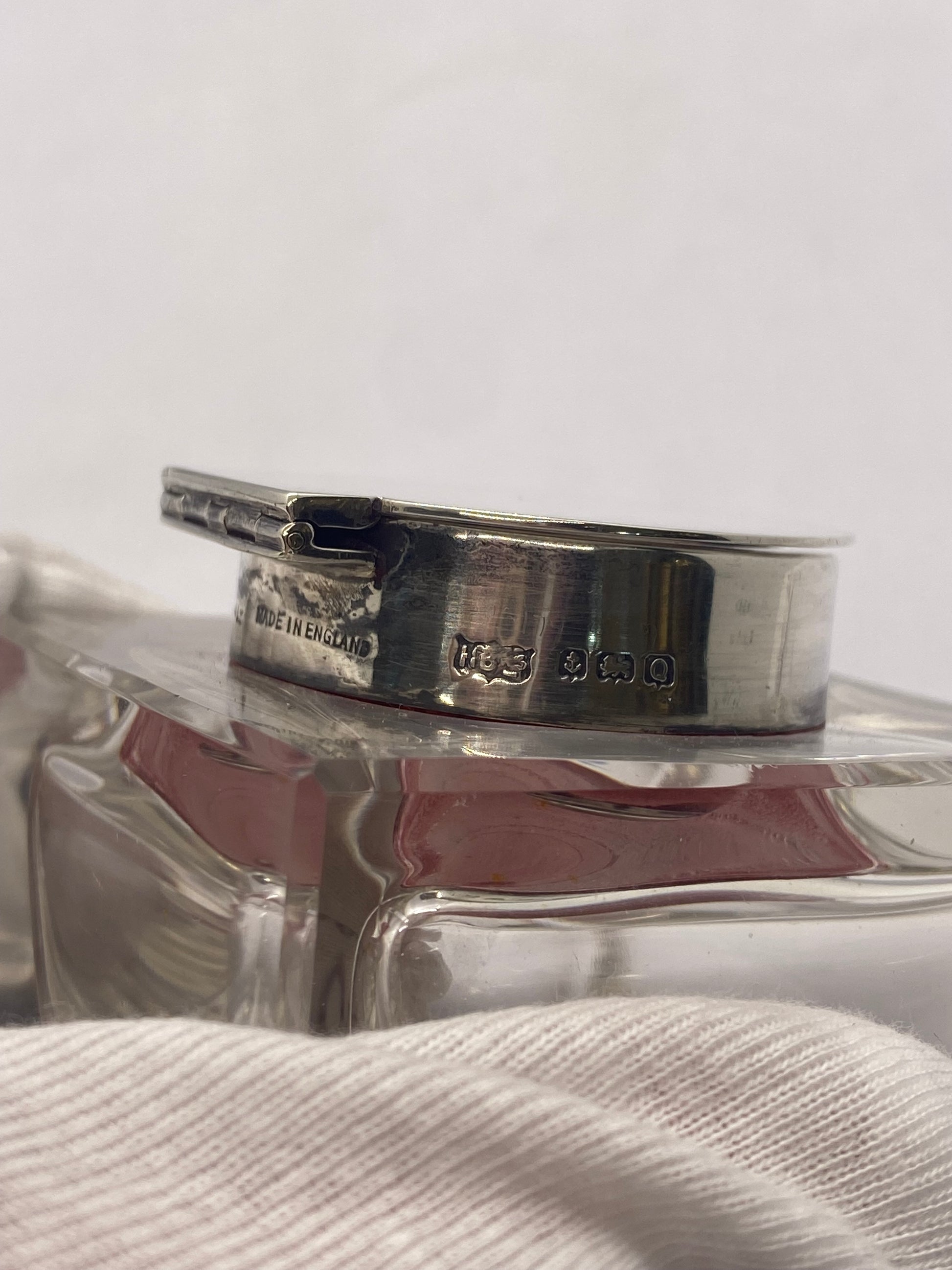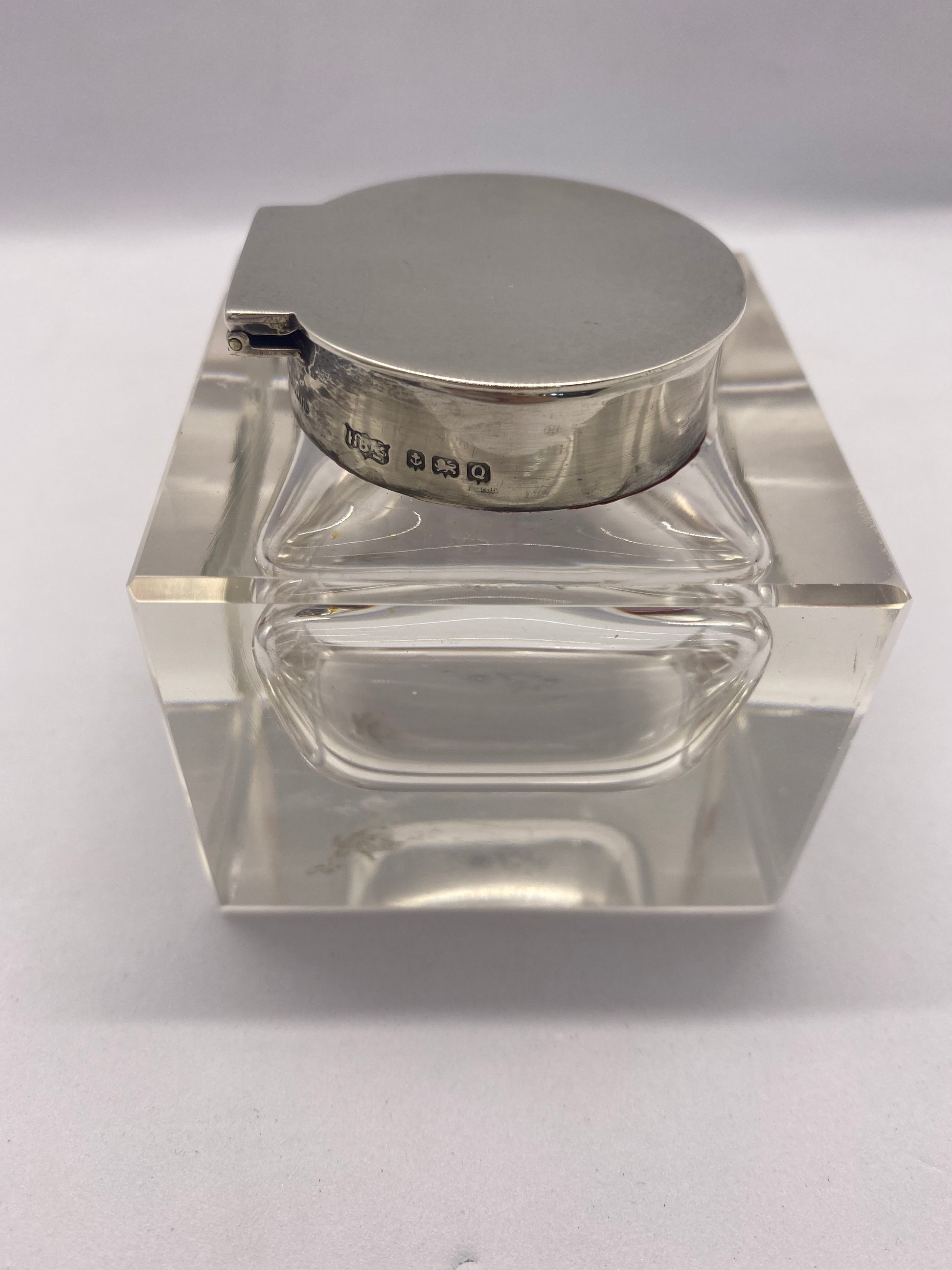 Beautiful vintage sterling silver capped inkwell with beautiful crystal compartment. Hallmarks for Birmingham, 1940. Was retailed in Sydney by Hardy Brothers, one of the finest luxury retailers in Australia.