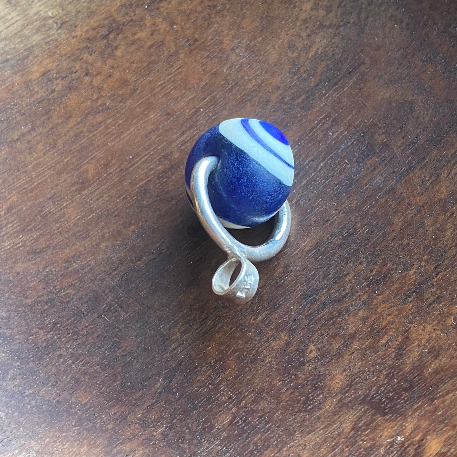 此特别列表是带有眼珠的旋转表链吊坠,眼珠上带有白色和钴蓝色细节。它们是在 20 世纪在爪哇挖掘出来的,其工艺与这一时期的千花珠相称,磨损和光泽也是如此。珠子上突出的眼睛图案表明,大约在贾提姆时期和后来的王国,工匠的工艺稍晚但仍处于早期。中央珠子有两个千花眼睛,每个部分都展示了独特的手工卷制特征。镶嵌物为纯银,由我们的工匠团队量身定制,吊环上标有 925。