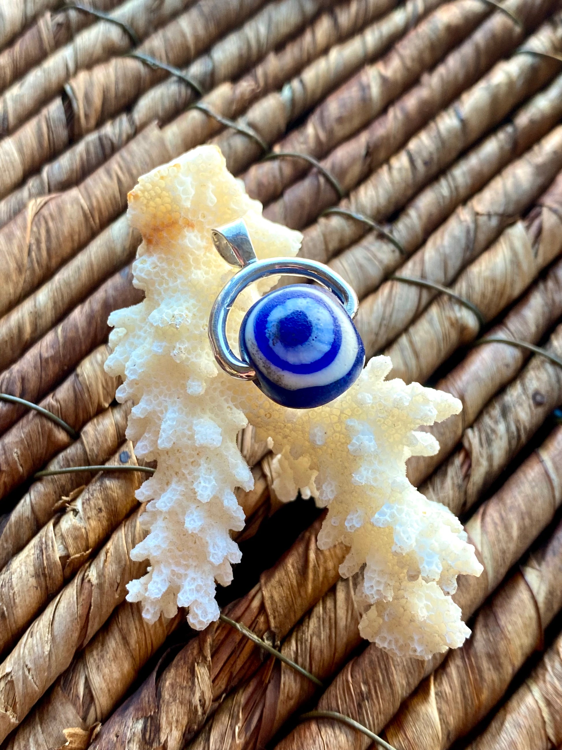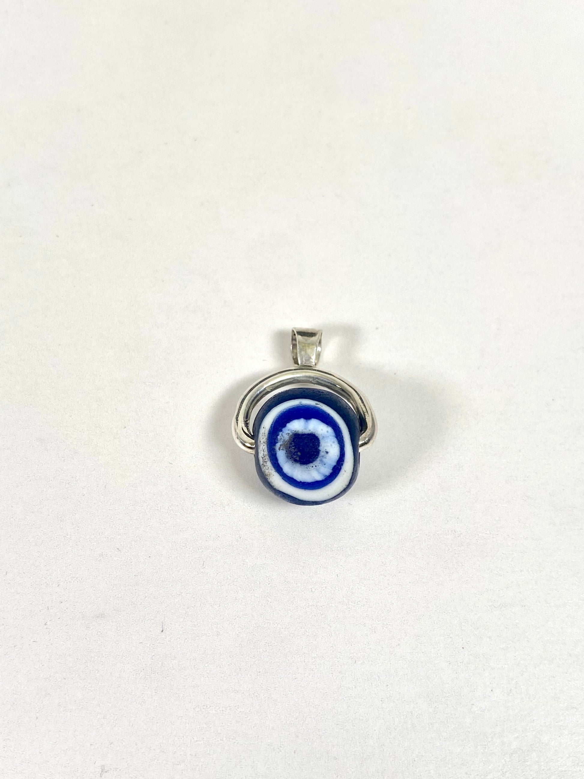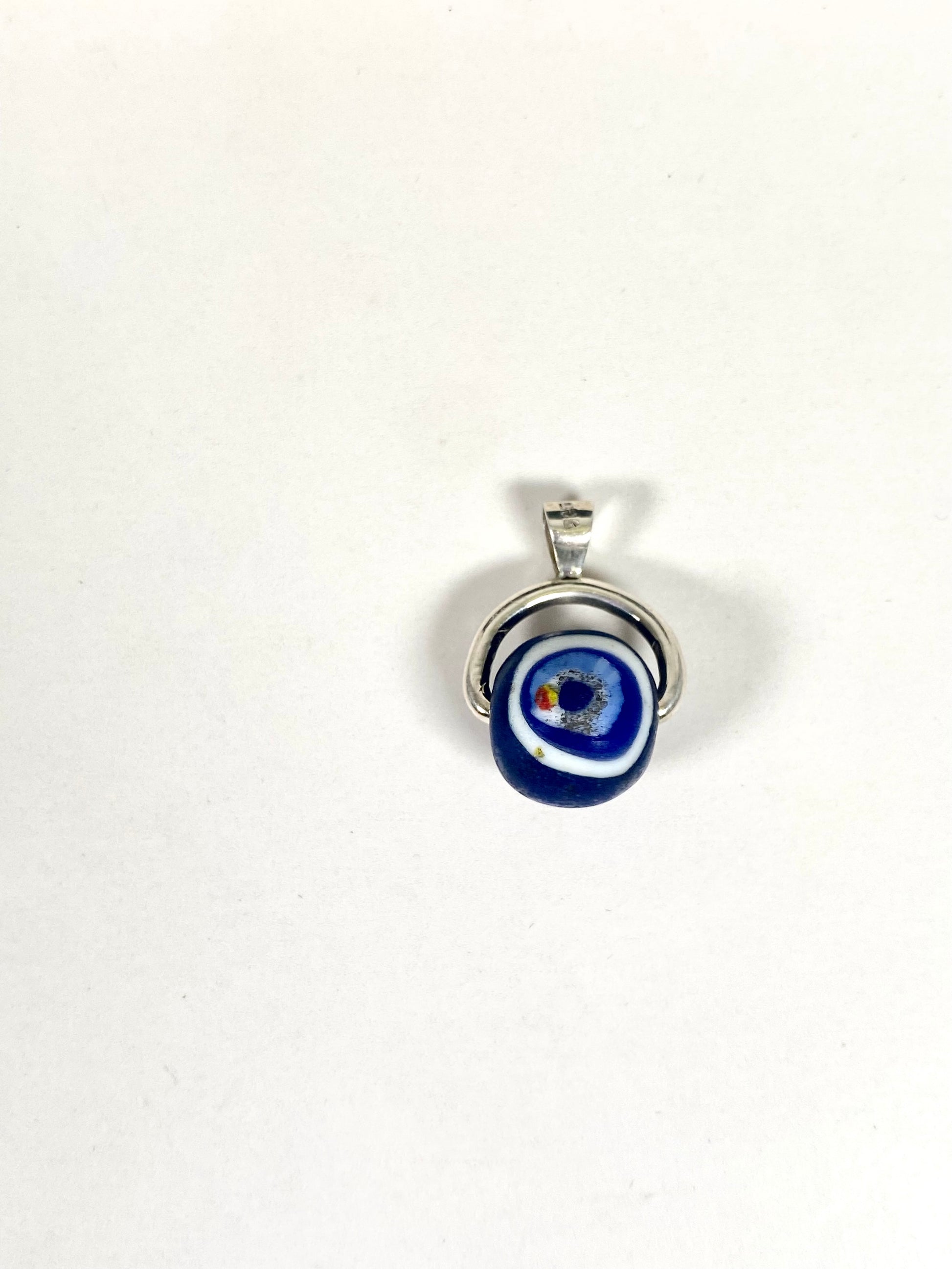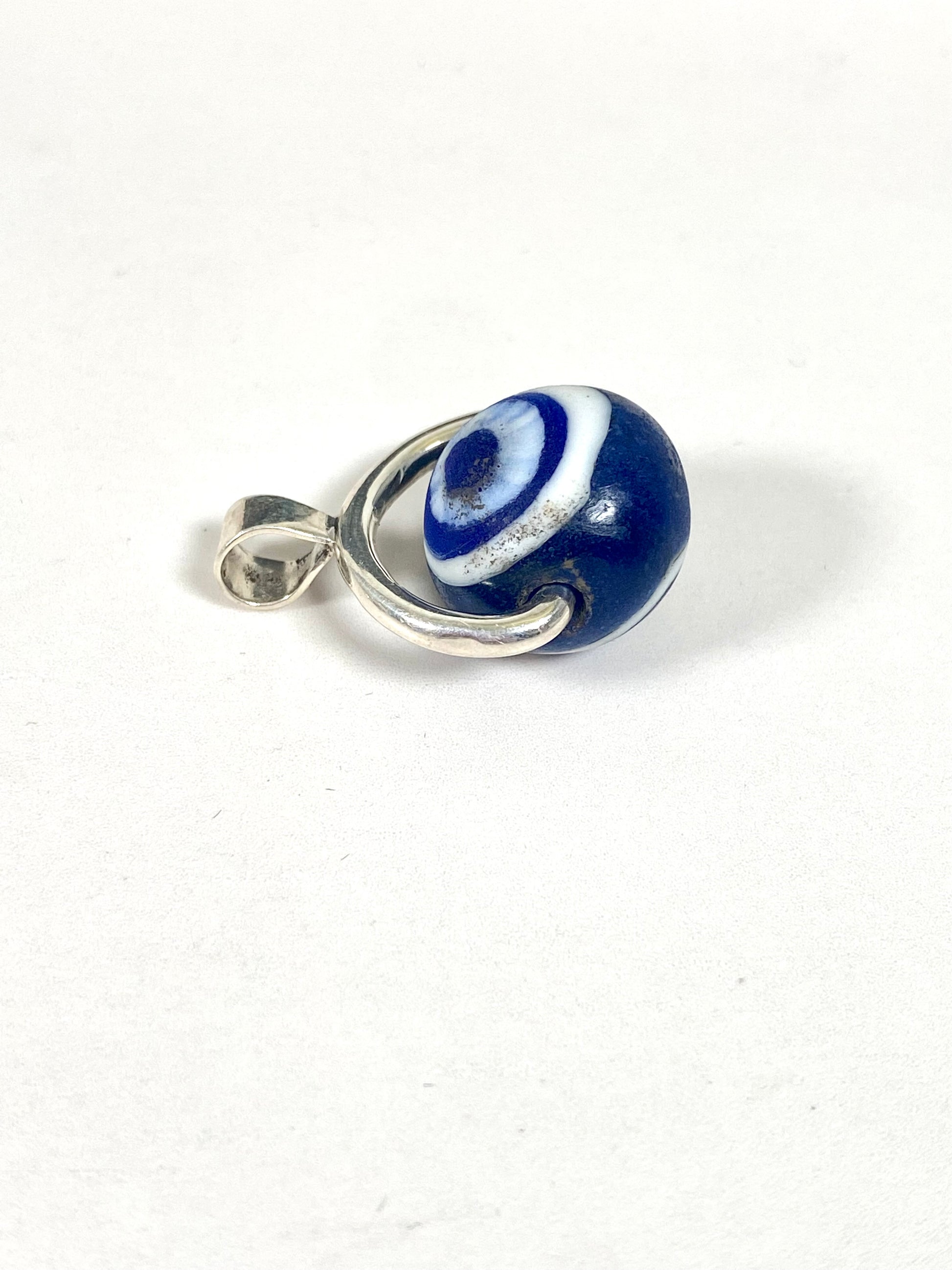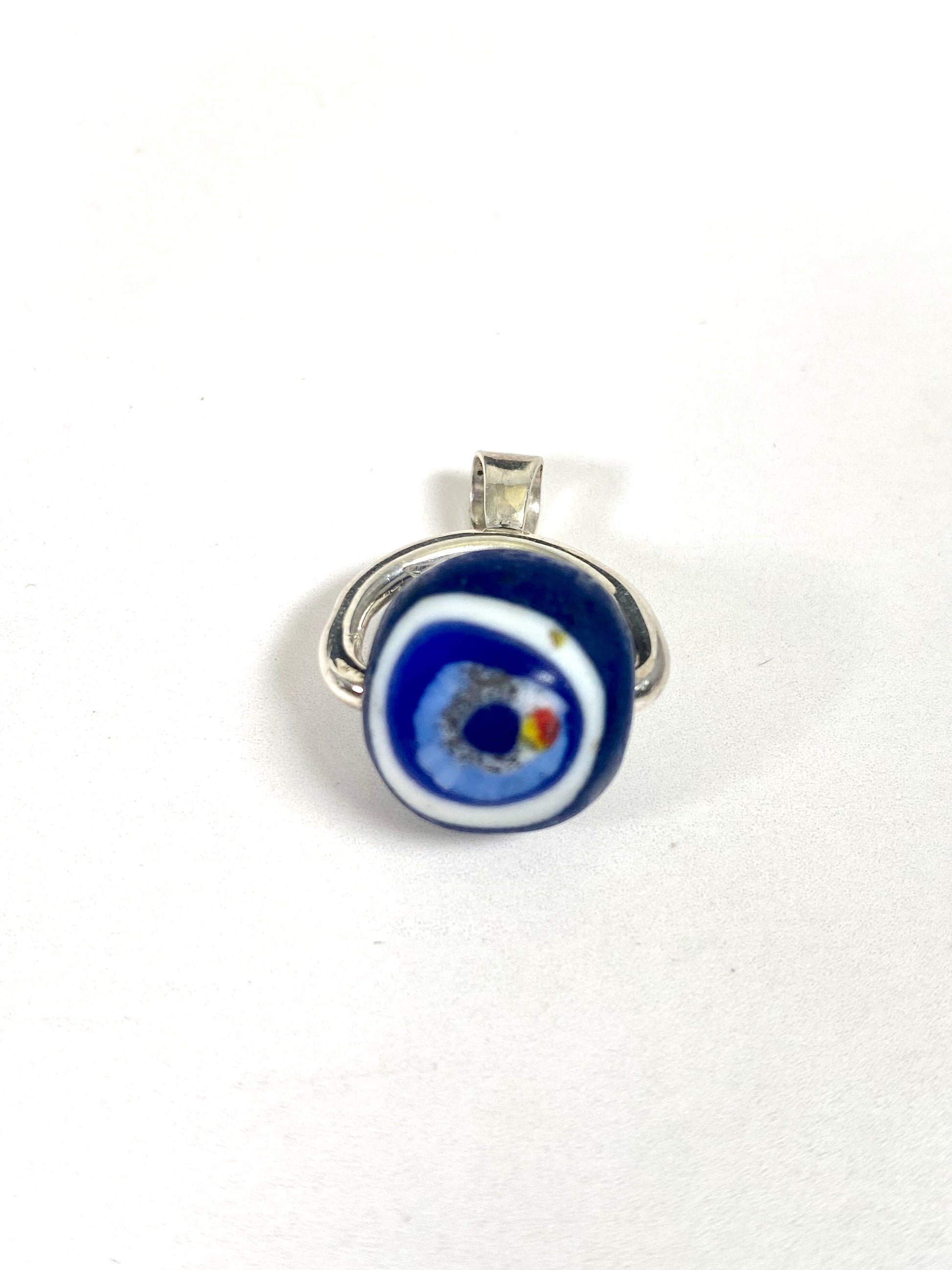 此特定列表是用于旋转表链吊坠的,其特色是带有白色和钴蓝色细节的眼珠。中央珠子有两个千花眼,每个部分都展示了独特的手工卷制特征。这款吊坠的色彩深度特别美丽。镶嵌物为纯银,由我们的工匠团队定制,吊环上标有 925。