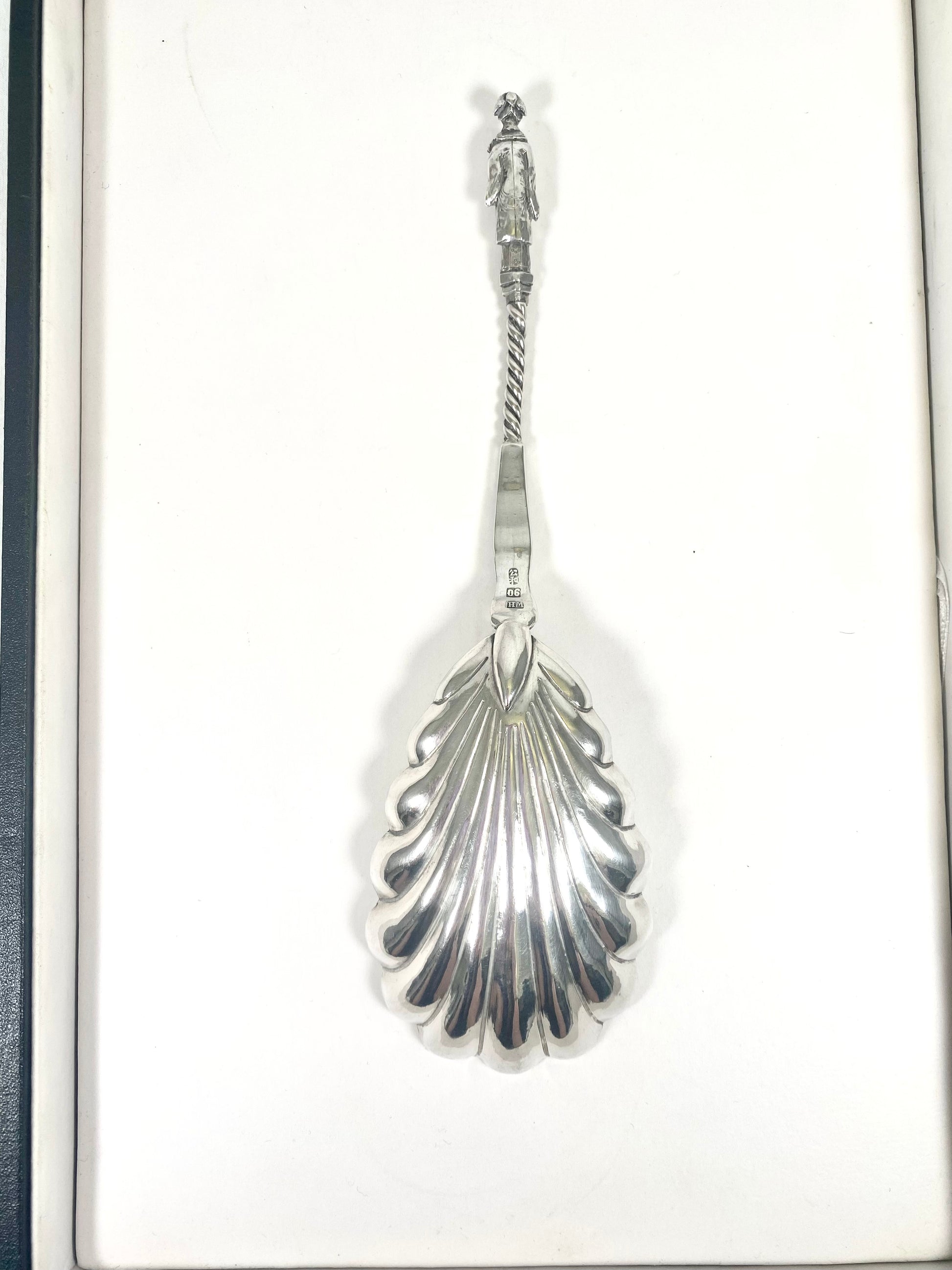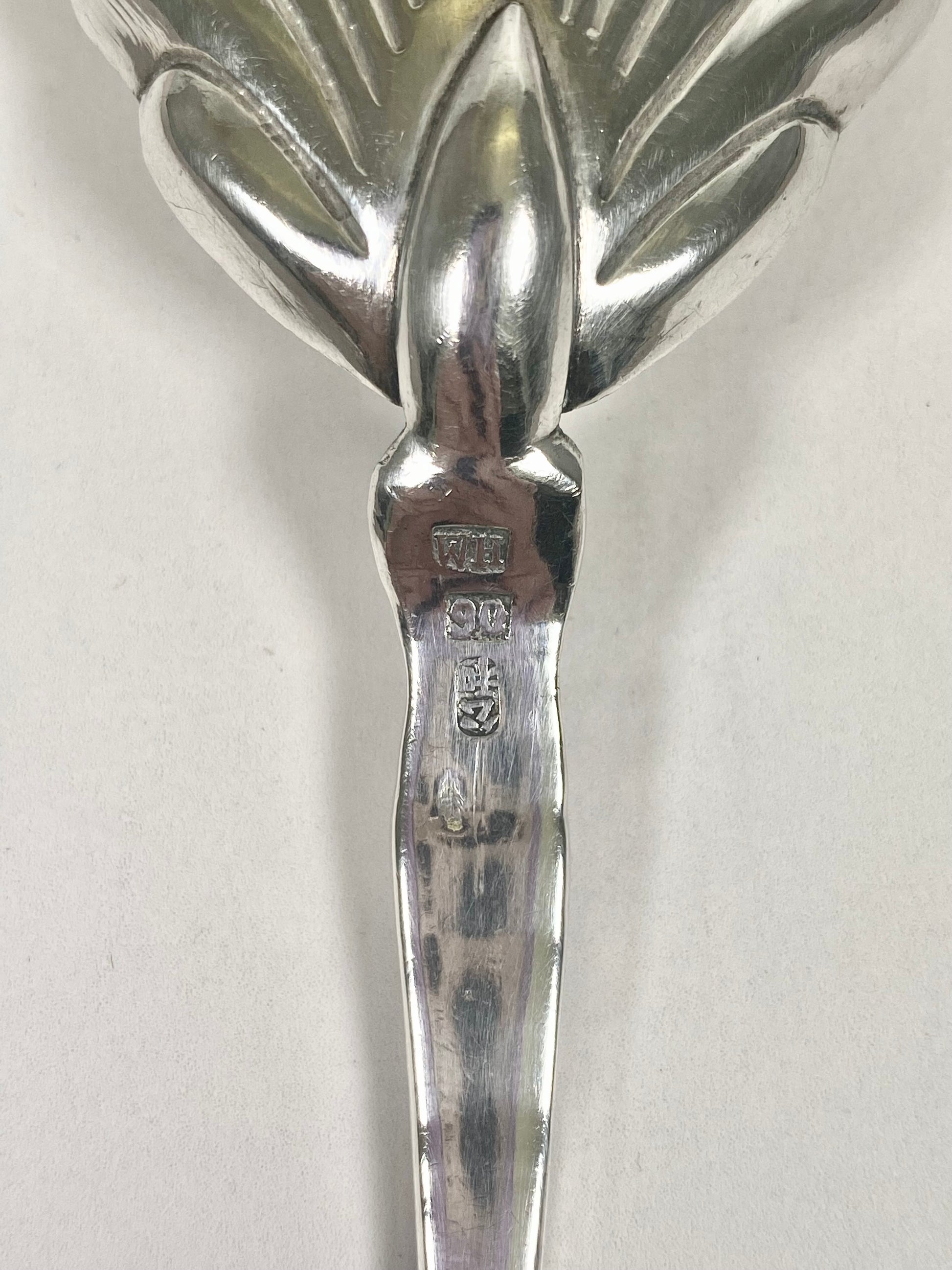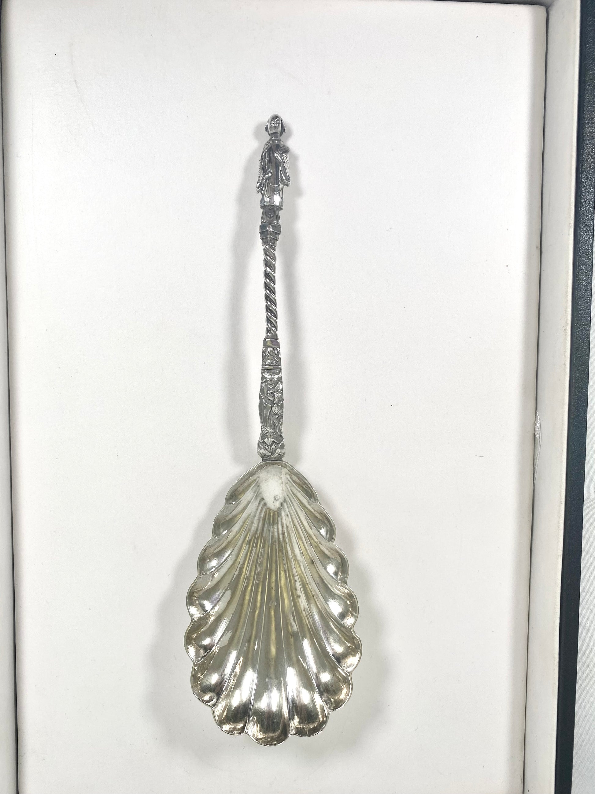 这是一件有趣的作品,与西方的使徒勺相似,但可能受到八仙等中国文化的启发,因为我们看到主要人物是一位妇女,手里拿着可能是一把扇子的东西,以及一个笑佛或罗汉在底座上。这件作品完美地融合了东方与西方的特色,这是中国外销银器所追求的,也是制造商标记的完美组合。