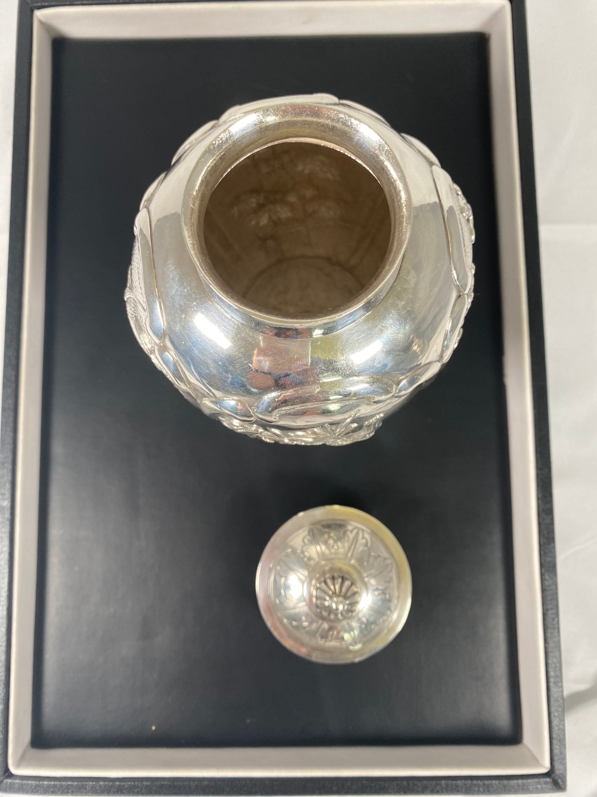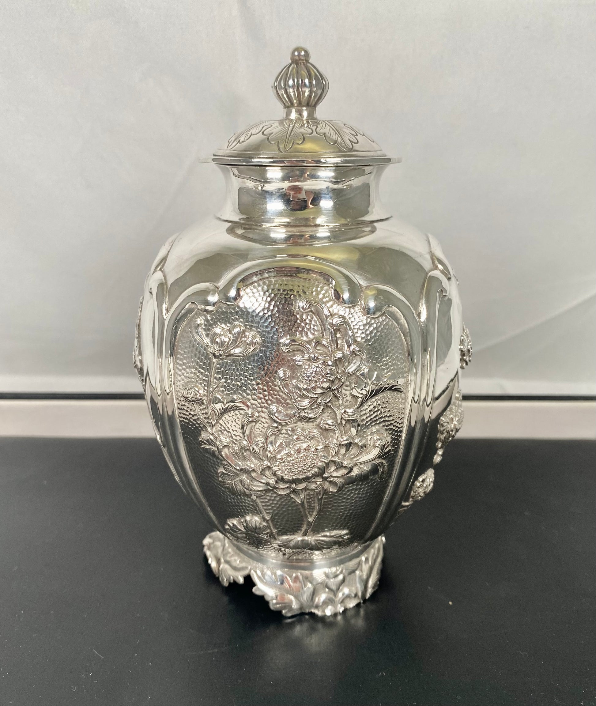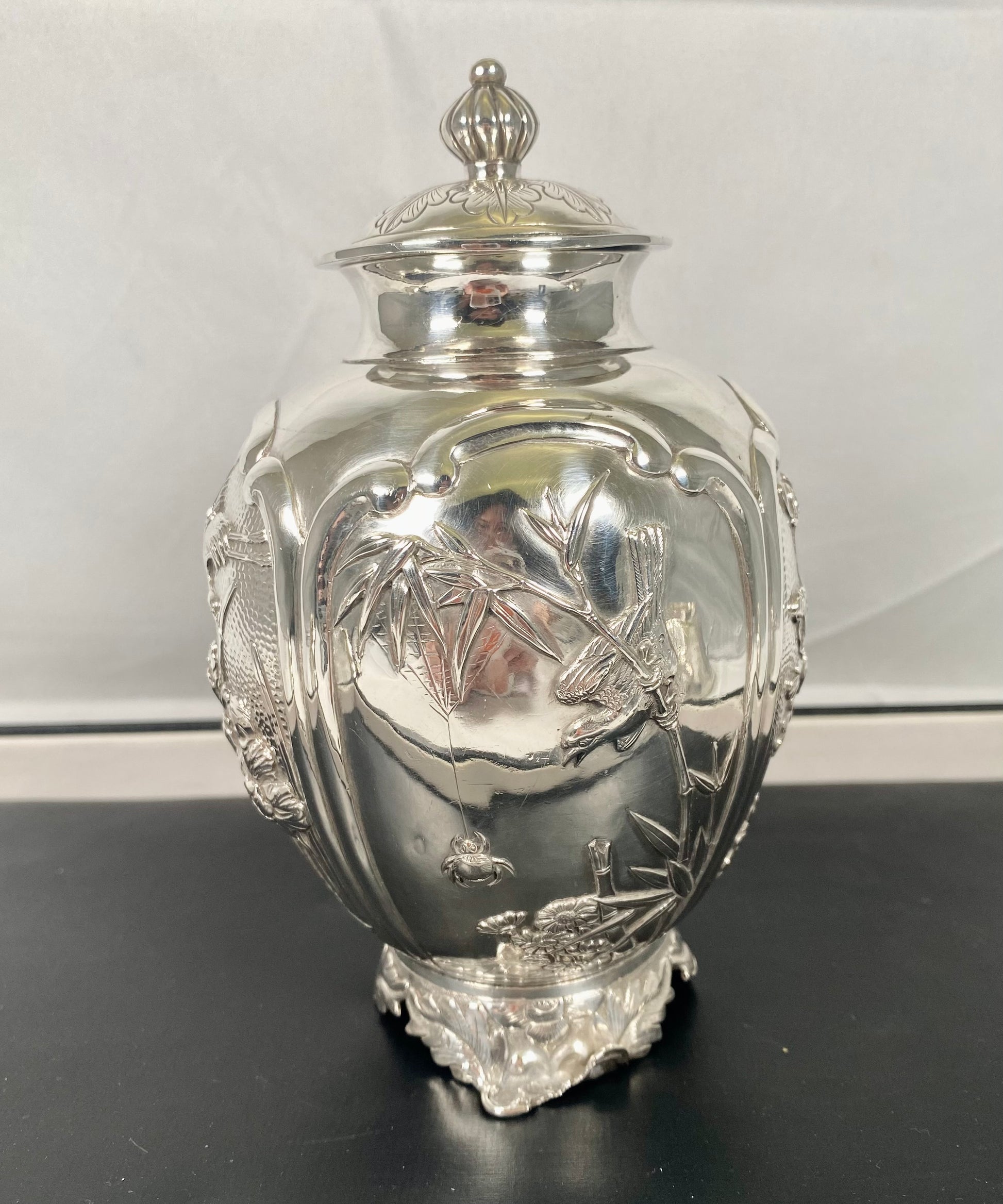 我们有一个非常可爱、非常罕见的中国古董银姜罐。它以美丽的浮雕工艺为特色,上面有植物图案,还有蜘蛛网和蝴蝶等昆虫图案,将中国传统的求爱图案与维多利亚时代的品味融为一体,同时展示了无可挑剔的银匠技术。