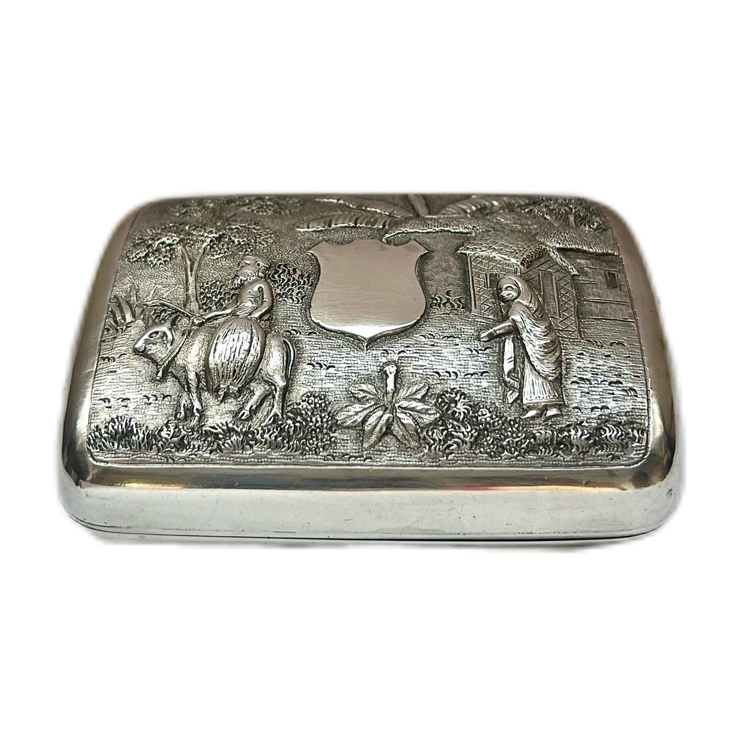 Beautiful Raj period Anglo-Indian Lucknow silver cigarette box, with gilt interior. Beautiful repousse work to front and back of village scenes. Cartouche blank to front of cigarette box.