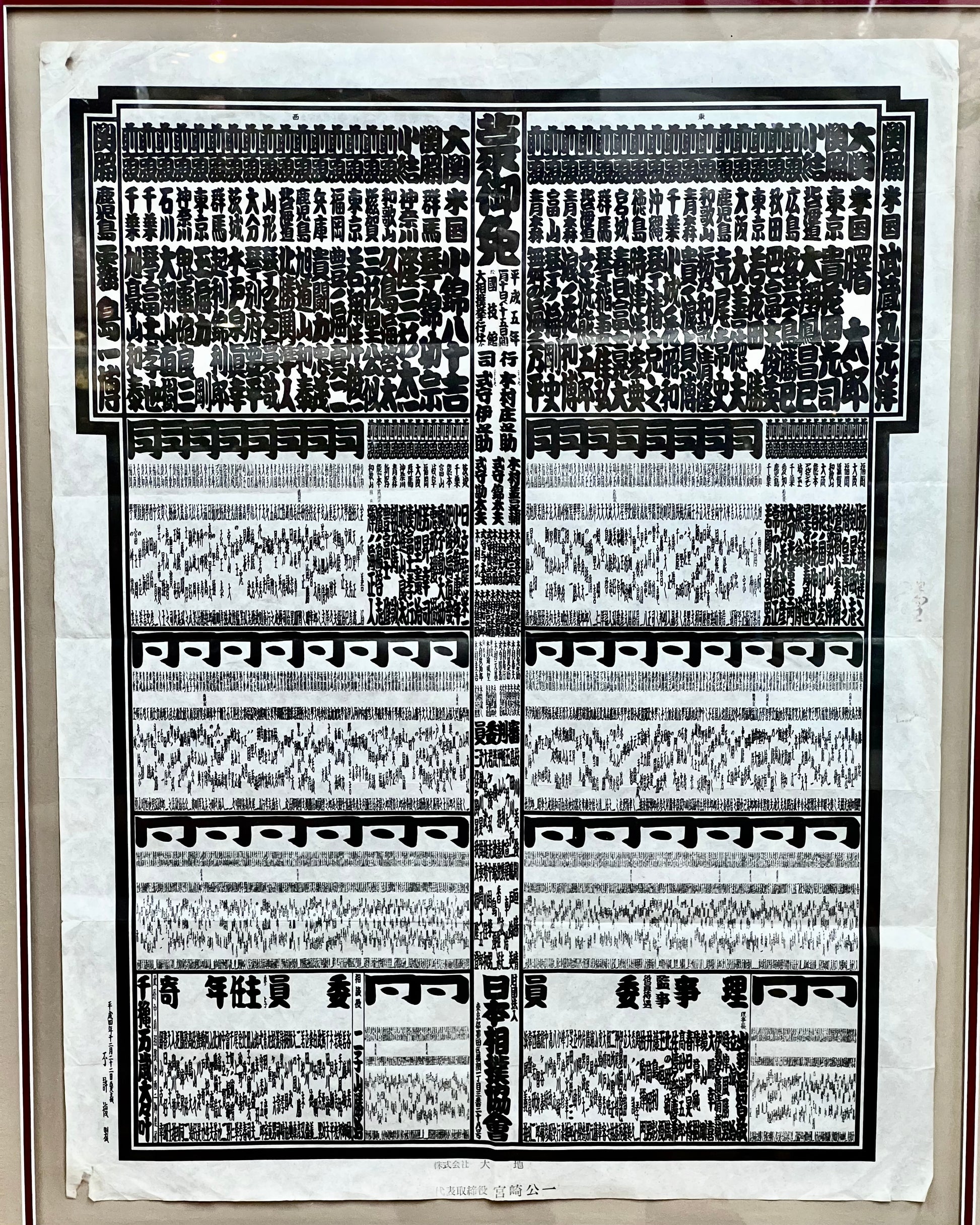 这里有一份精美的相框老式日本相扑大摔跤排名表或番付,由日本相扑协会于 1994 年制作。其中包括当时两位顶级相扑选手,雾岛和弘和夏威夷出生的利式武藏丸光洋。后者是历史上第二位达到受人尊敬的横纲最高级别的外国利式,1994 年是他第一次达到第二高的大关级别。