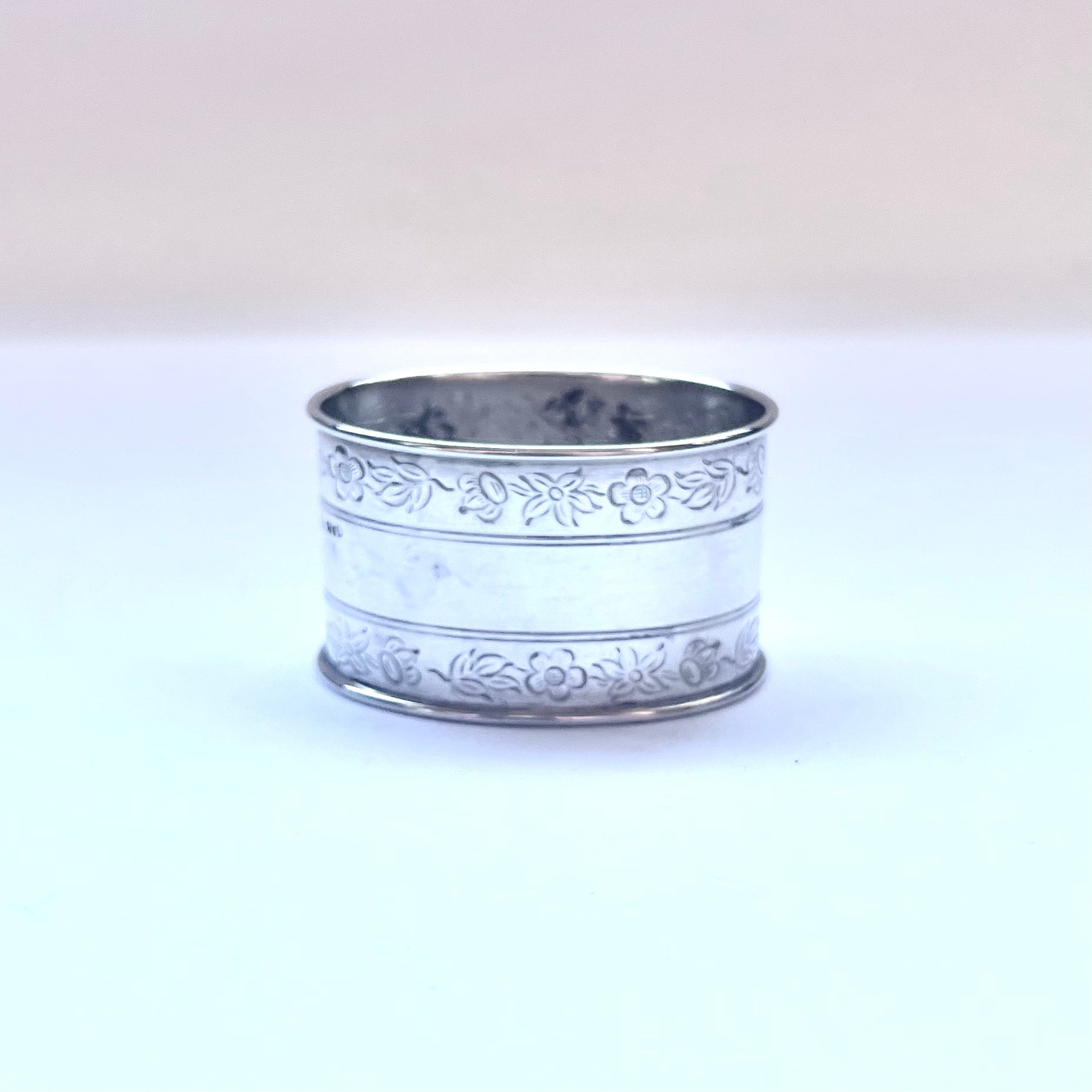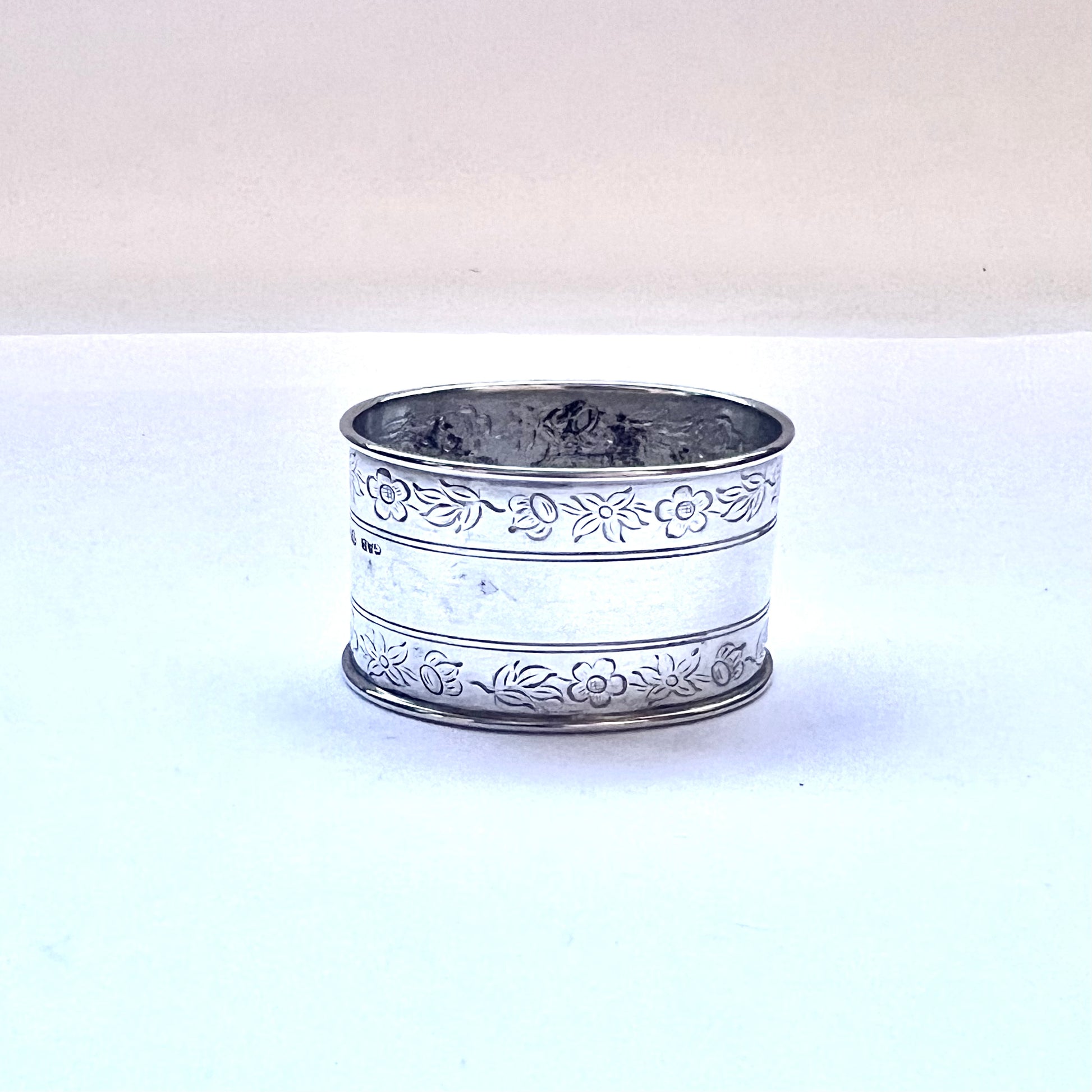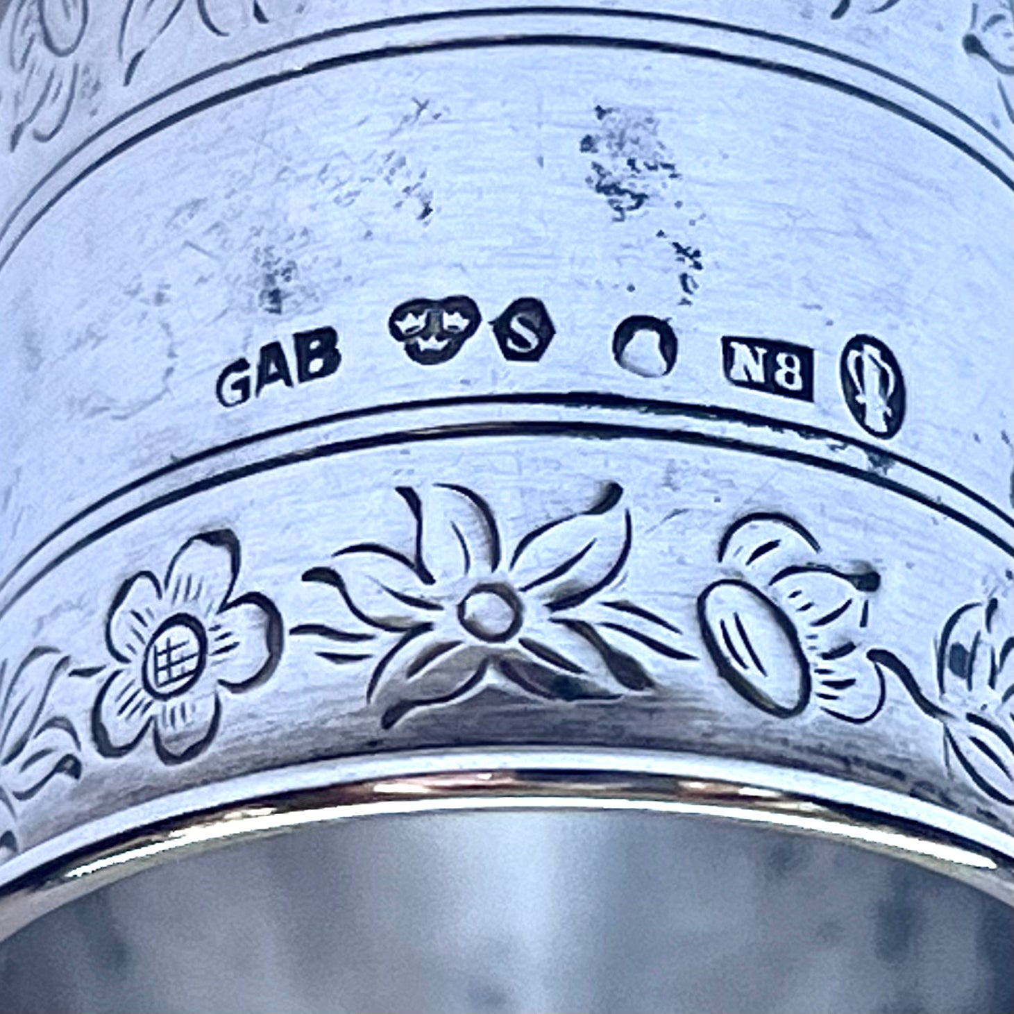可爱的瑞典复古 .800 银餐巾/餐巾环,日期代码为 N8(1939 年),带有蚀刻花卉图案,制造商标记 GAB(Guldsmeds Aktiebolaget (GAB)),这是一家著名的银器制造和零售公司,成立于 1867 年。