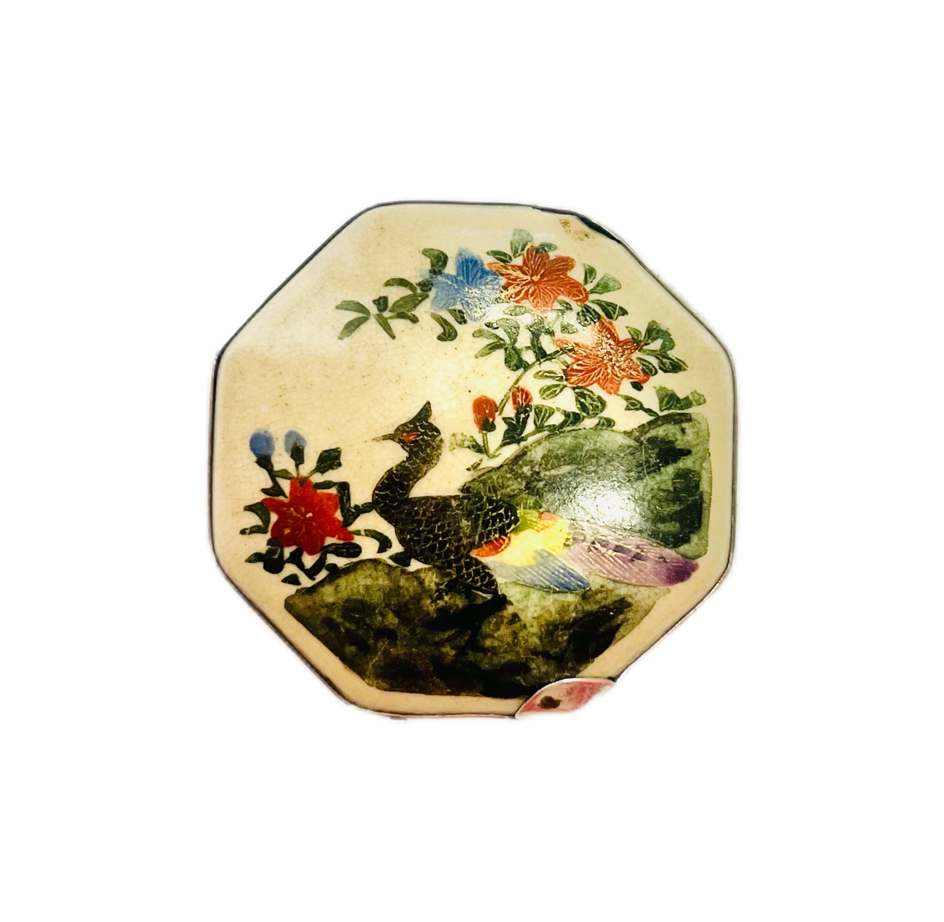 A gorgeous Japanese late Meiji to Taisho Period Satsuma brooch circa late 19th to early 20th century. Antique pin with C clasp, possibly a conversion of the period from a clasp to brooch. Beautifully handpainted details including a iovely summer scene with a mountain pheasant central motif. Set in an unmarked silver frame, this is handpainted “九三” for Kuzan to the back.