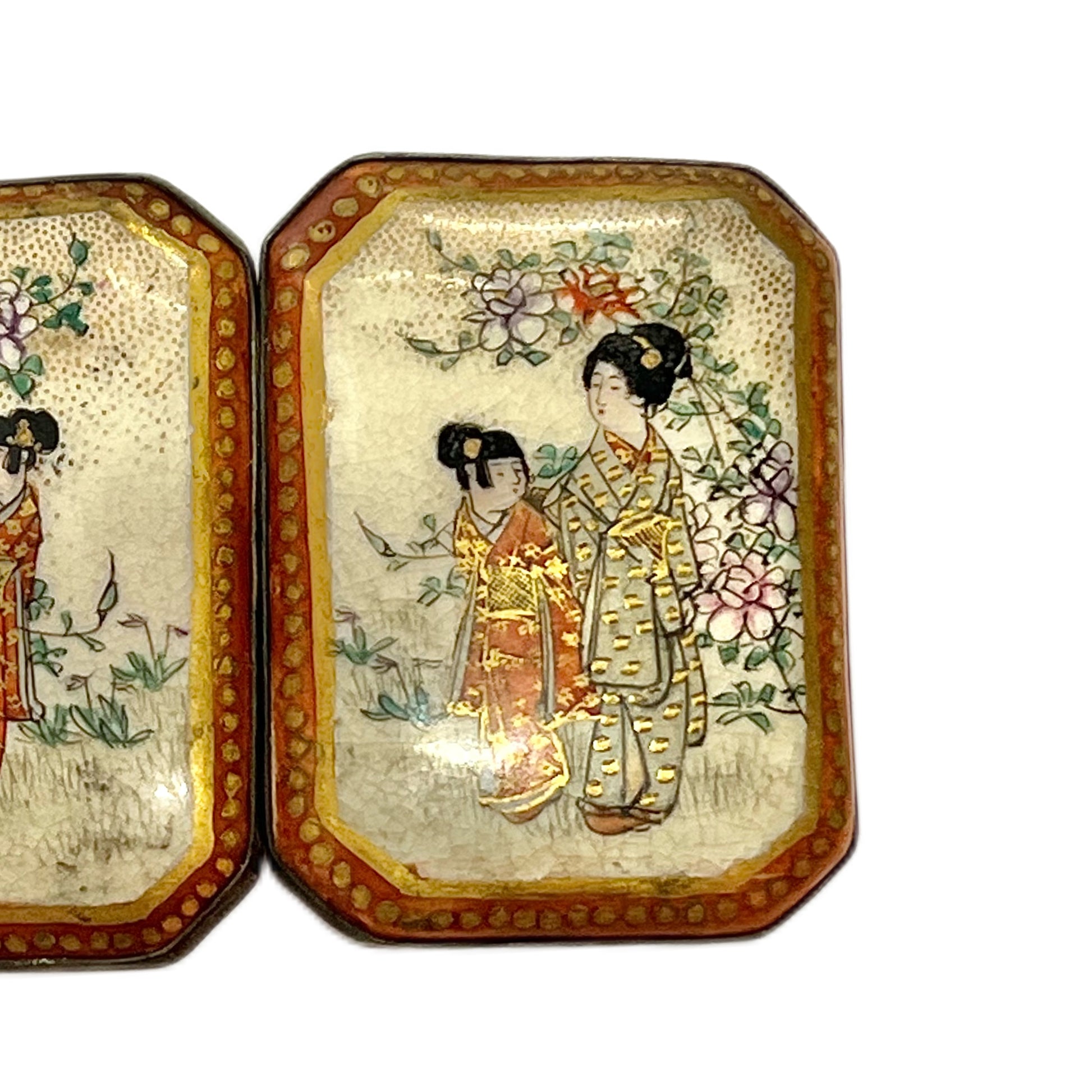 一对精美的长方形日本萨摩烧皮带扣,年代约为19世纪末至20世纪初,属于明治末期至大正时期。皮带扣饰有精美的手绘细节,包括鎏金和铁红色釉边,以及优雅的手绘艺伎图案。