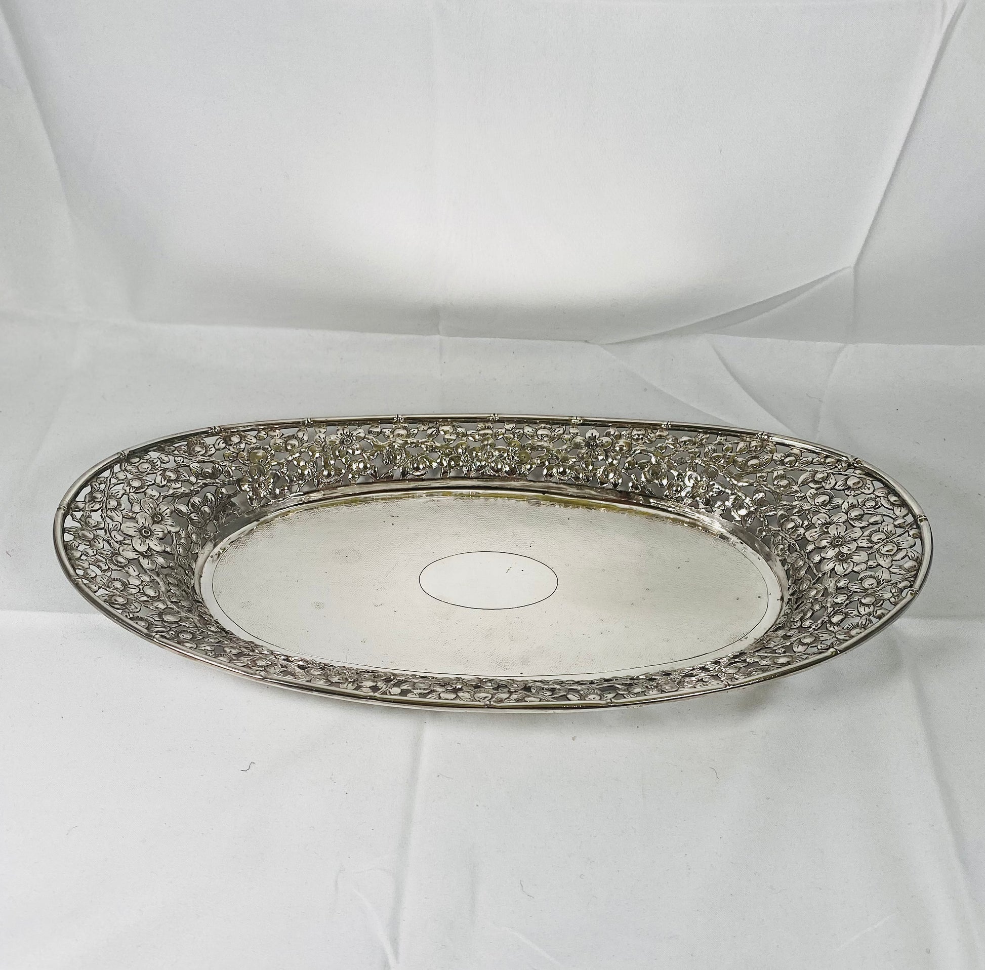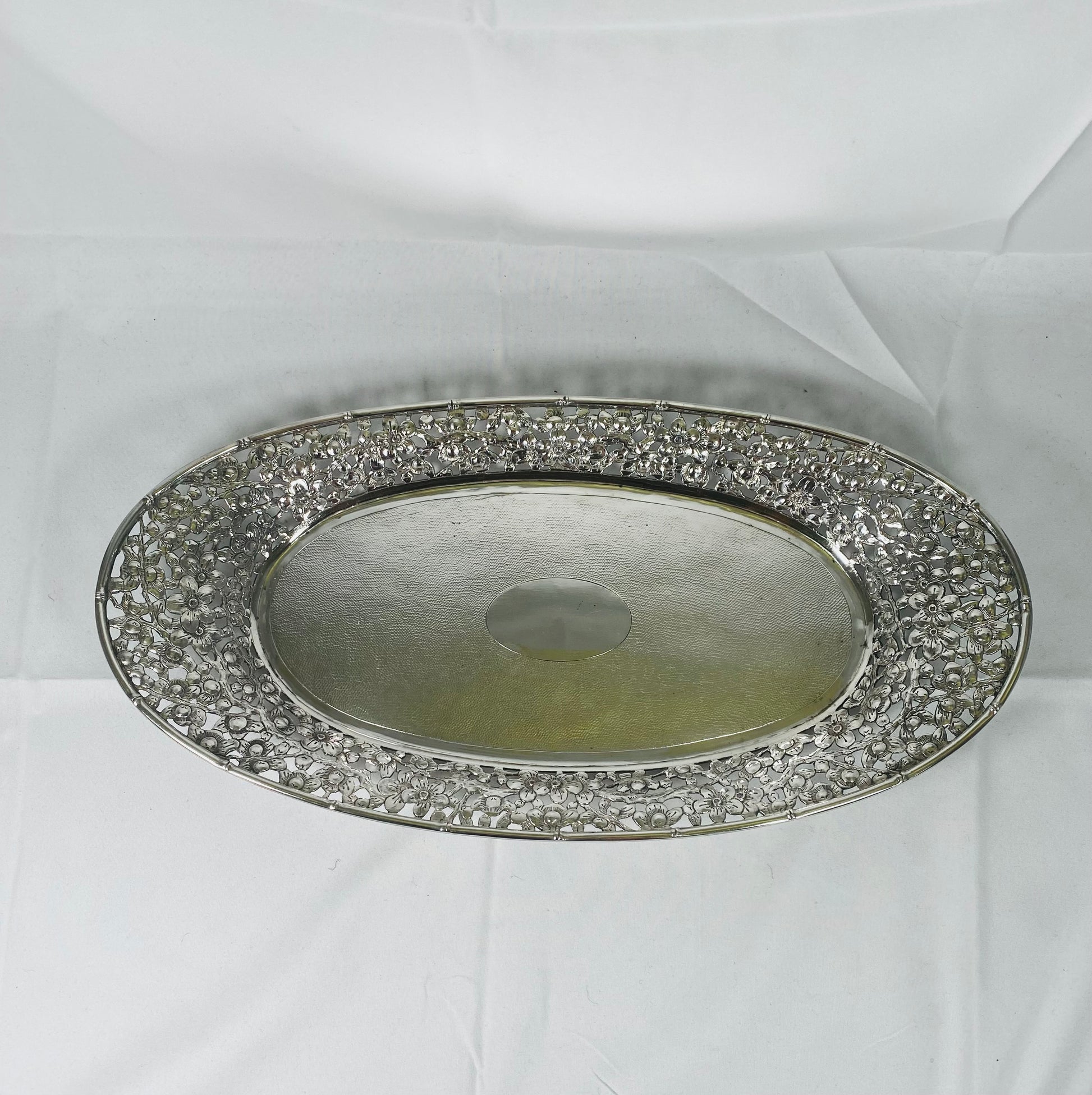 镂空中国出口银盘,饰有花卉图案和竹子图案边框。采用 .900 标准银制成,由 CJ Co.(代表中国珠宝公司)制造 该派于1880年至1940年间活跃于上海。