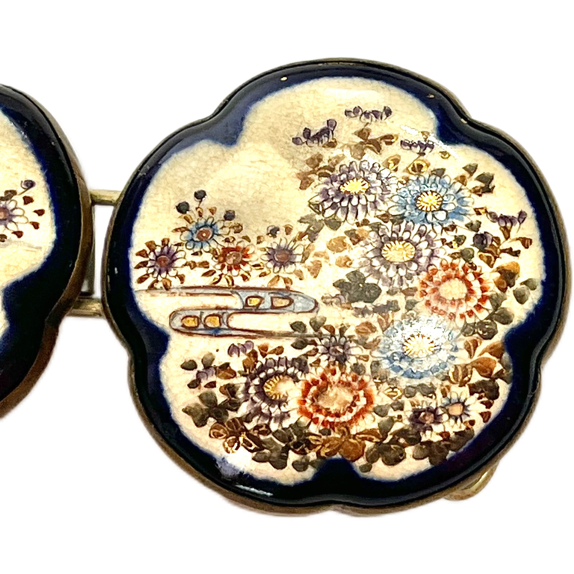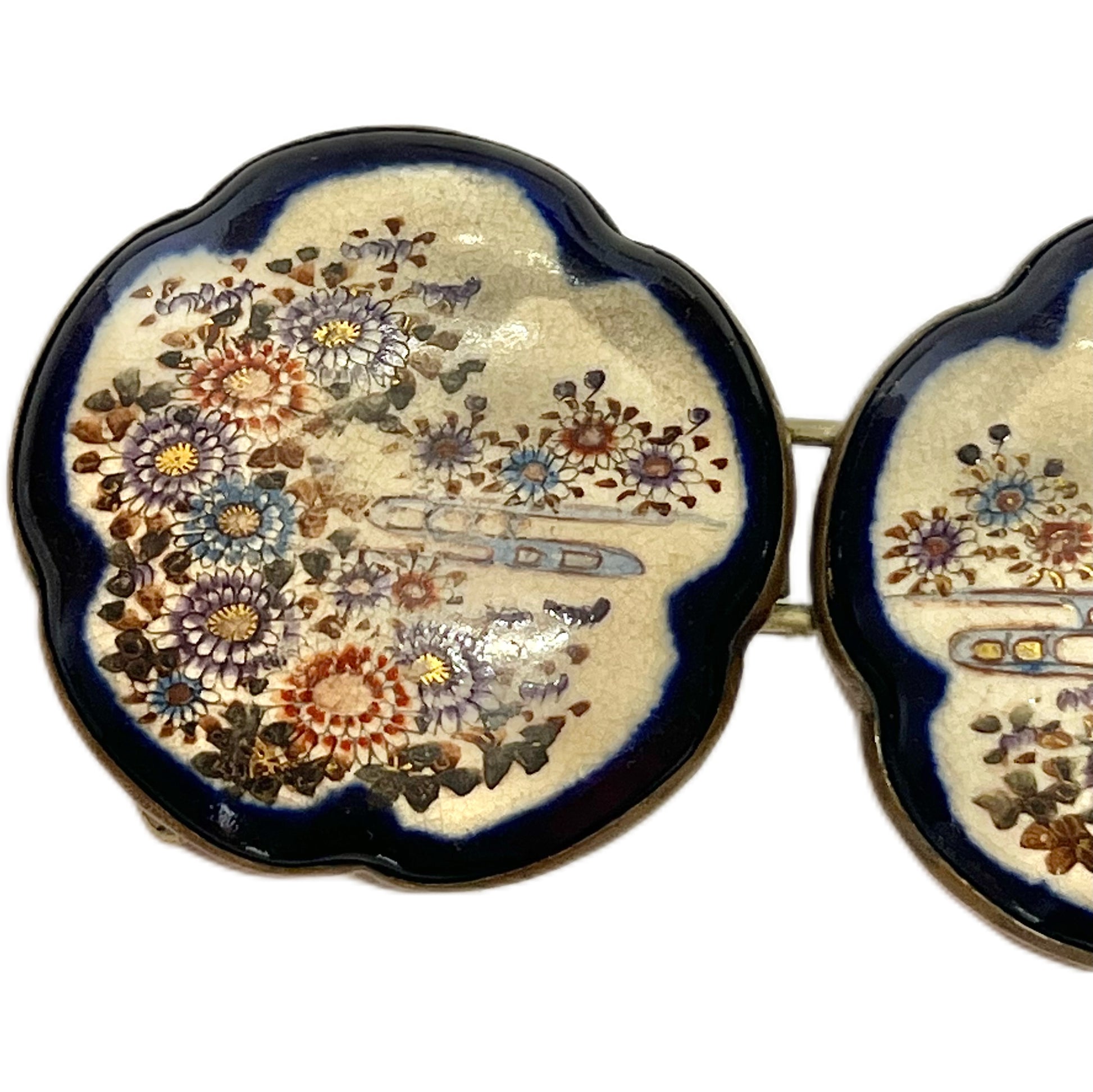 一对精美的日本萨摩烧花形皮带扣,年代约为19世纪末至20世纪初,制作于明治末期至大正时期。皮带扣饰有精美的手绘细节,包括钴蓝色边饰和错综复杂的图案。