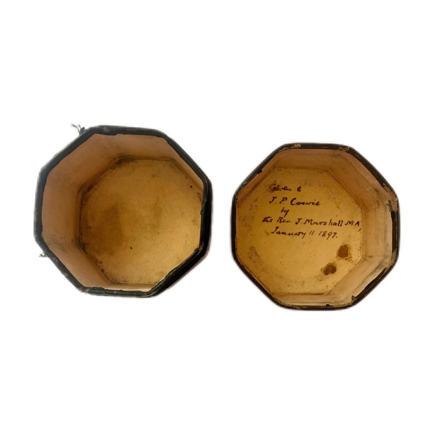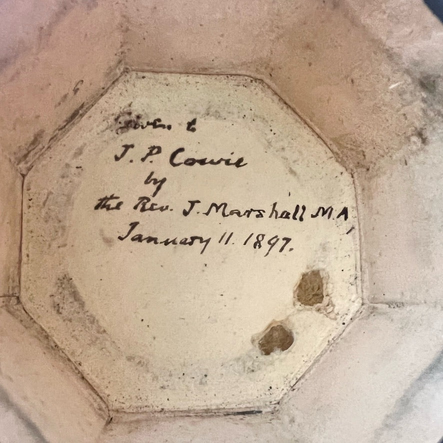 这件保存如此完好的袖珍洗礼盆极为罕见,其哥特复兴式风格正是以前述教堂为原型。洗礼盆配有原装外壳,并刻有1897年的铭文,是一件珍贵而精美的藏品。铭文显示,此洗礼盆于1897年由J. Marshall牧师赠予J.P. Cowie先生;当时的史料记载,Cowie先生当时是新西兰菲尔丁一位成功的商人。