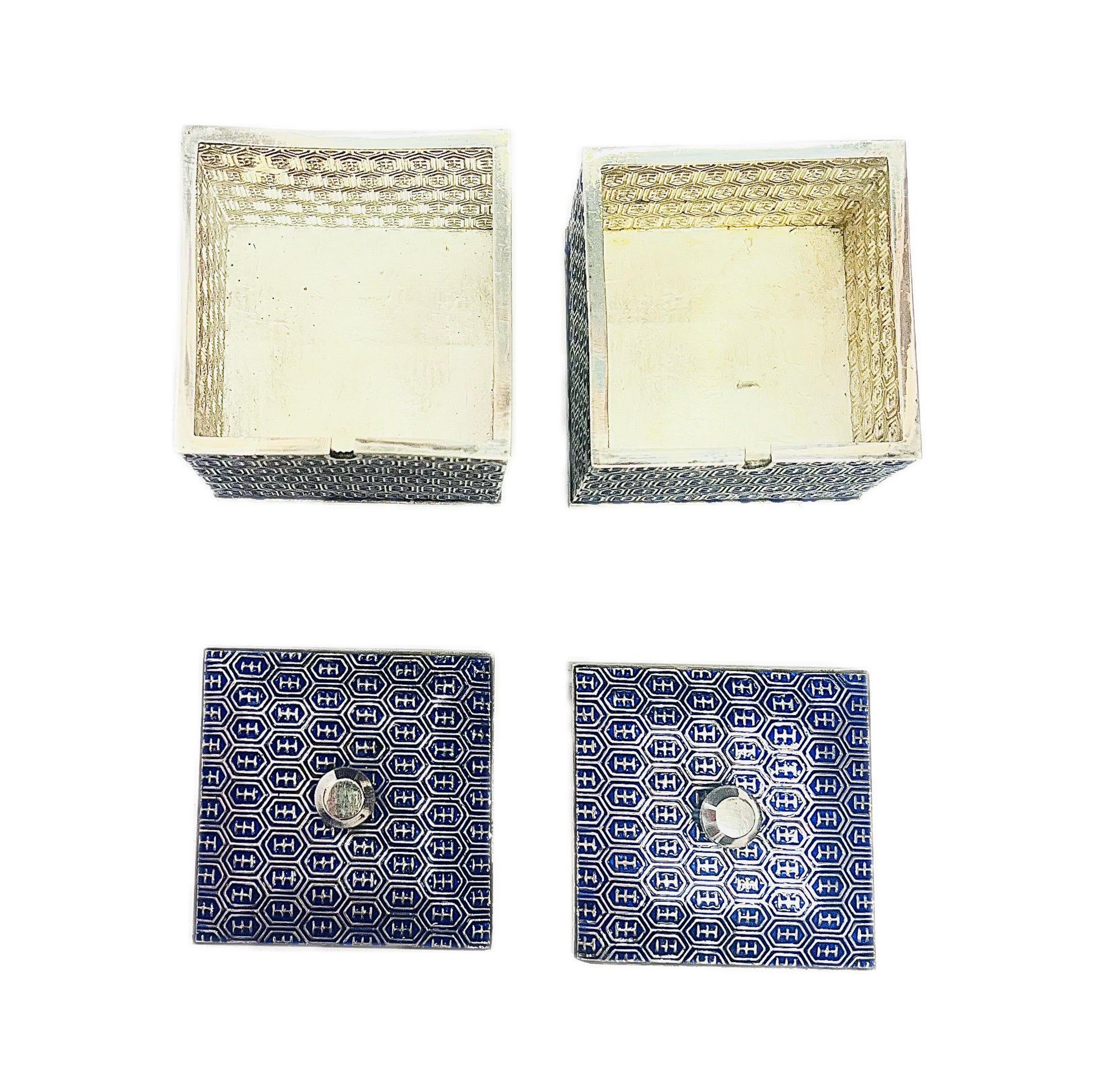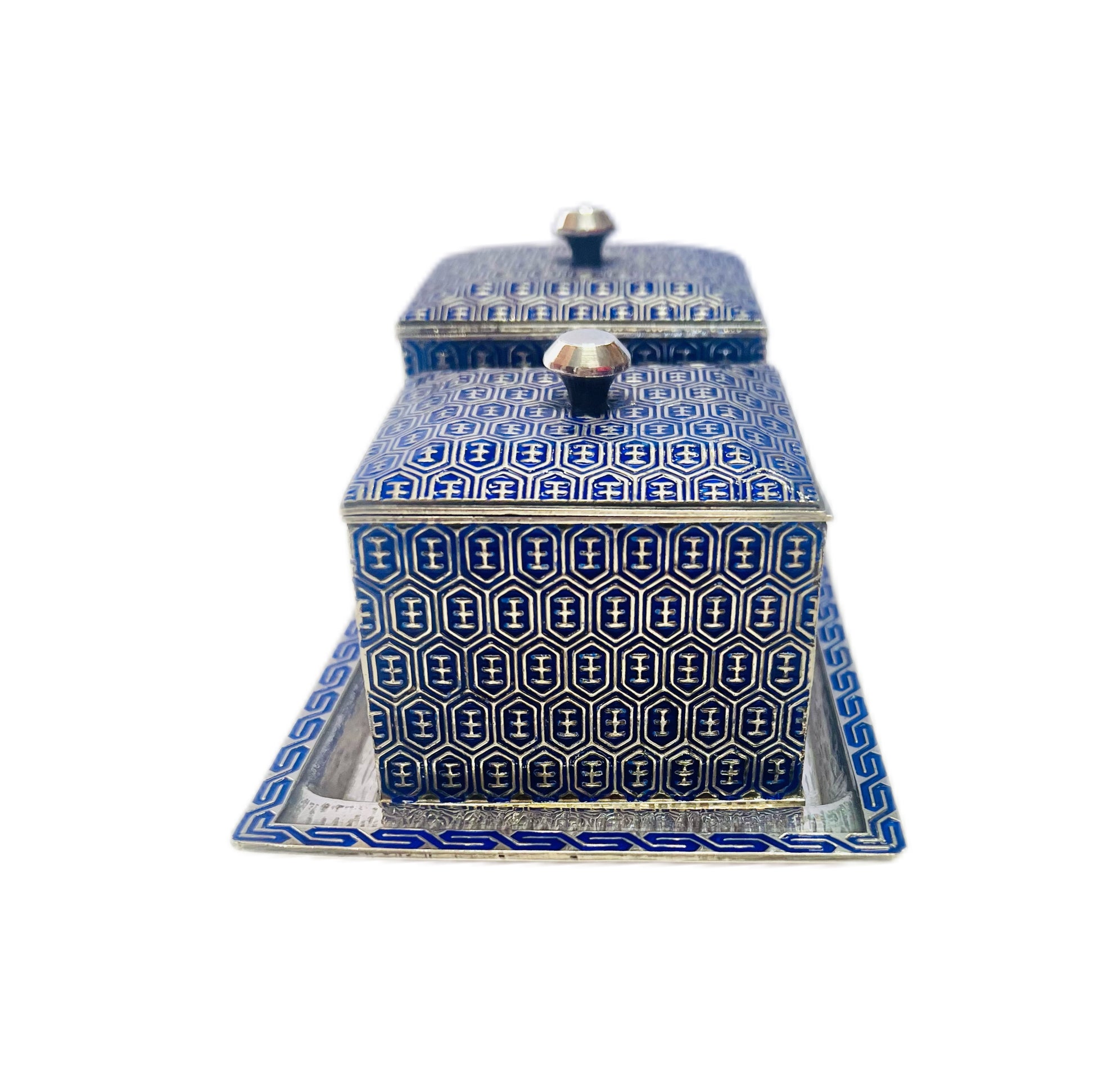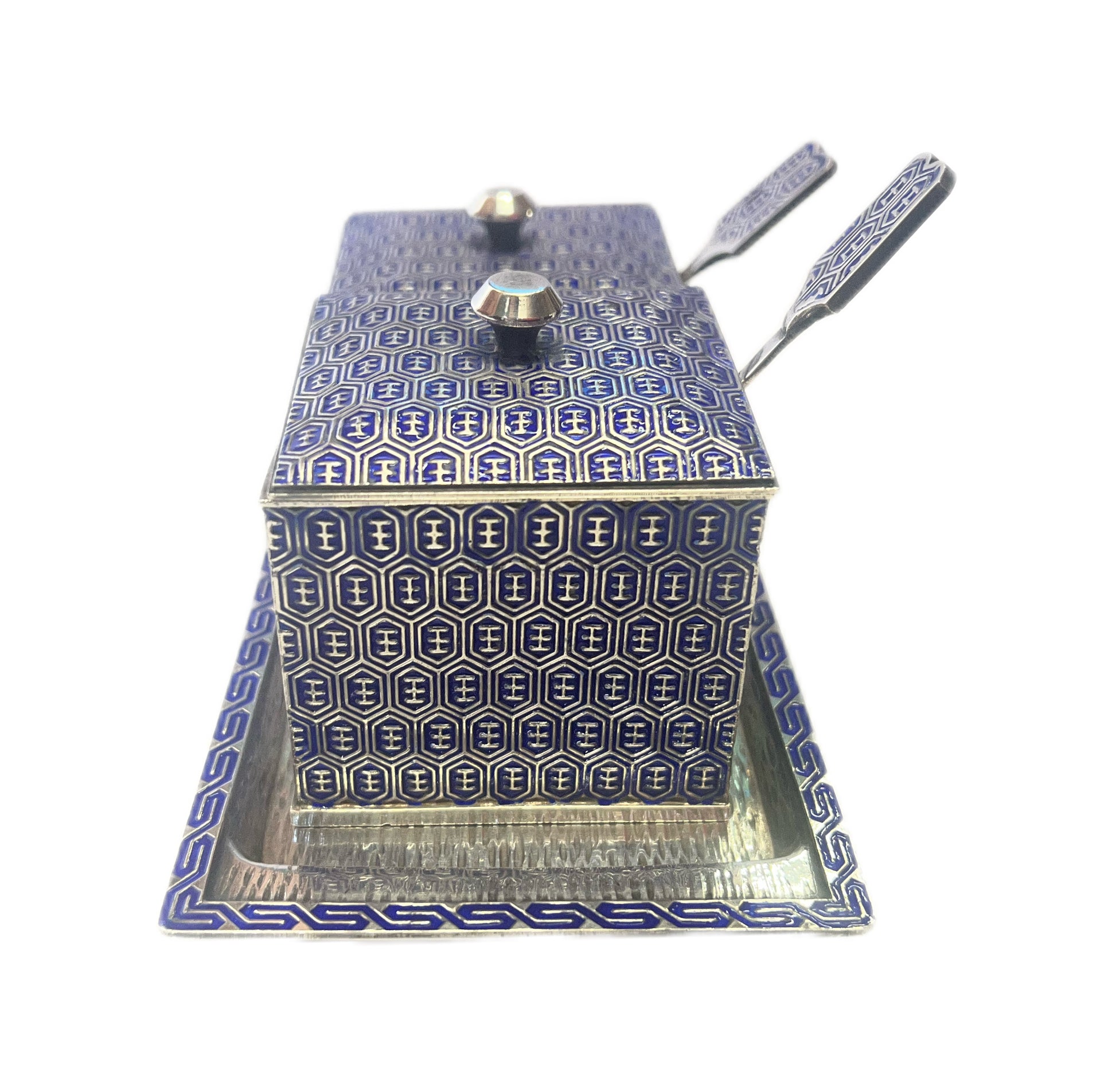 一套精美的韩国珐琅纯银调味品套装,约产于 20 世纪 60 年代,经标记和检测,银纯度为 99%。套装包含两个调味品罐、原装勺子和底托,全部由 99% 纯银制成。