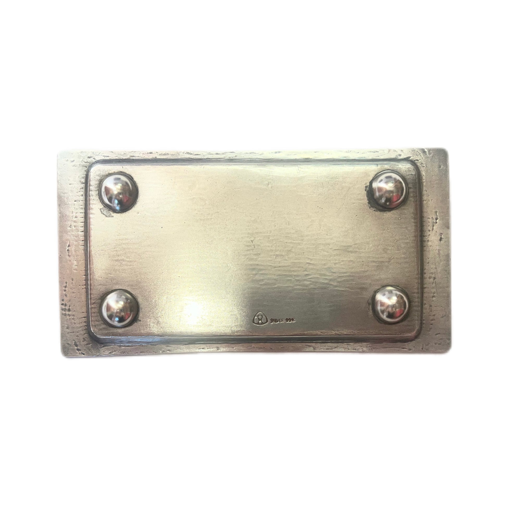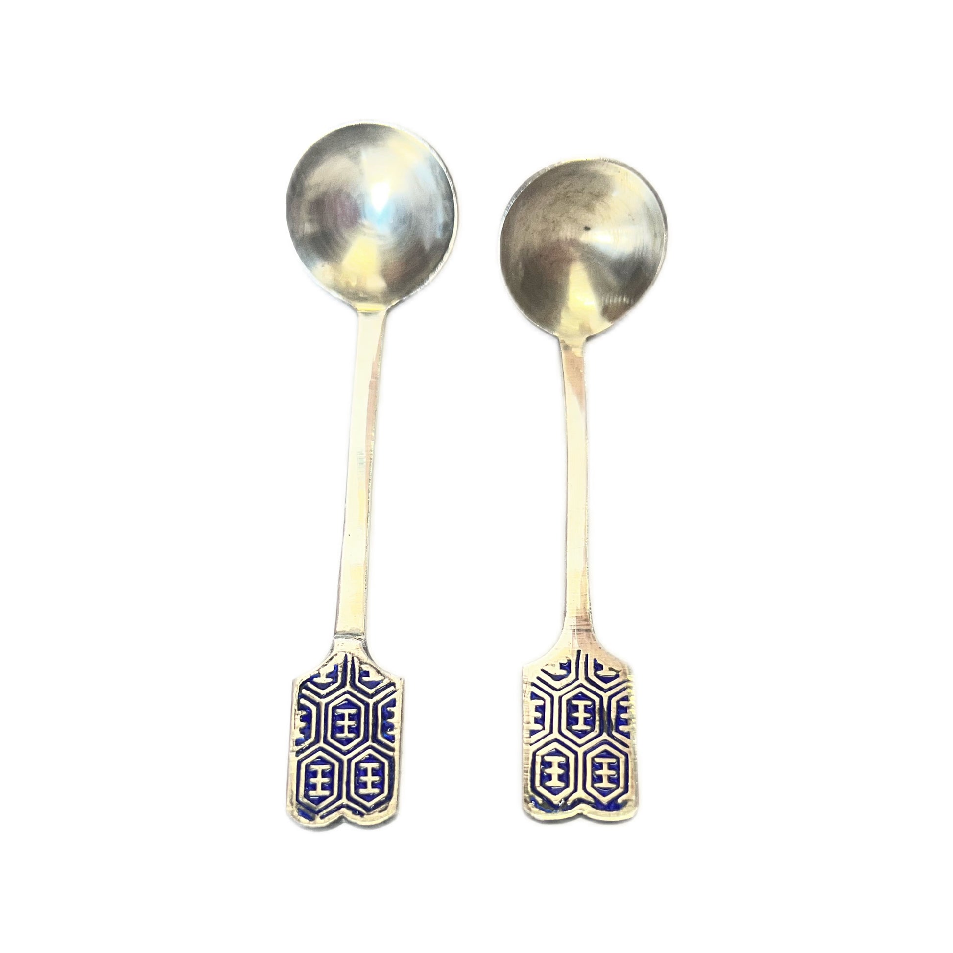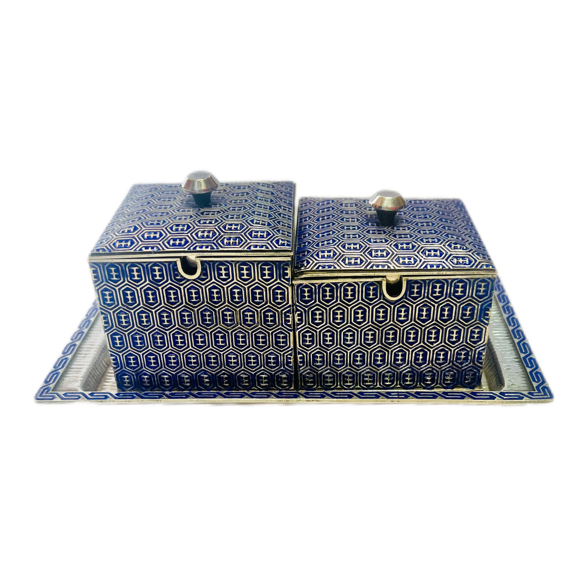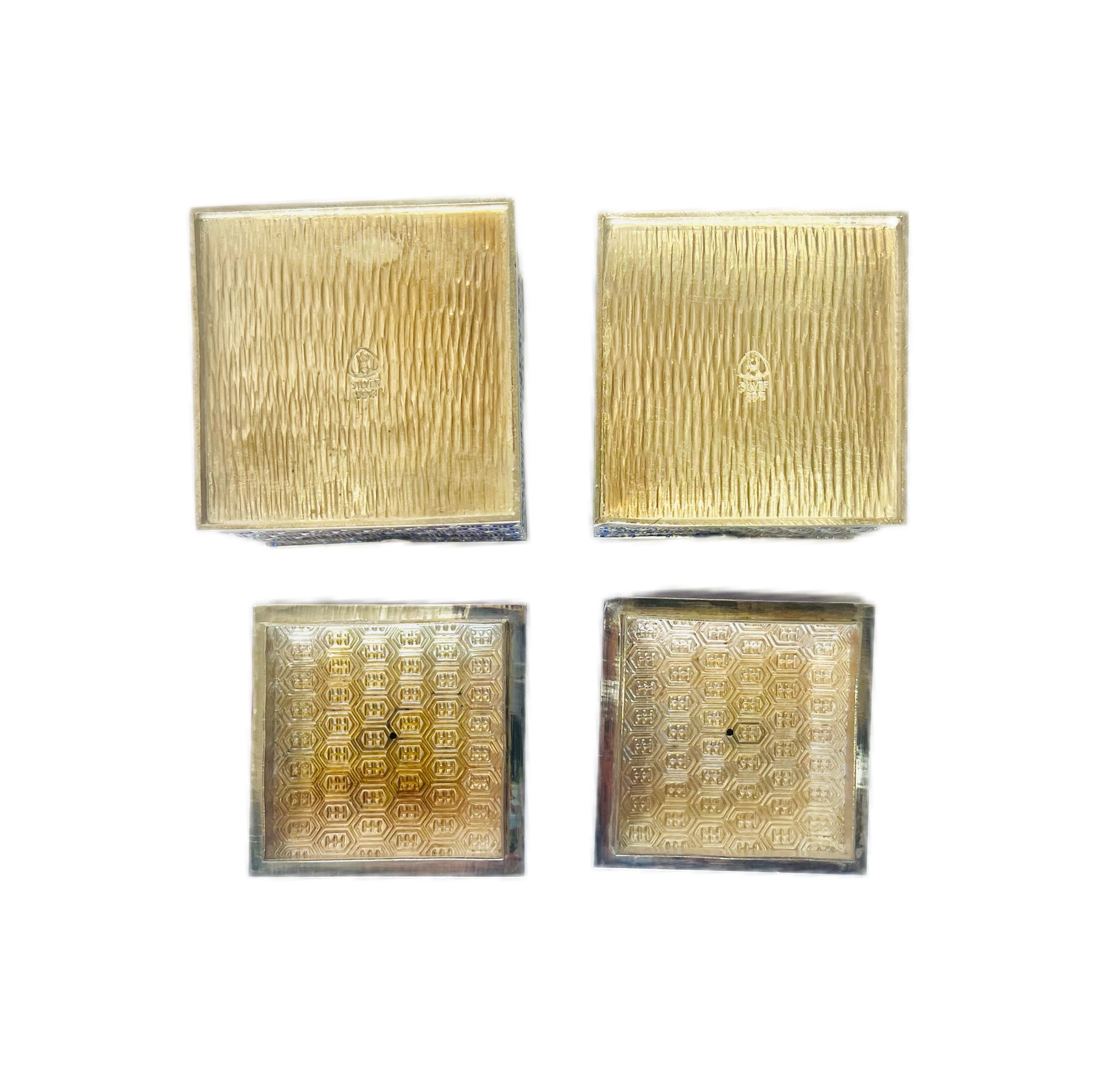一套精美的韩国珐琅纯银调味品套装,约产于 20 世纪 60 年代,经标记和检测,银纯度为 99%。套装包含两个调味品罐、原装勺子和底托,全部由 99% 纯银制成。
