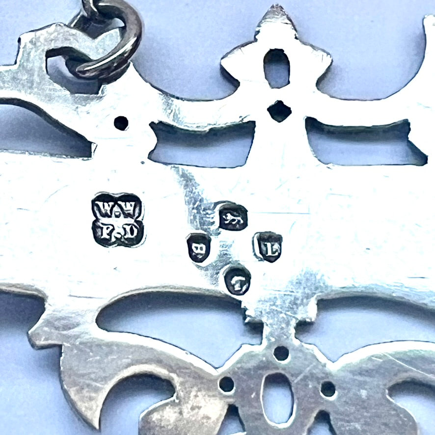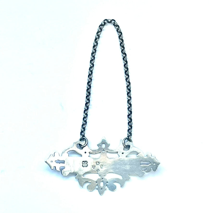 这里有一张令人惊叹的维多利亚晚期纯银酒票/酒瓶标签,上面印有 Wright & Davies 于 1886 年在伦敦制作的 Orange Bitters 酒的标记。制作精美,厚度适中,采用镂空设计和精细雕刻的图案;设计的曲率确保酒票可以牢固地贴合酒瓶的年份。