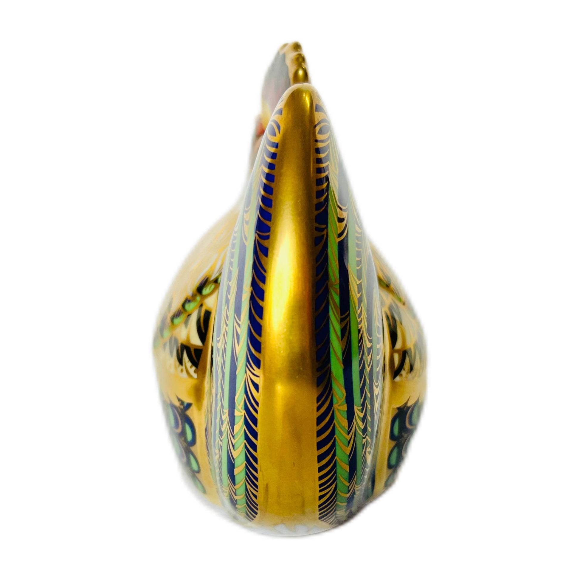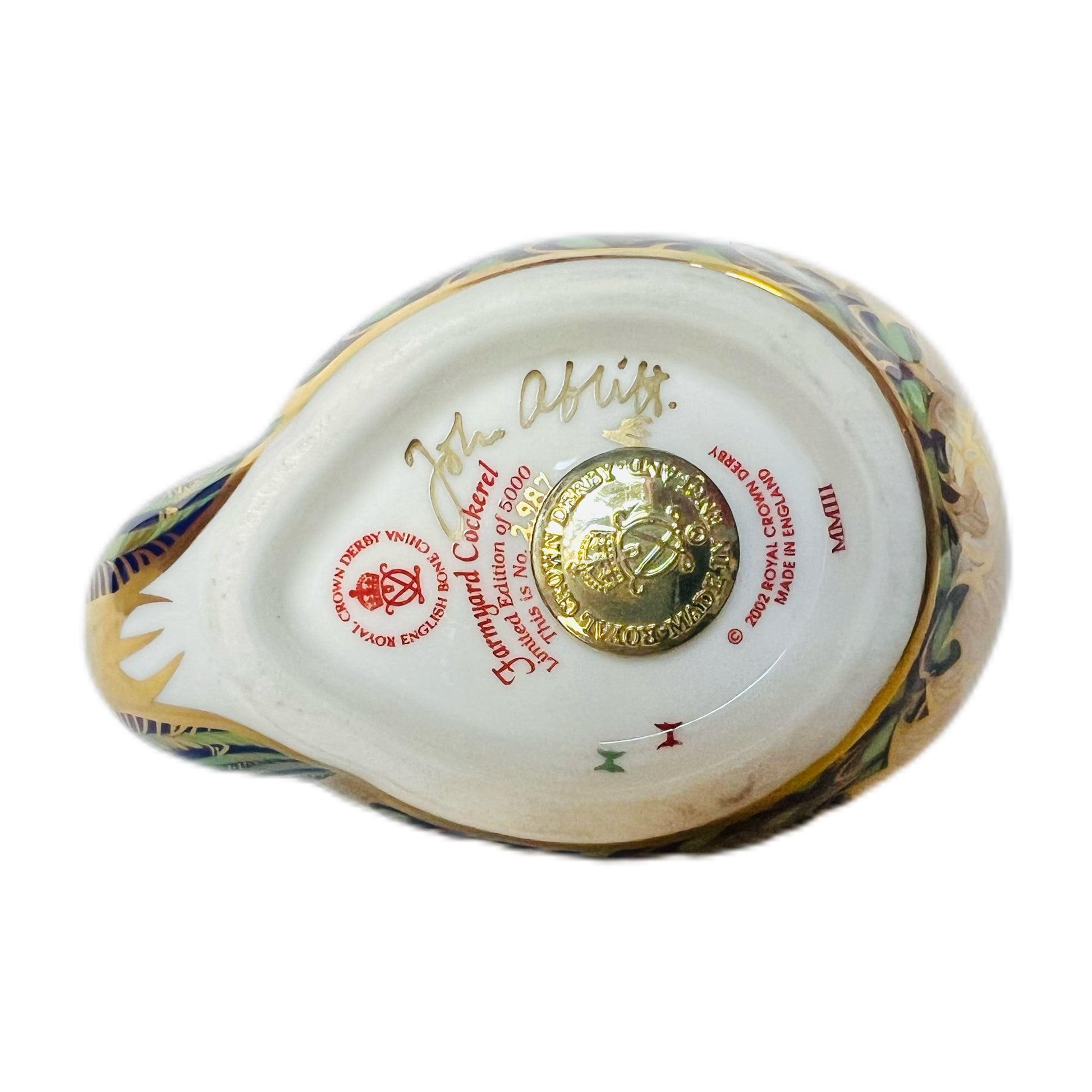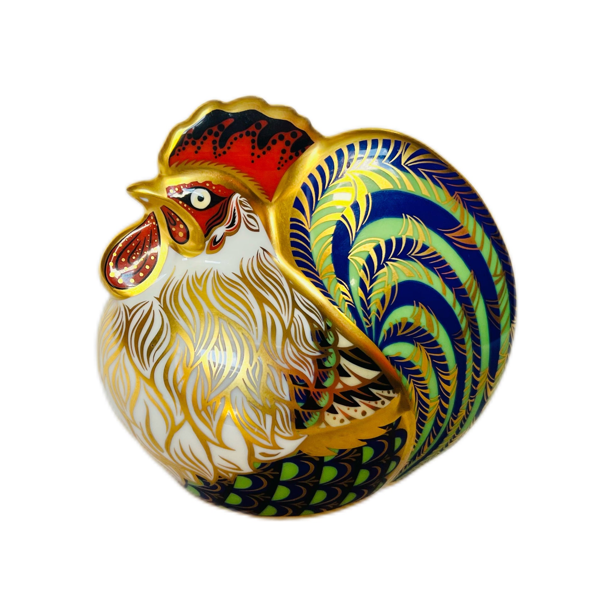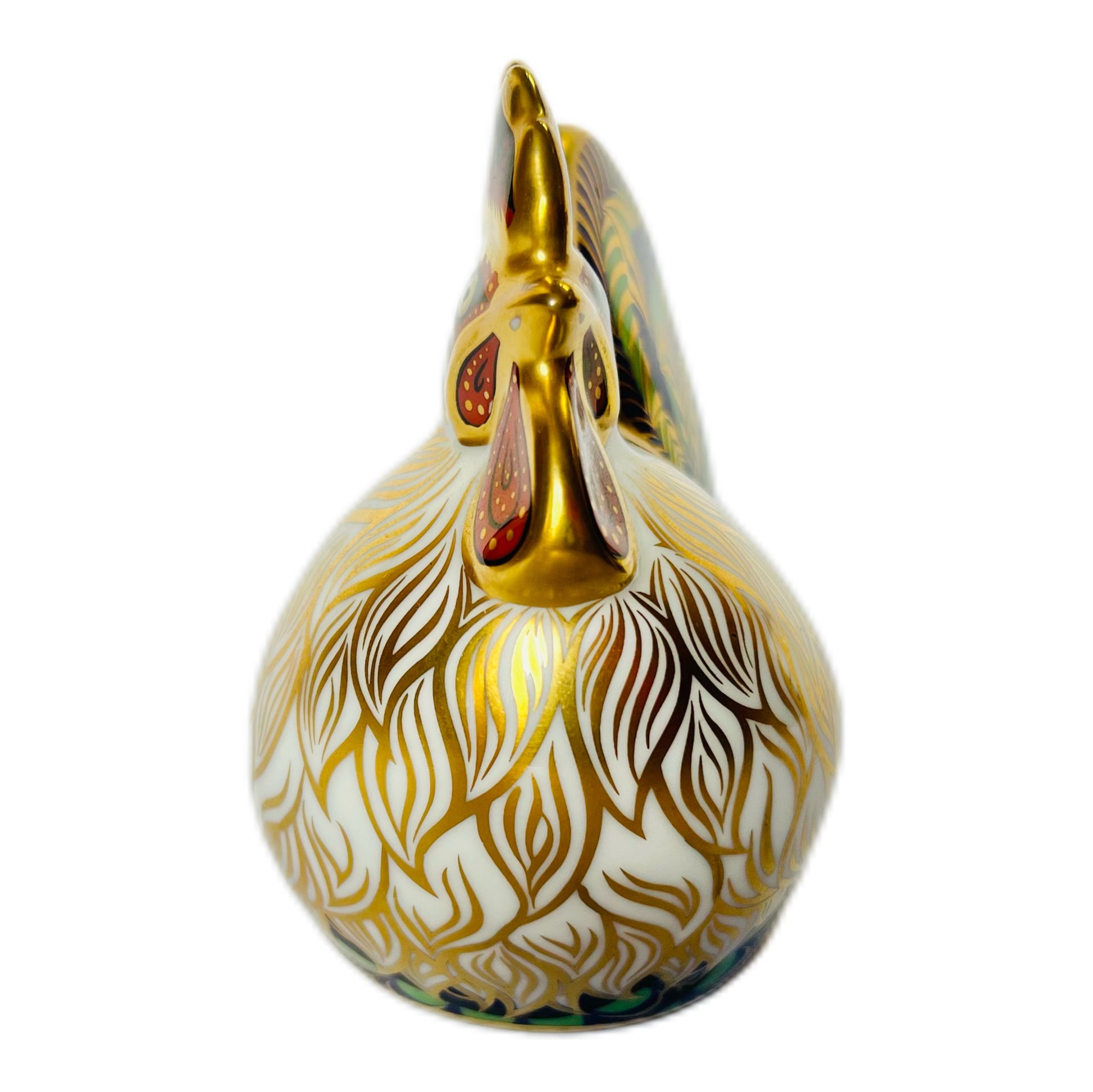 这尊雕像底部有约翰·阿布利特(John Ablitt)的签名,编号为2987/5000。它以精美的鎏金细节和伊万里风格的华丽装饰为特色,堪称皇家皇冠德比(Royal Crown Derby)的杰作。这只农场公鸡羽毛呈翡翠绿、钴蓝和猩红色,是皇家皇冠德比艺术的惊艳之作。