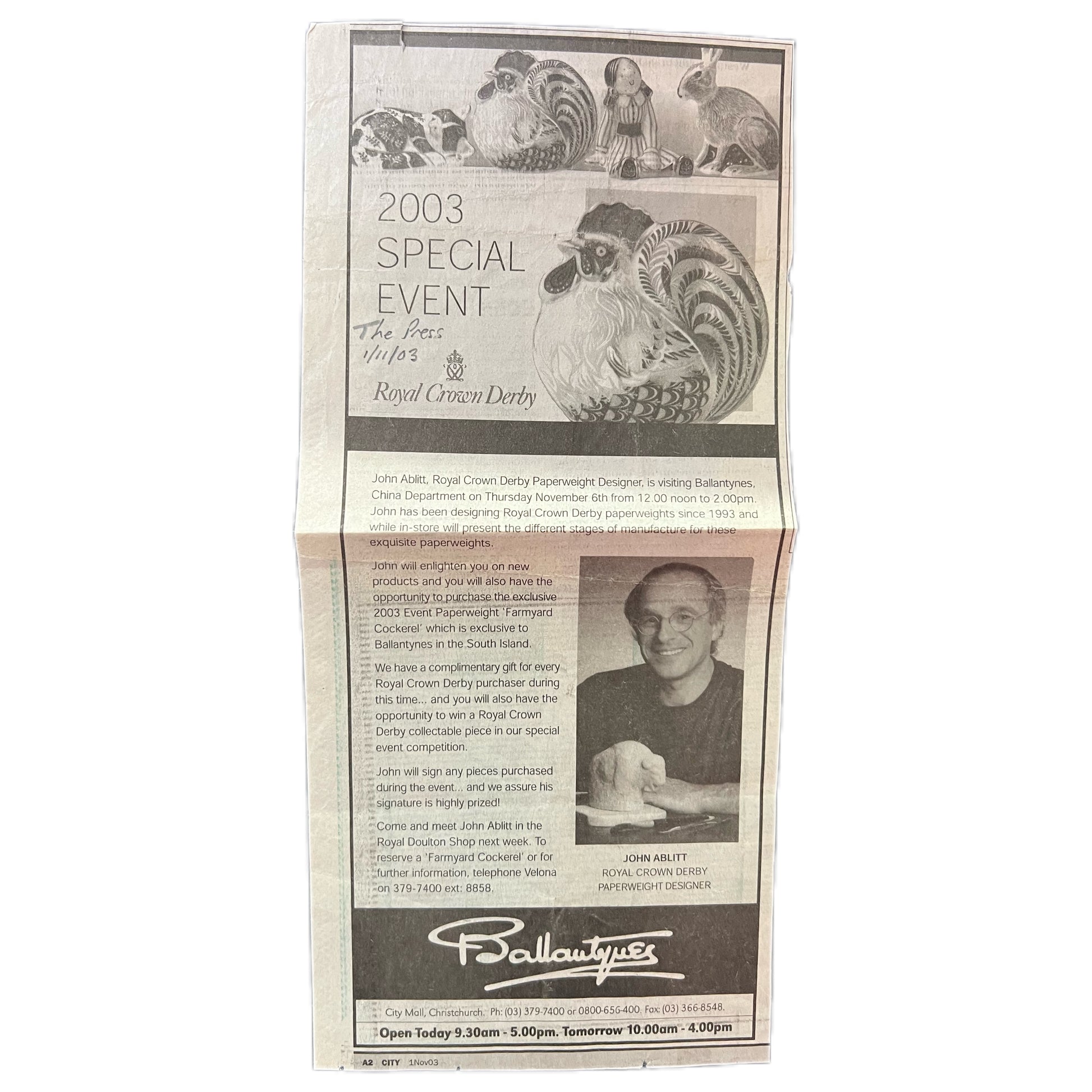 作为该物品来源的一部分,我们附上了该雕像在新西兰首次发行时的报纸剪报,其中包括约翰·阿布利特在该作品上签名的日期——2003 年 11 月 6 日。