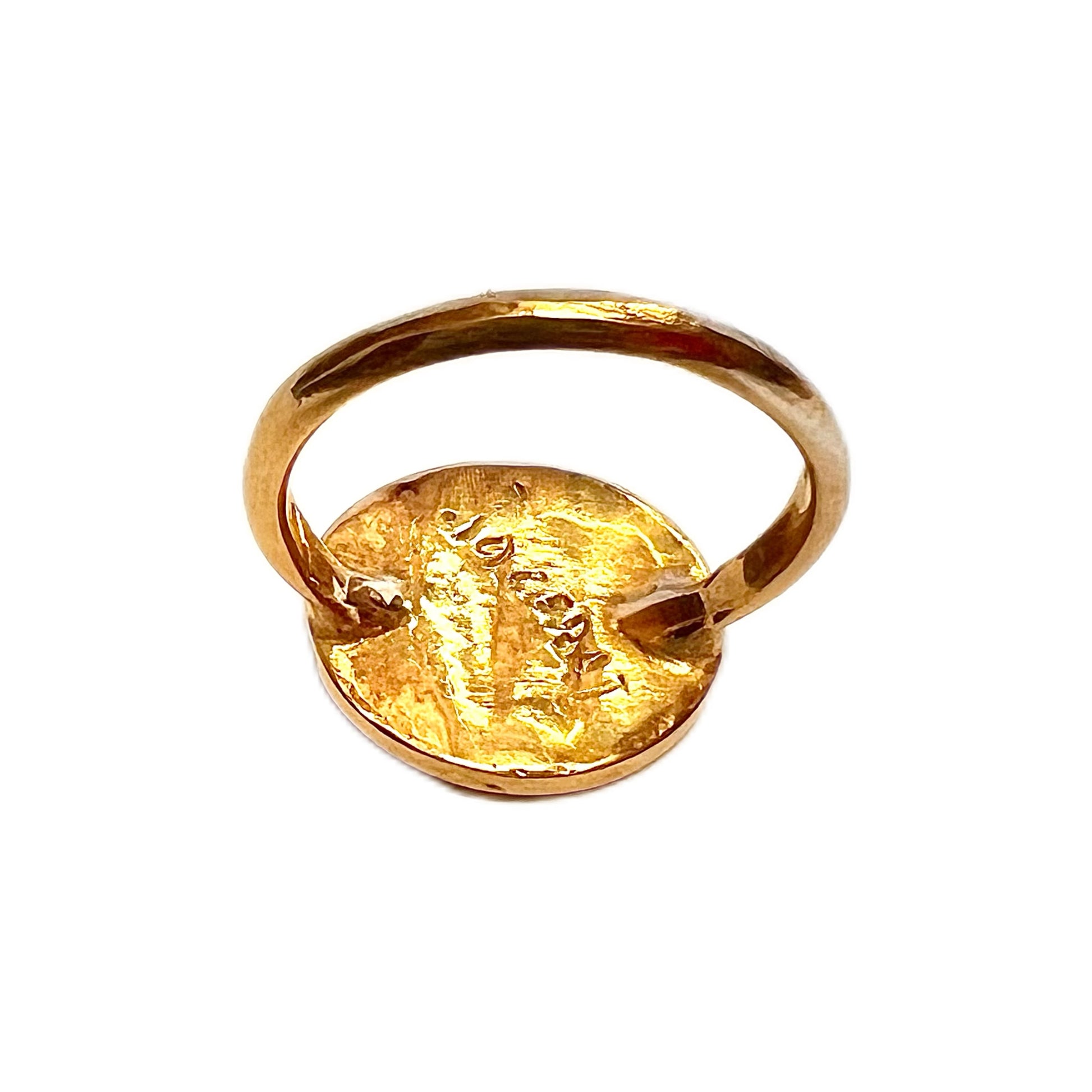 Here we have a beautiful 14k yellow gold Pollux ring made by NY designer Hocerat (Atelier Narce). Pollux and Castor are the twins that make up the “Gemini" Roman and Greek mythology. The myth goes that when Castor was killed, Pollux begged Zeus to give half of his own immortal power to his brother, making them both half man, half god. Pollux is the brightest star in the Gemini constellation, eternalizing the balance between Earth and the Divine. The pieces carved by Iohann Pita, the artist behind Hocerat, are based off the carved statue of Pollux outside of the Louvre Museum in Paris, France.