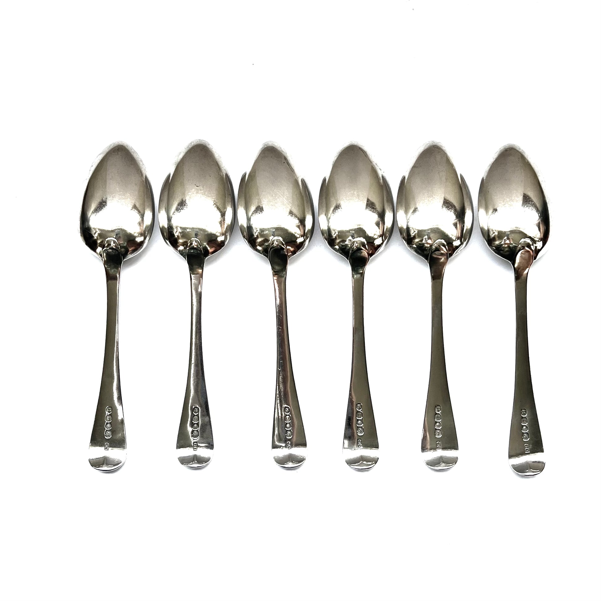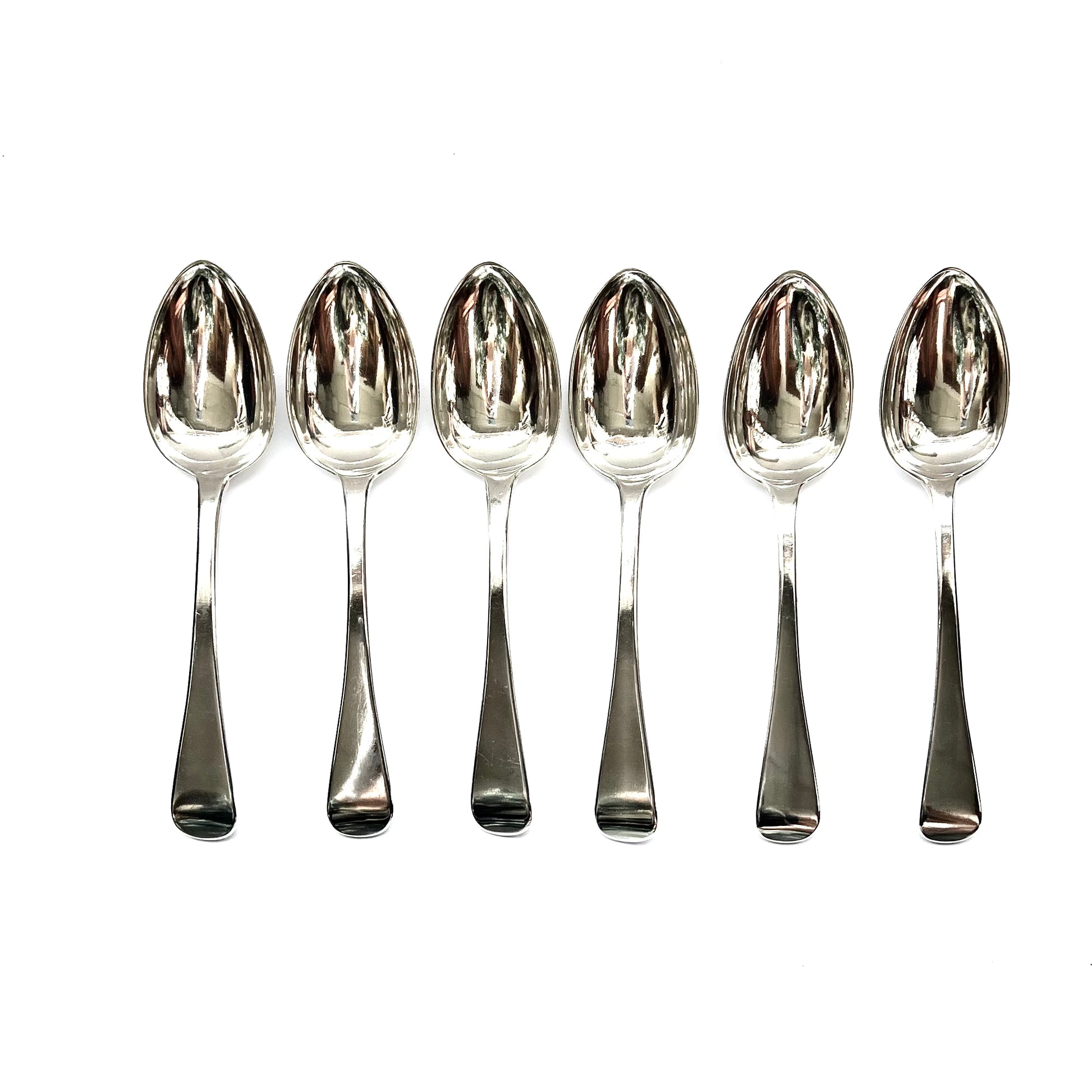 一套精美的 6 把乔治四世纯银餐勺,图案与克莱门特·奇斯相似,带有克莱门特·奇斯的标记,1828 年,伦敦。奇斯活跃于 1823 年至 1830 年,专营餐具,他的勺子至今仍具有收藏价值;他的风格体现了乔治王朝时期内敛优雅的风格。