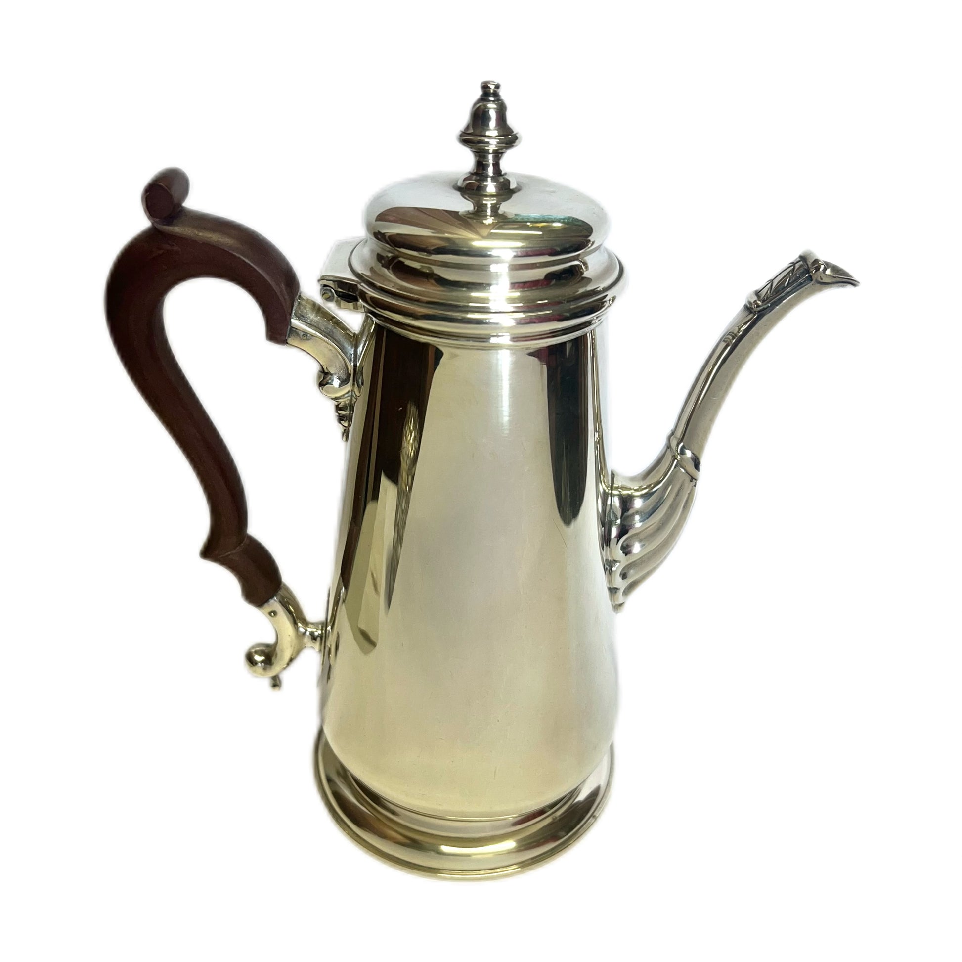 Elegantly made with shell-form motif to base of spout and timber handle, as well as of substantial weight and thick gauge.