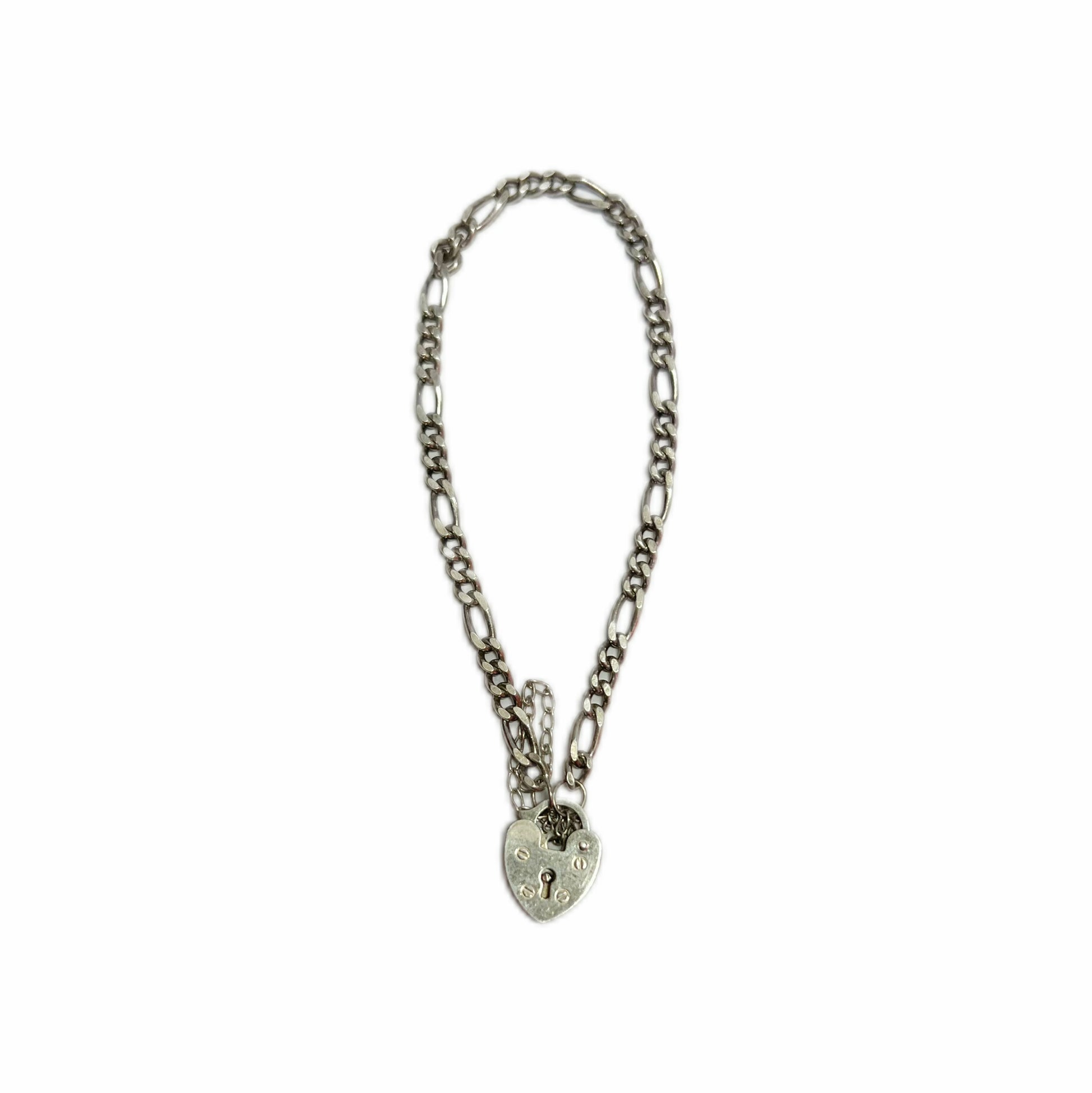 A dainty, elegant sterling silver bracelet with heart-shaped padlock and safety chain.
