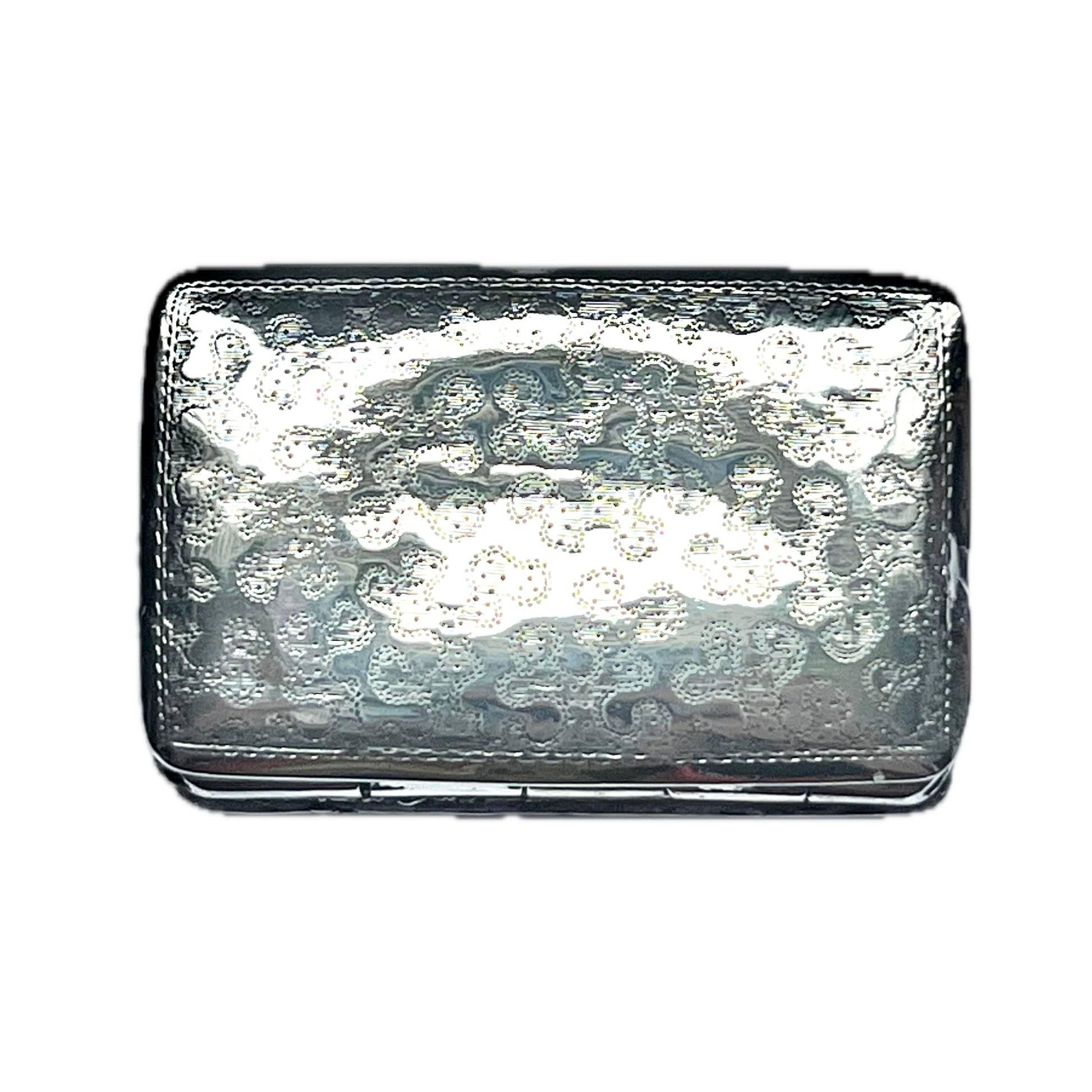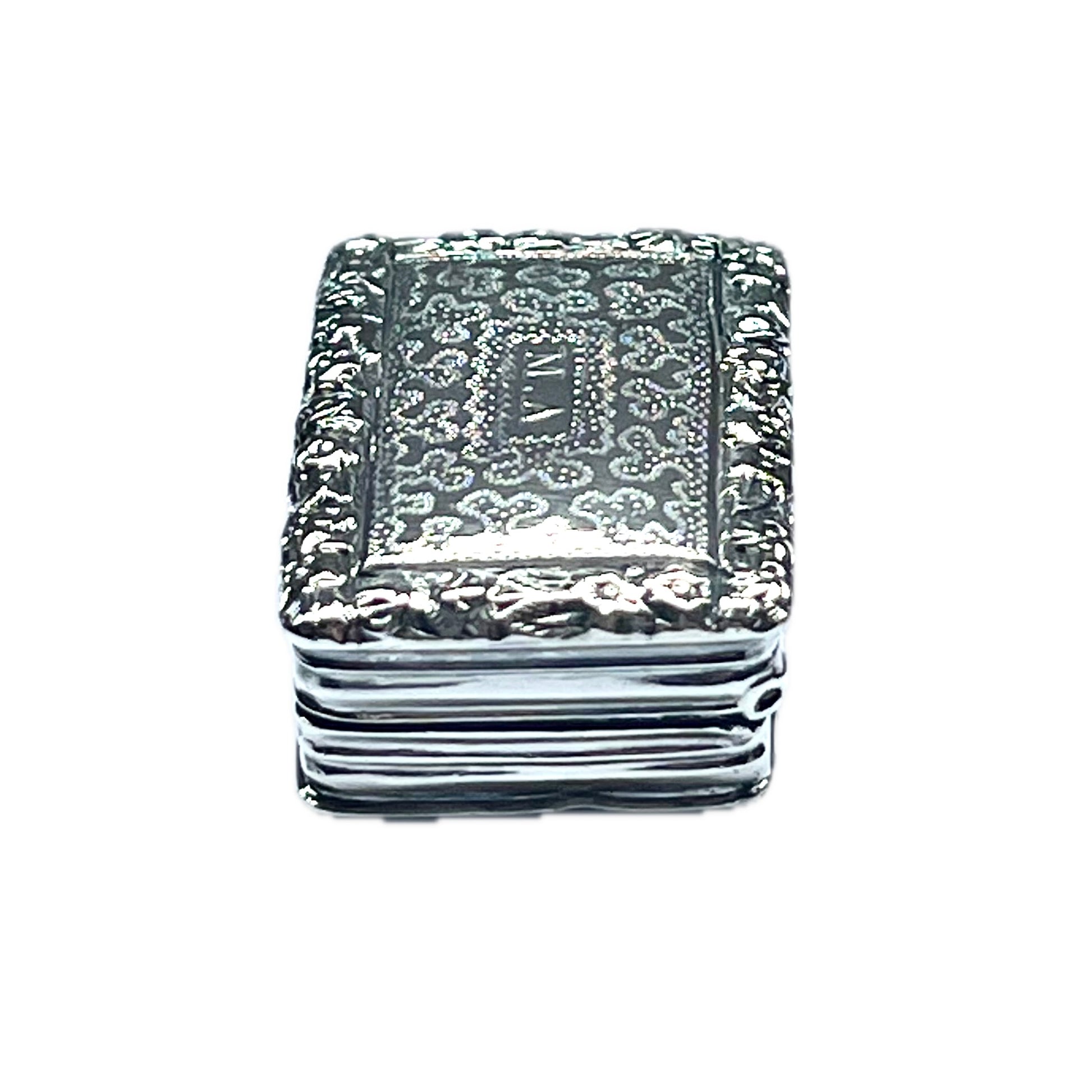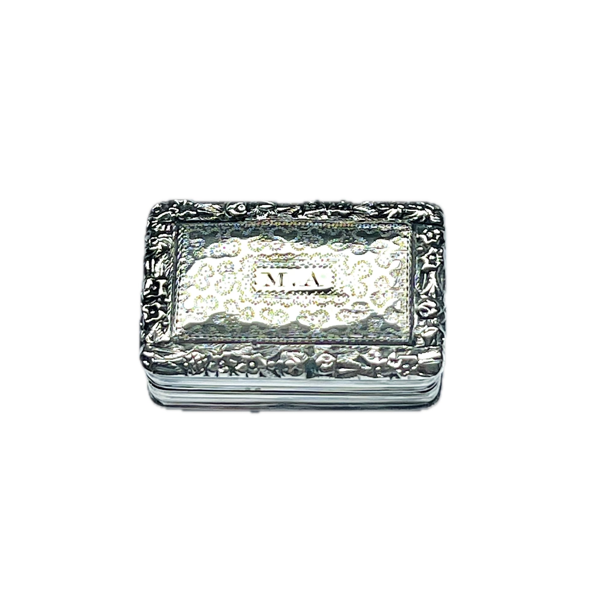 顶部和底部均有精美的雕刻细节,蚀刻图案让人联想到佩斯利花纹或豹纹。饰章上刻有首字母 MA,内部镀金,带有美丽的花卉图案格栅。
