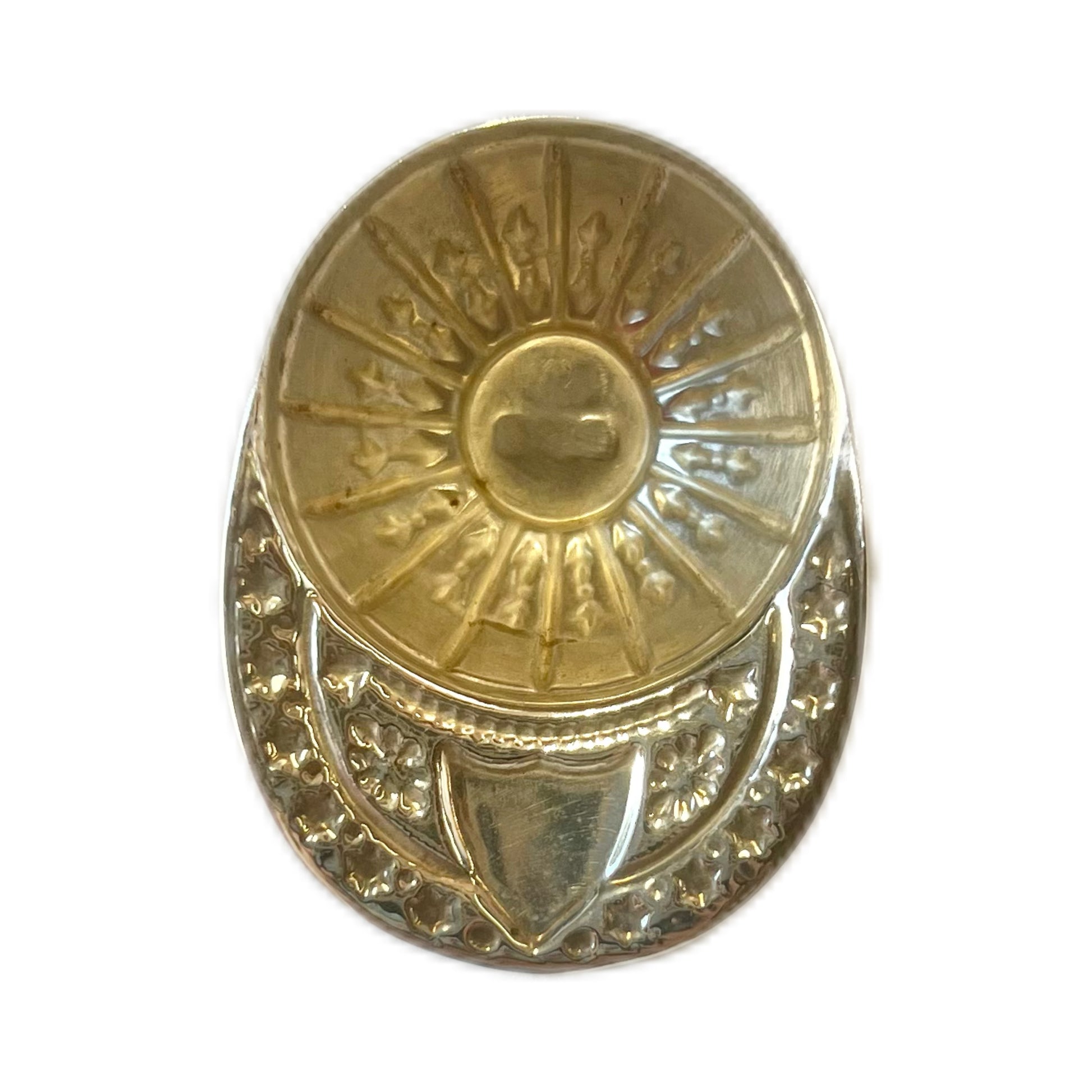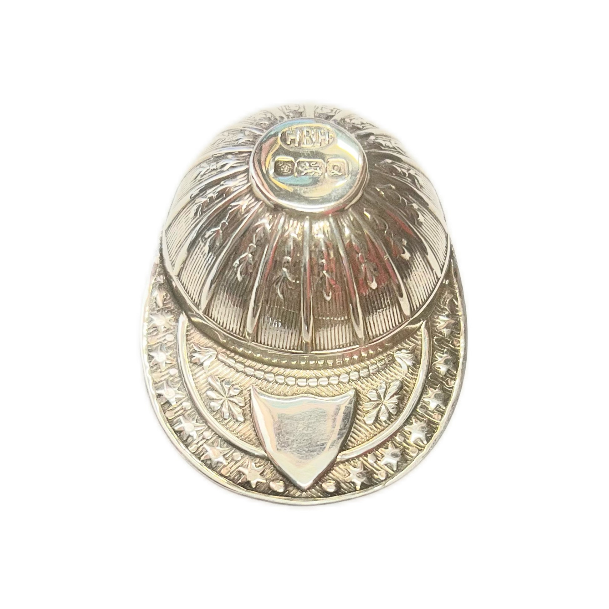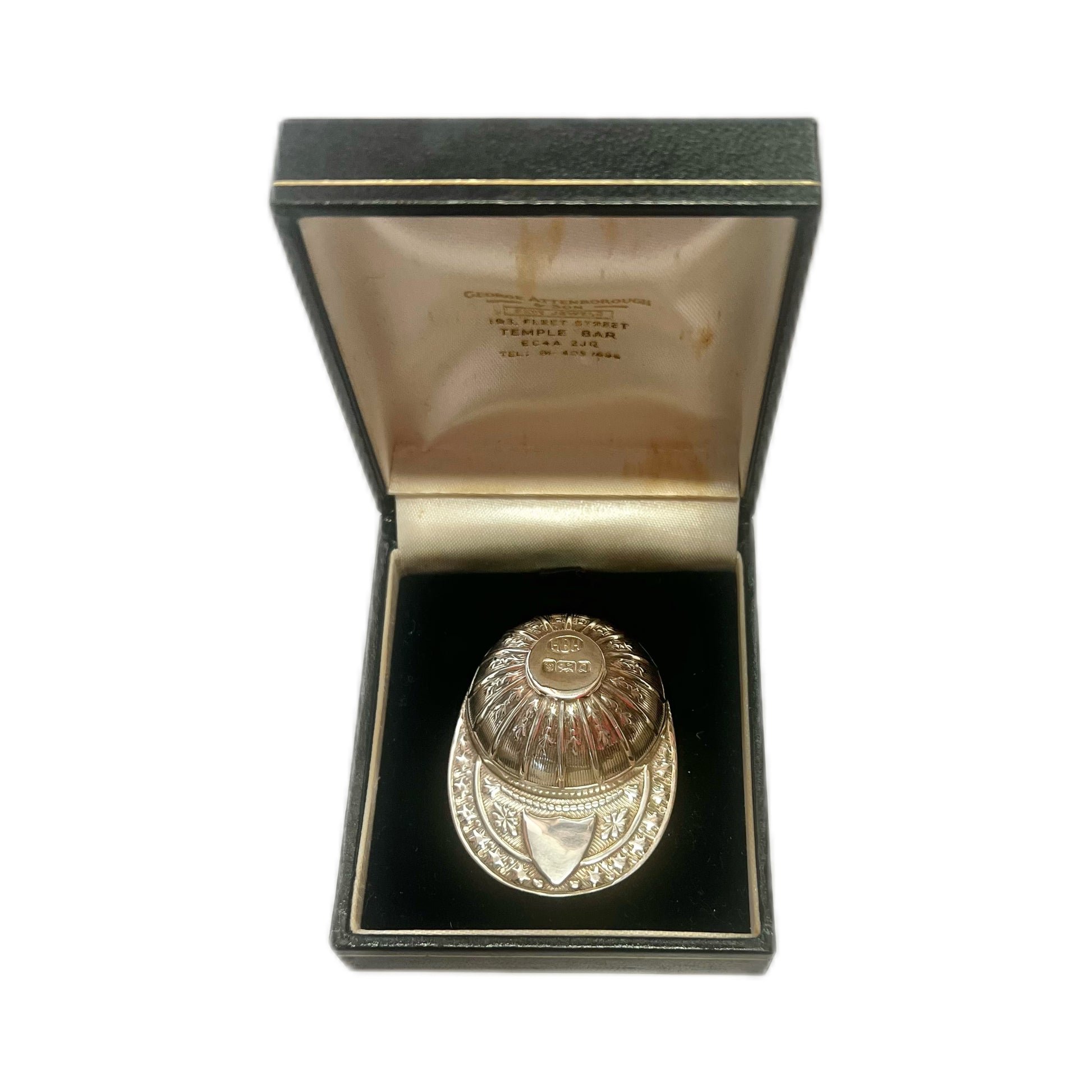 A very neat vintage QEII sterling silver novelty jockey cap tea caddy spoon, with marks for Sheffield, 1990, Harrison Brothers & Howson Ltd. With original retailer’s case by George Attenborough & Son, prominent London pawnbrokers and silversmiths. The latter ceased trading in 2020, but prior to that their premises on 193 Fleet Street was known for its excellent selection of silver and fine jewels, with the family business being active since 1844.