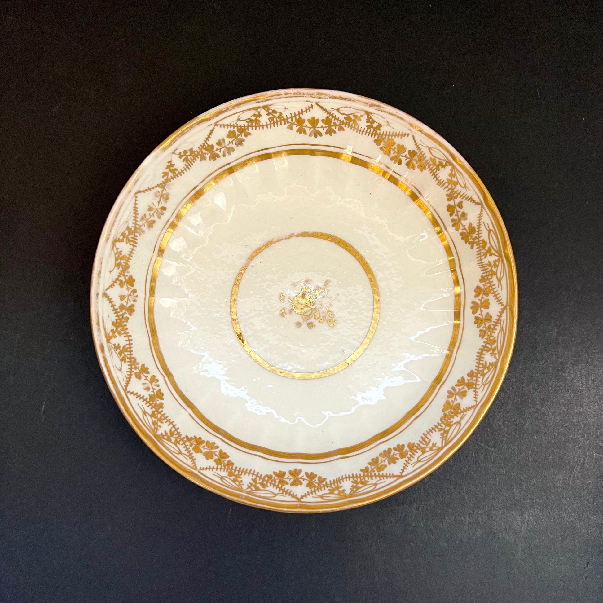 约 1800-1820 年产的精美 19 世纪早期英国瓷器杯碟。布特杯形由 Spode 于 1800 年推出,并大受欢迎,但摄政时期贵族的品味迅速变化,导致这种趋势在 1820 年逐渐消退。虽然没有标记,但这款瓷器肯定是出自当时较好的制造商之一,例如 Spode,其镀金图案丰富。