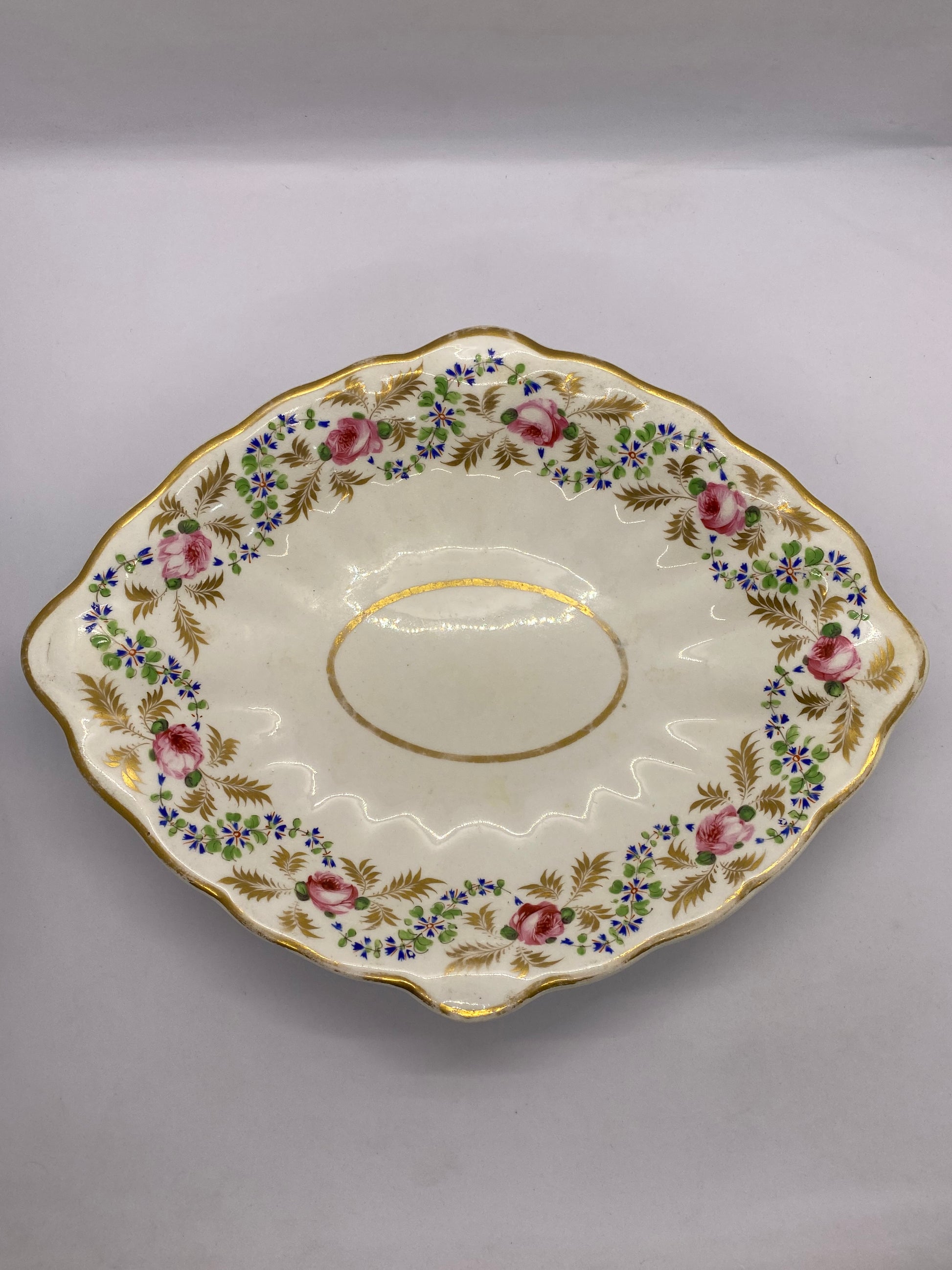 这款可爱的盘子呈钻石形状,边缘有凹槽和模制图案。这件作品是精美的手绘花卉图案。