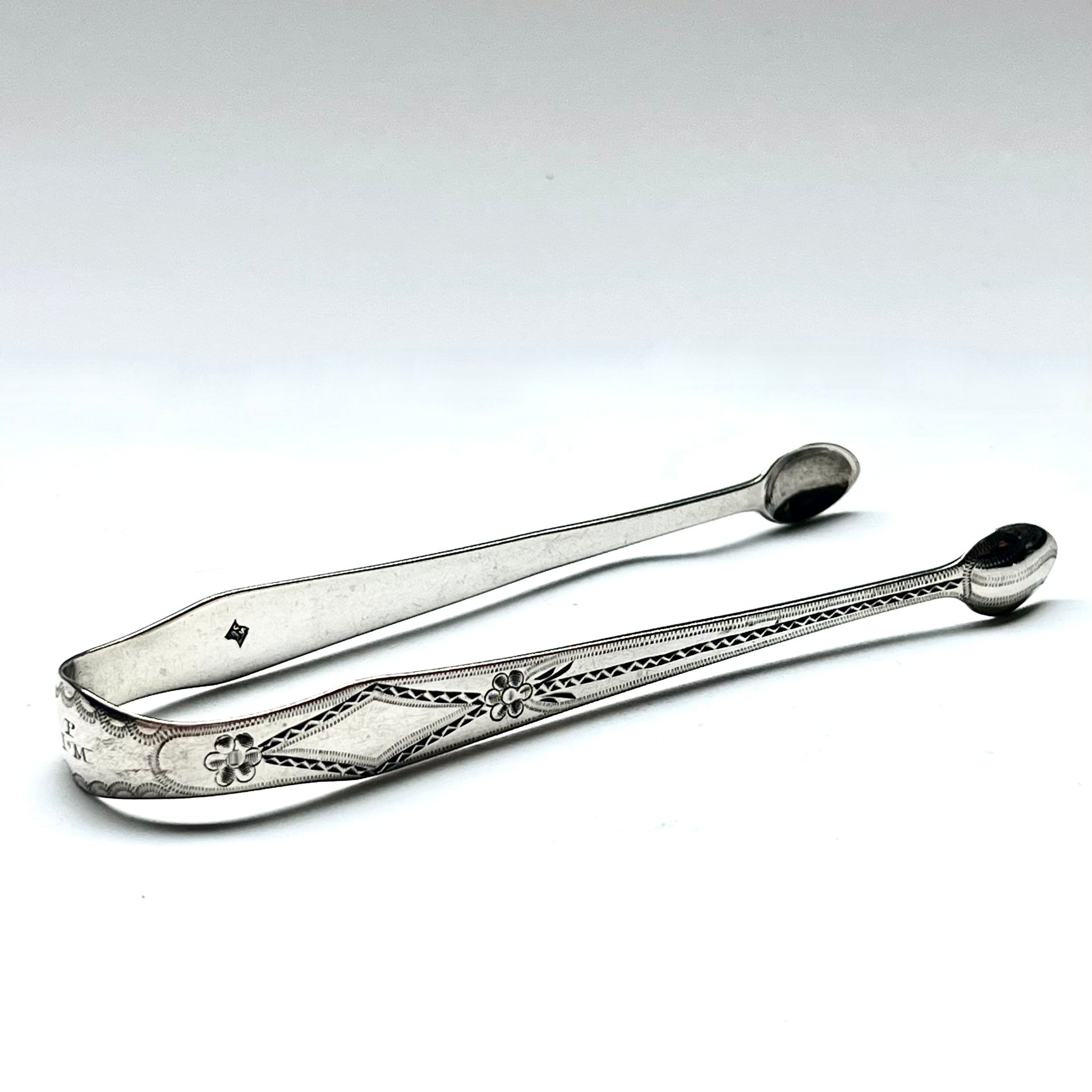 一对优雅的乔治王朝纯银钳子,其标记基于对伦敦 1798 年乔治·史密斯二世和托马斯·霍伊特的研究。虽然缺少市政府标记,但缺少检验标记的原因可能是银匠希望避免标记费,或避免出口牌照税。