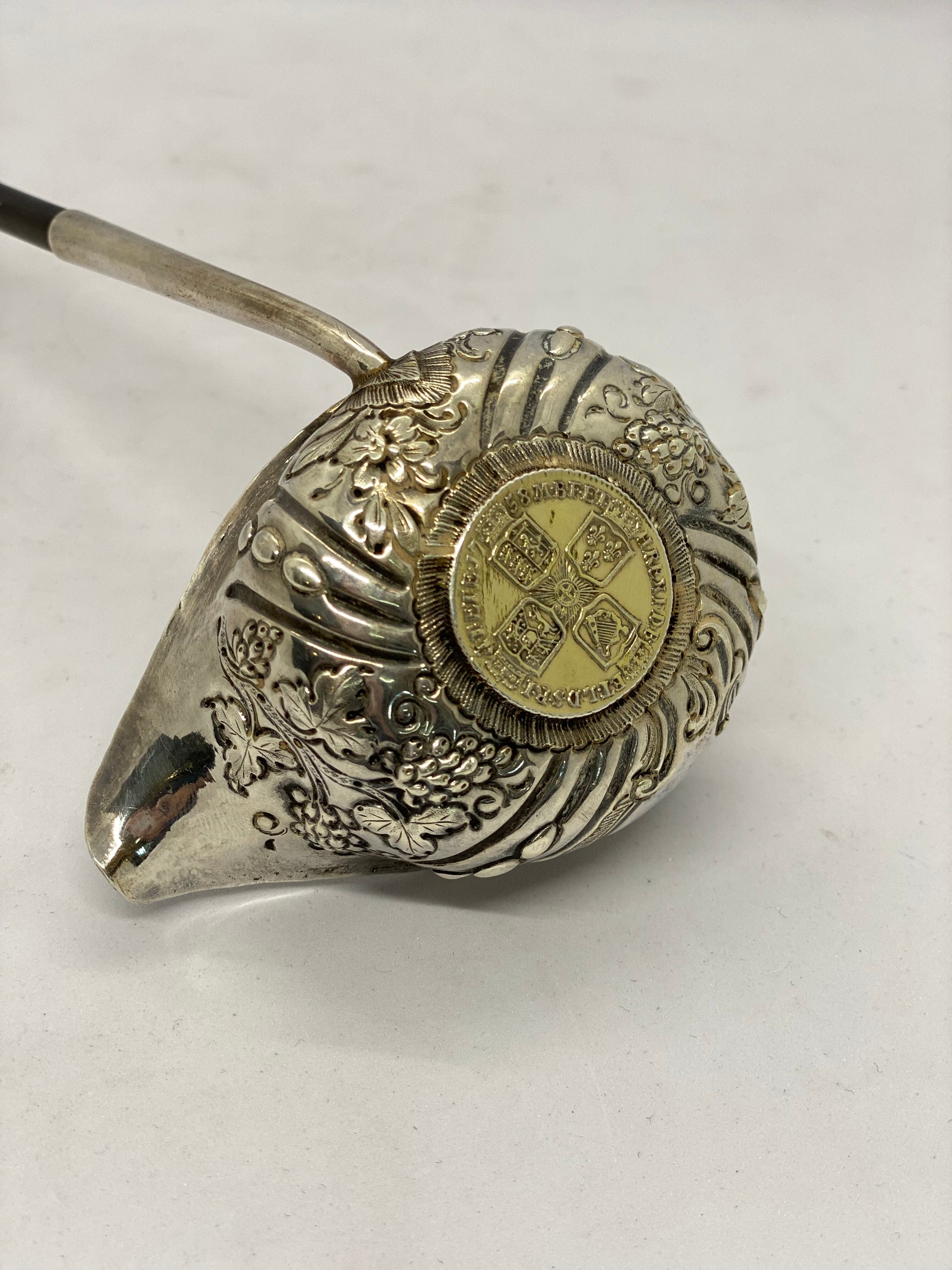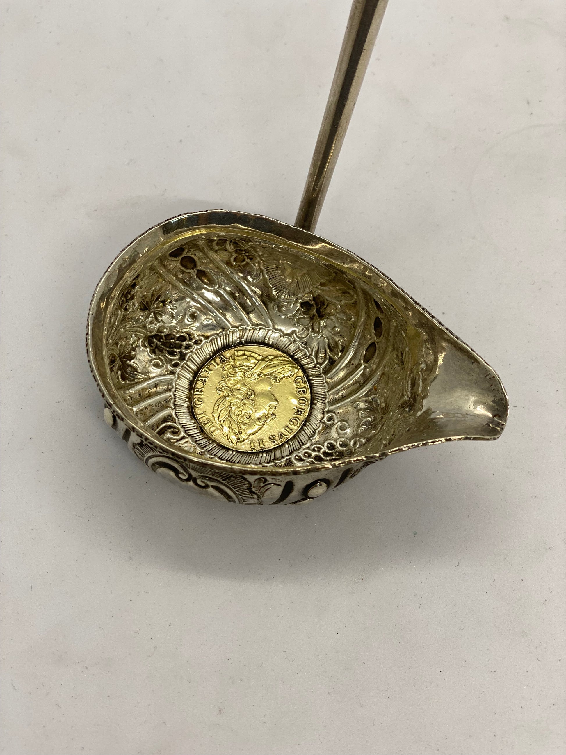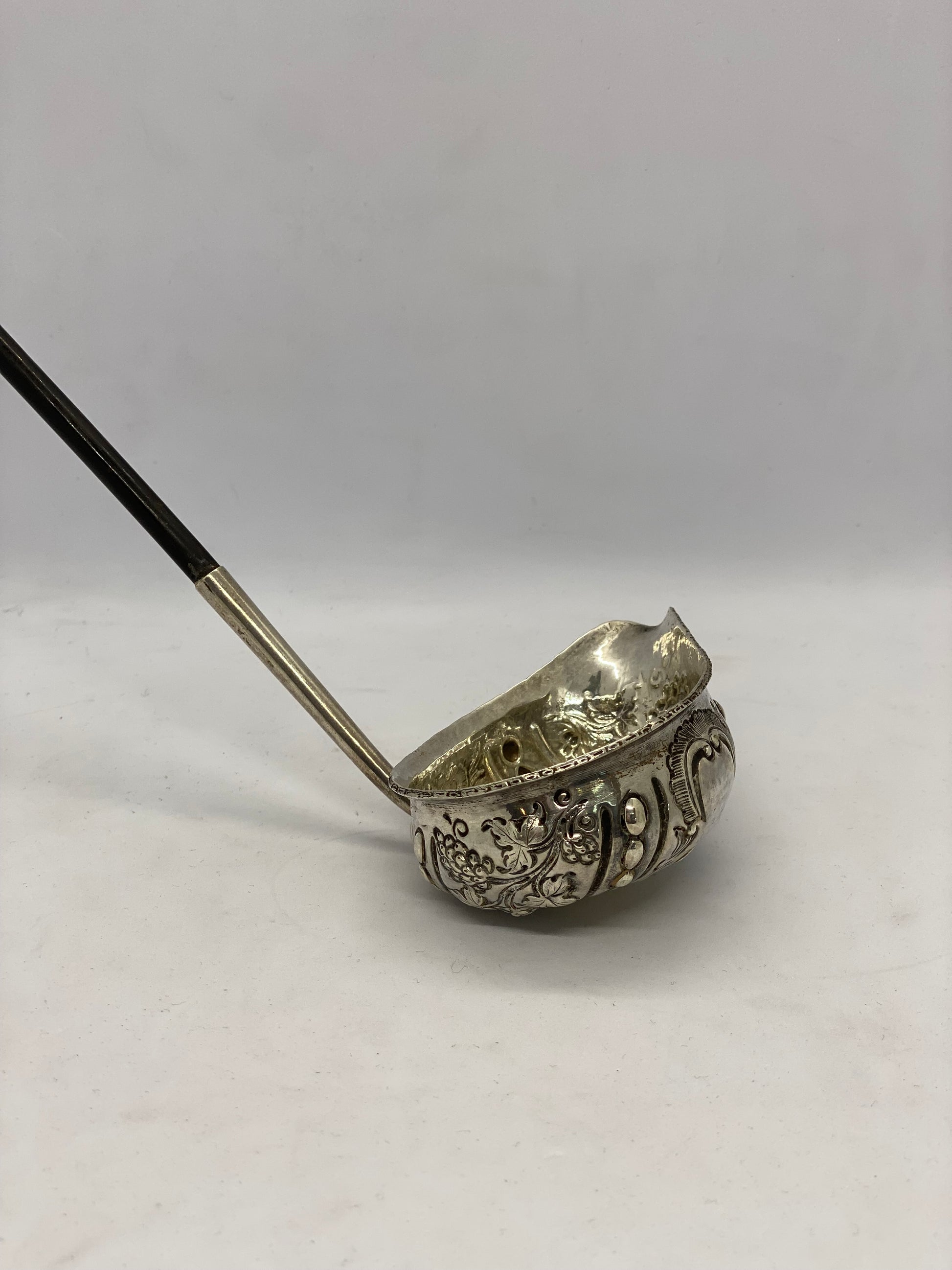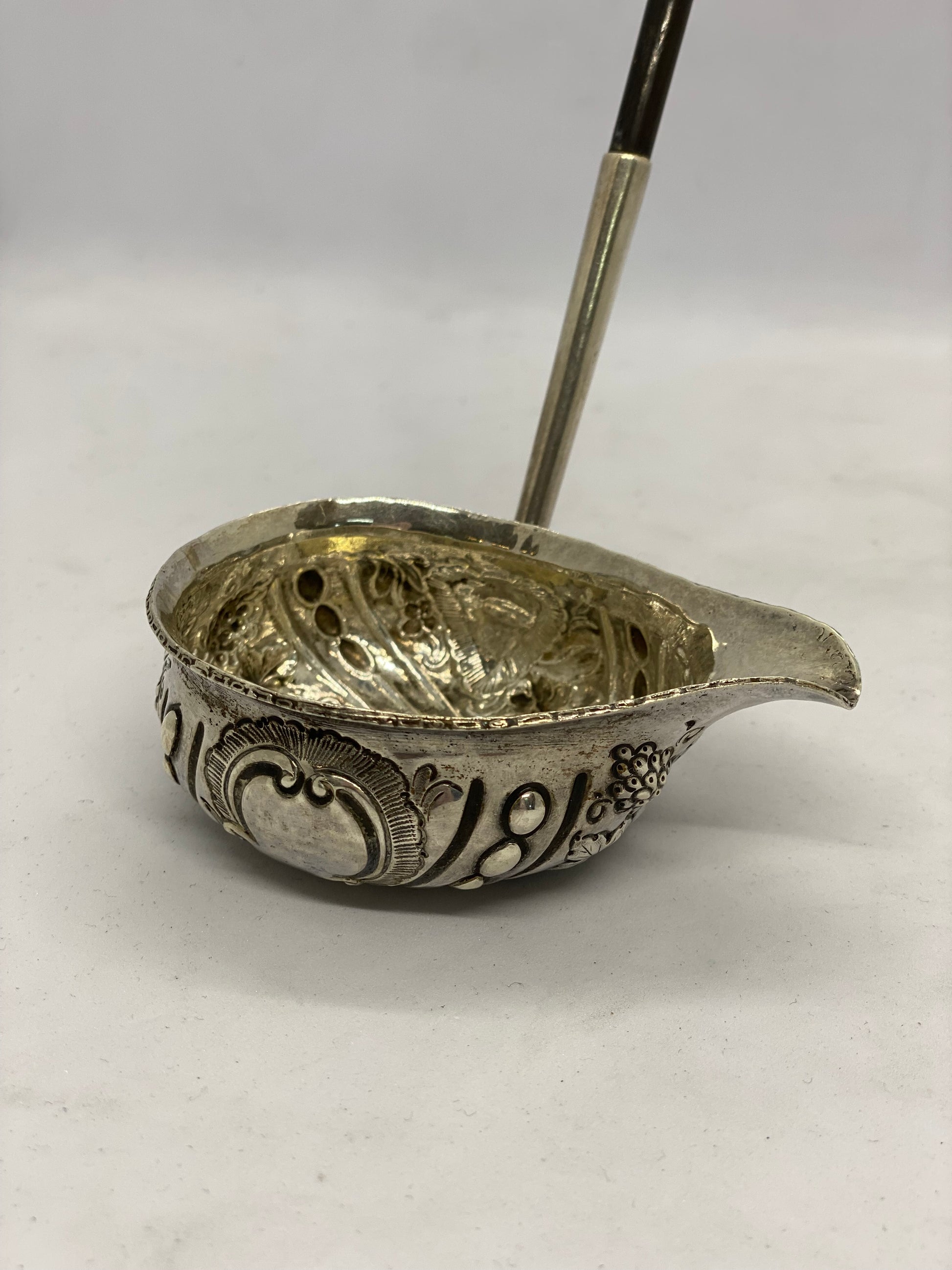 约 1770 年至 1800 年间制造的带有鲸须柄的纯银热酒勺。