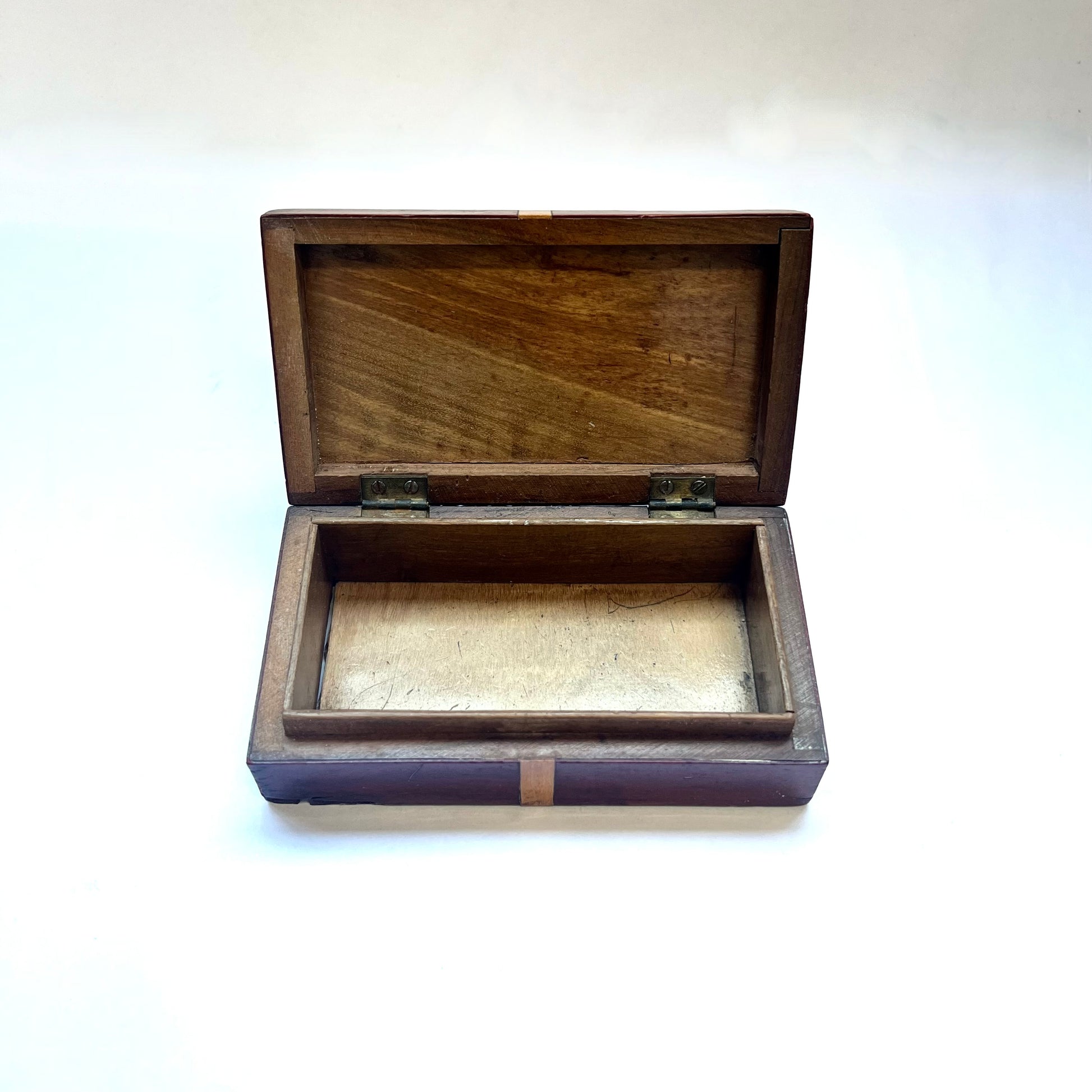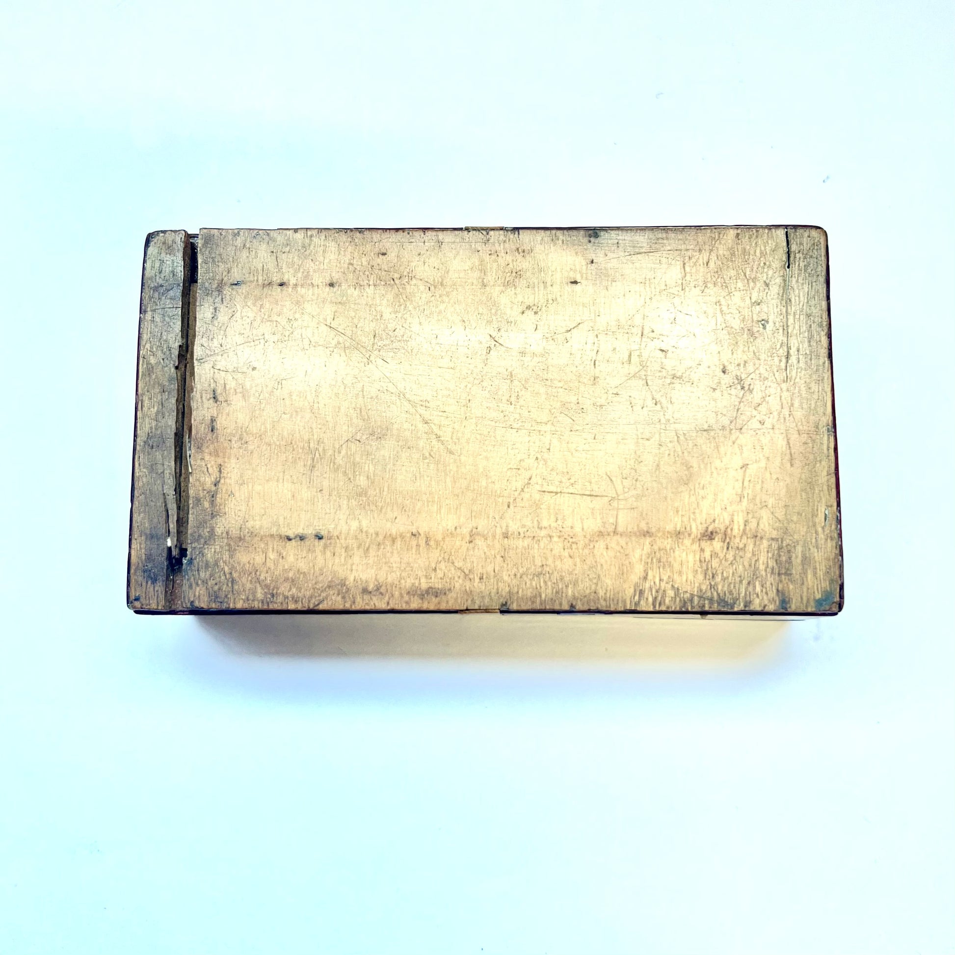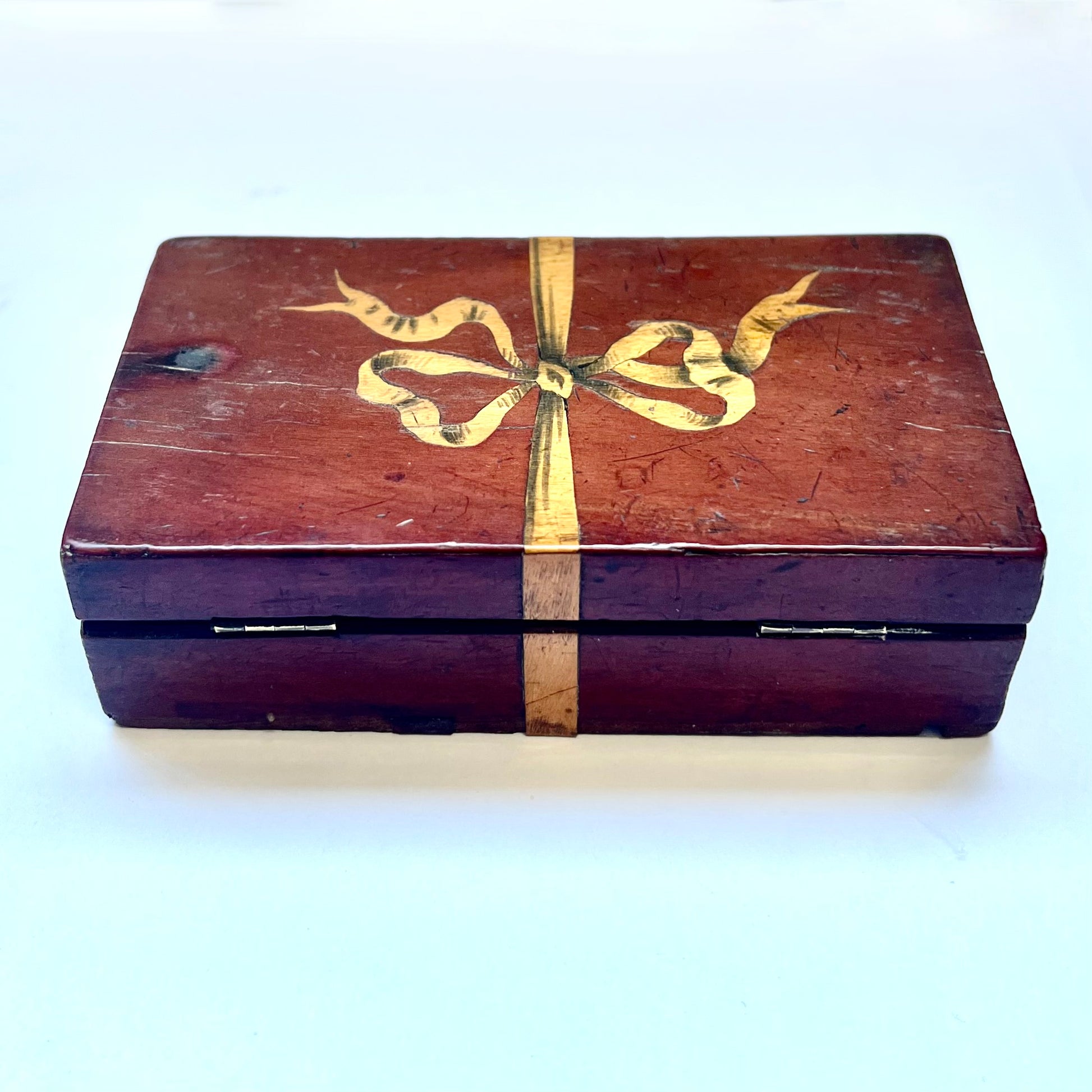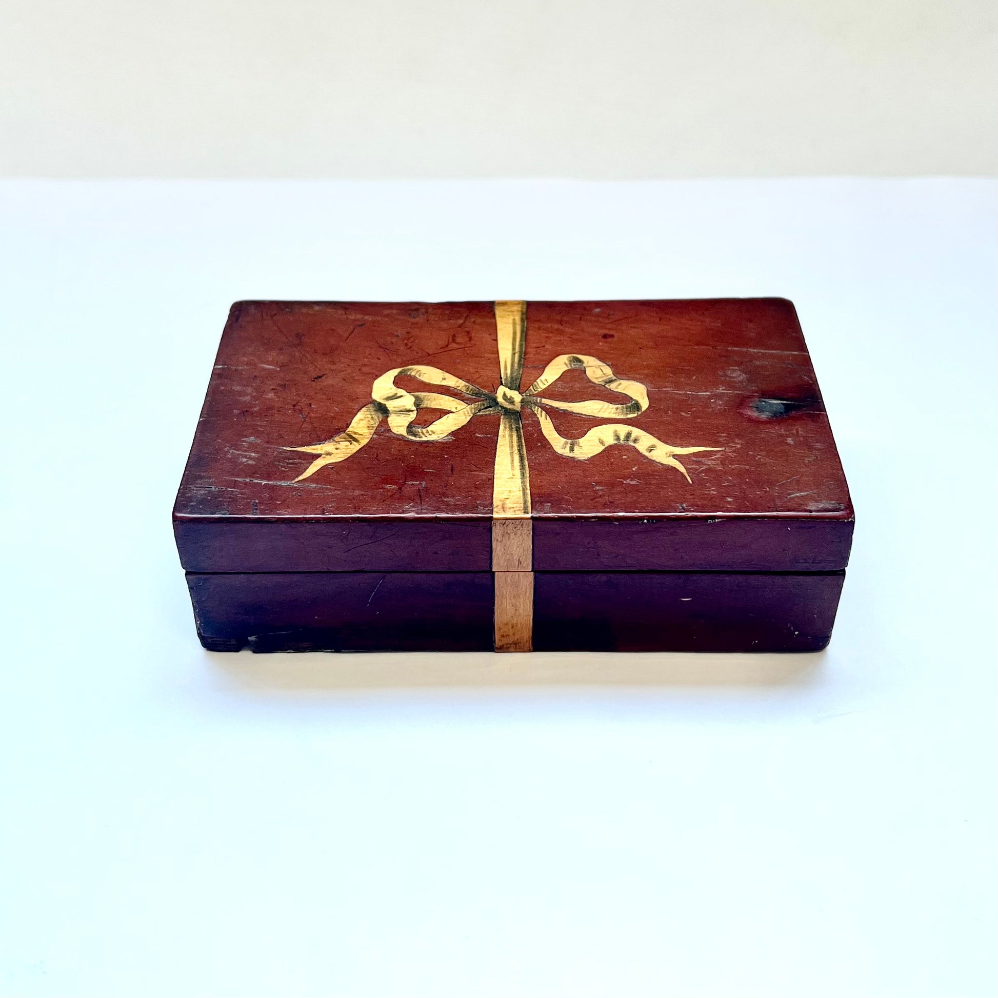 古董英国木制陶器盒,带有独特的镶嵌错视蝴蝶结图案,乔治亚时期至维多利亚早期