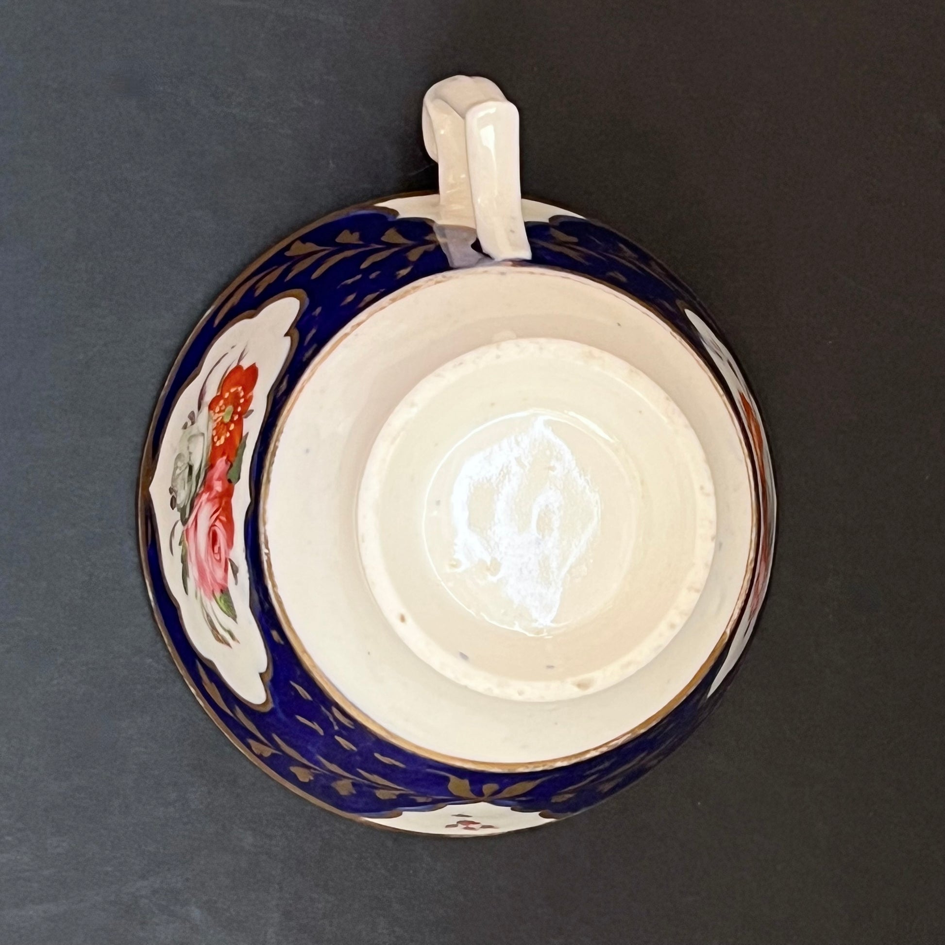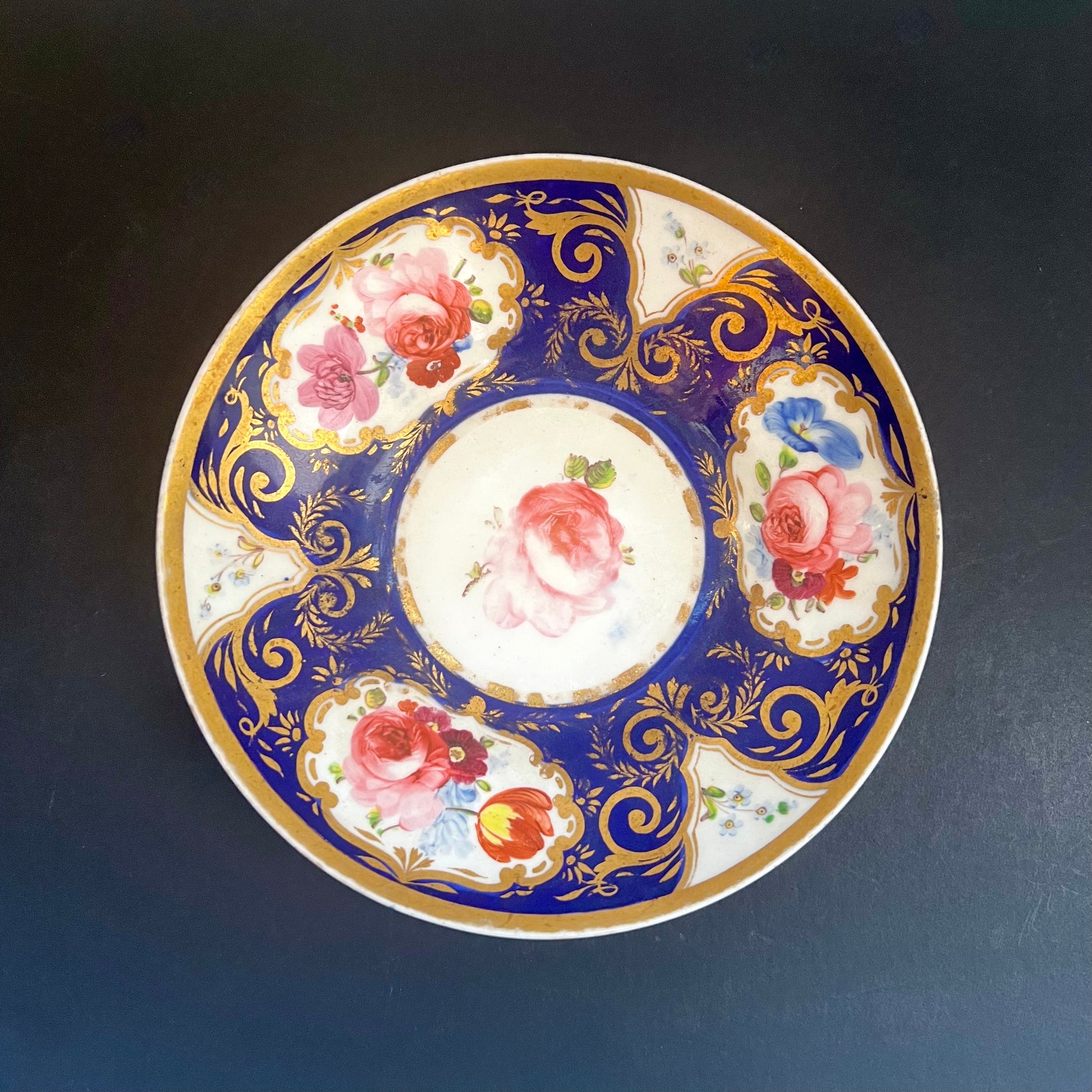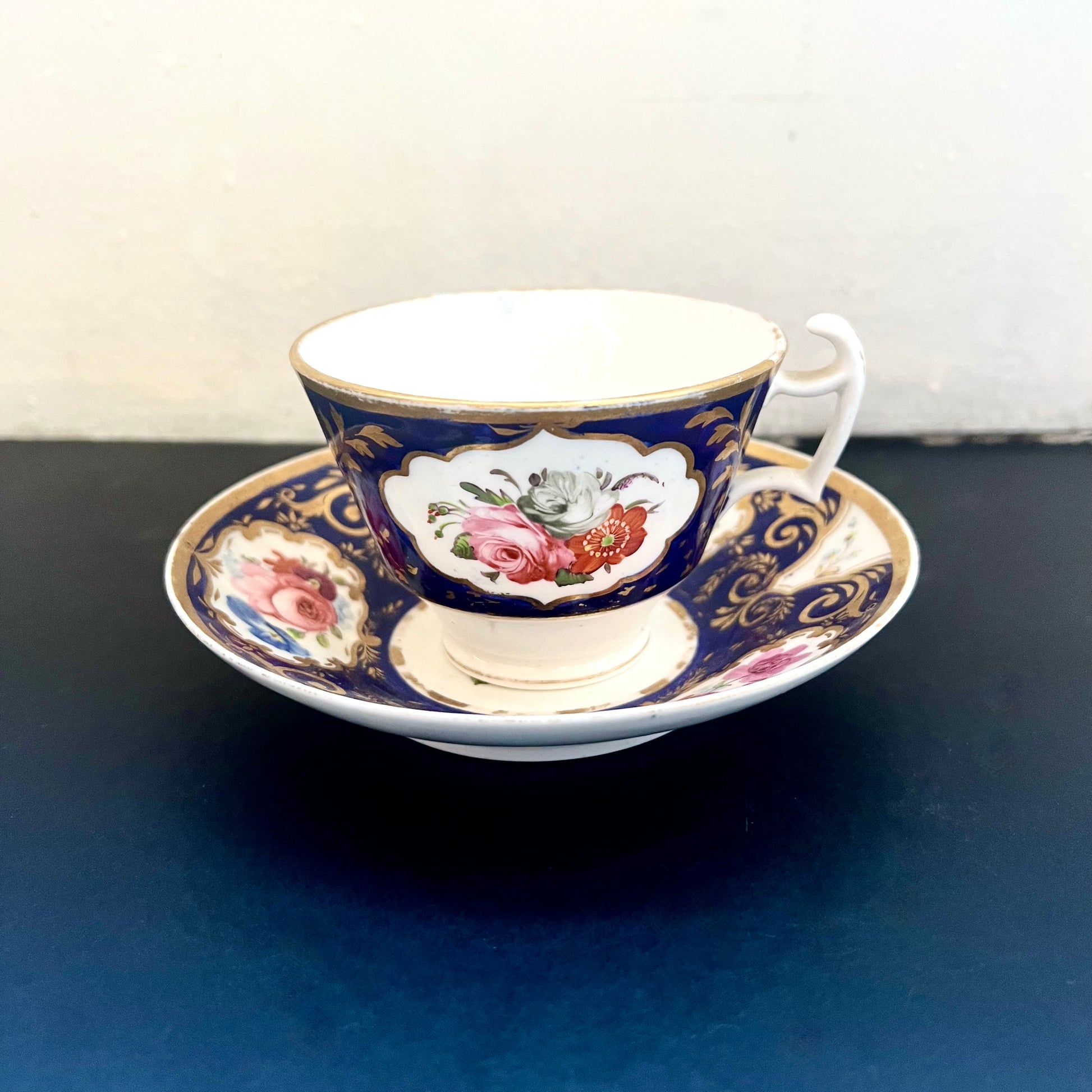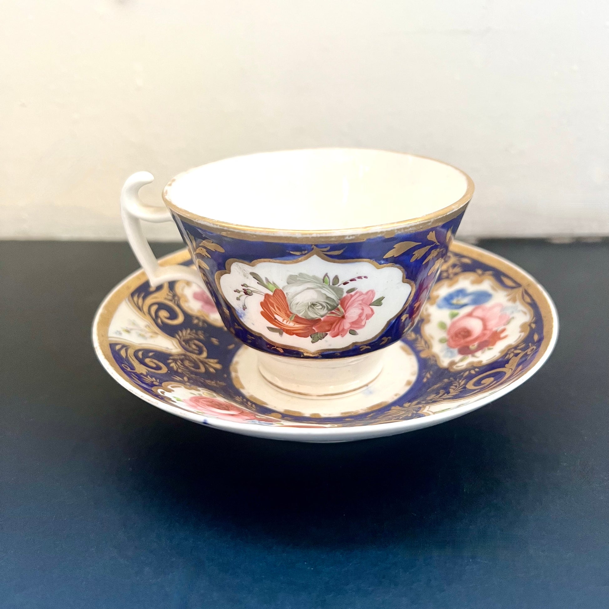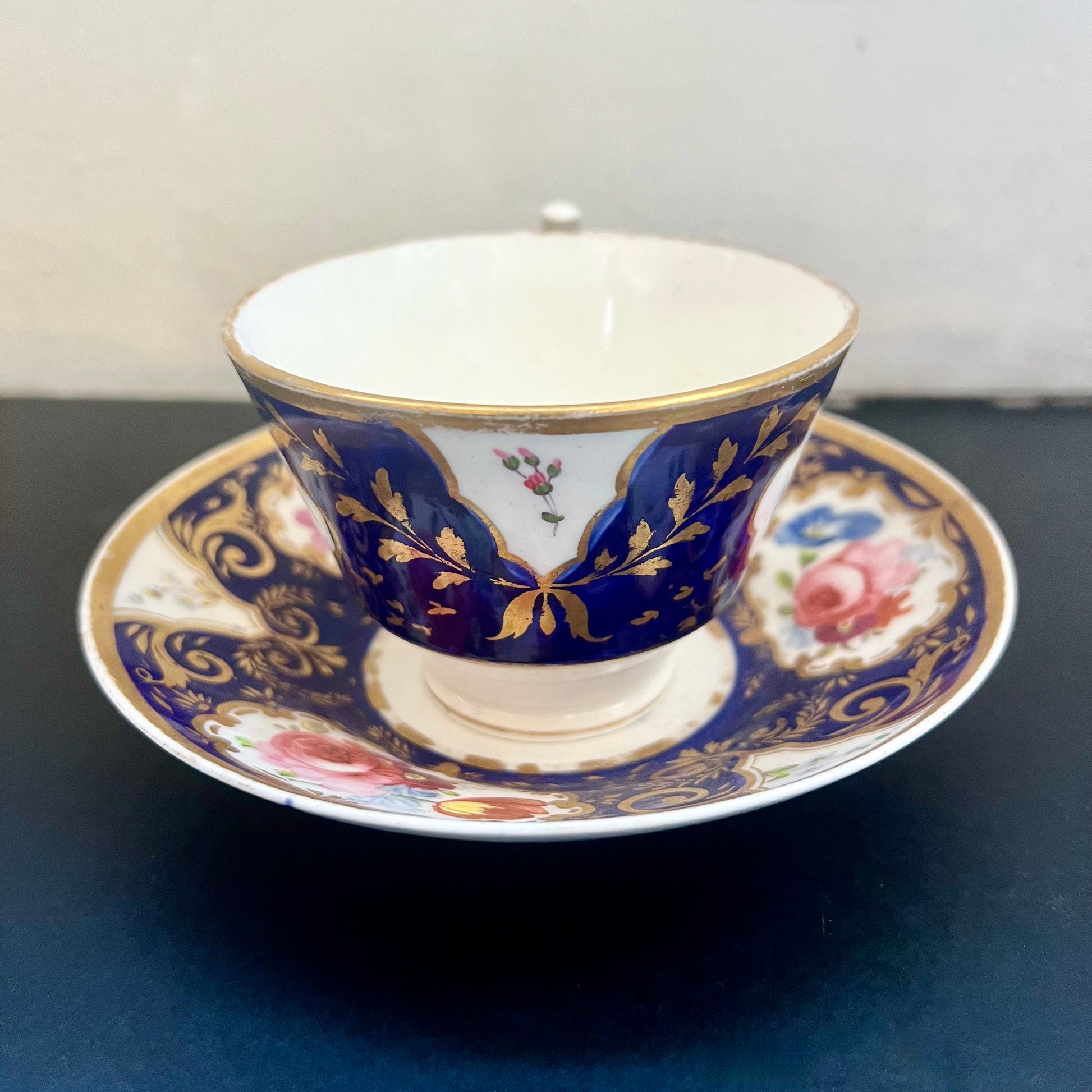 约 1817-1830 年产的精美 19 世纪早期英国瓷杯和碟。在钴蓝色的底面上,形状各异的花饰中点缀着精美的花朵。镀金图案丰富,包括蔓藤花纹和茛苕叶以及垂枝常春藤,使其成为我们见过的这一时期最精美的杯子之一,真正体现了维多利亚时代前早期瓷器的工艺。