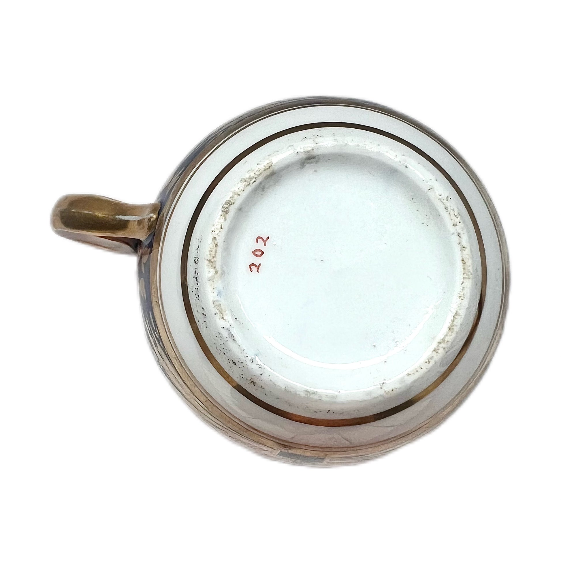 A very similar style to two cups we have of the same period, with one being Minton. Certainly by a reputable maker such as Davenport or New Hall. Pattern number 202 in iron red glaze to base.