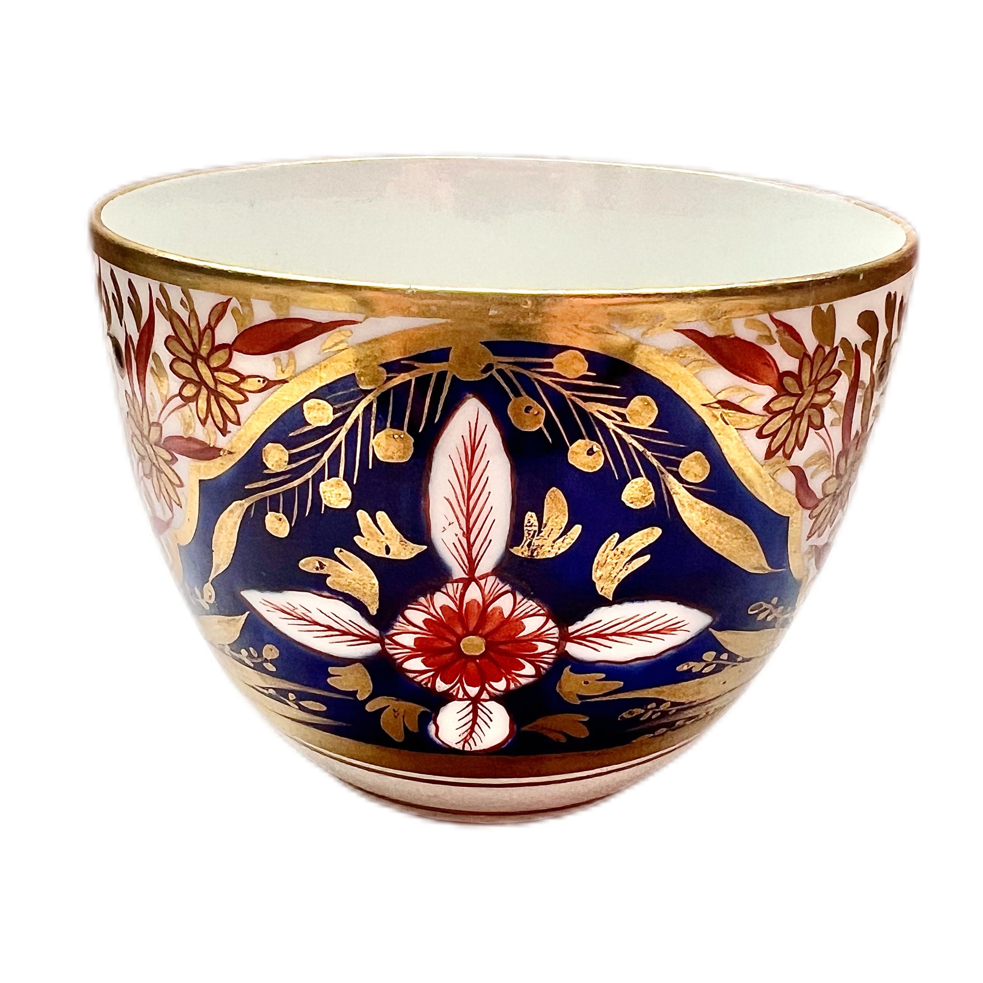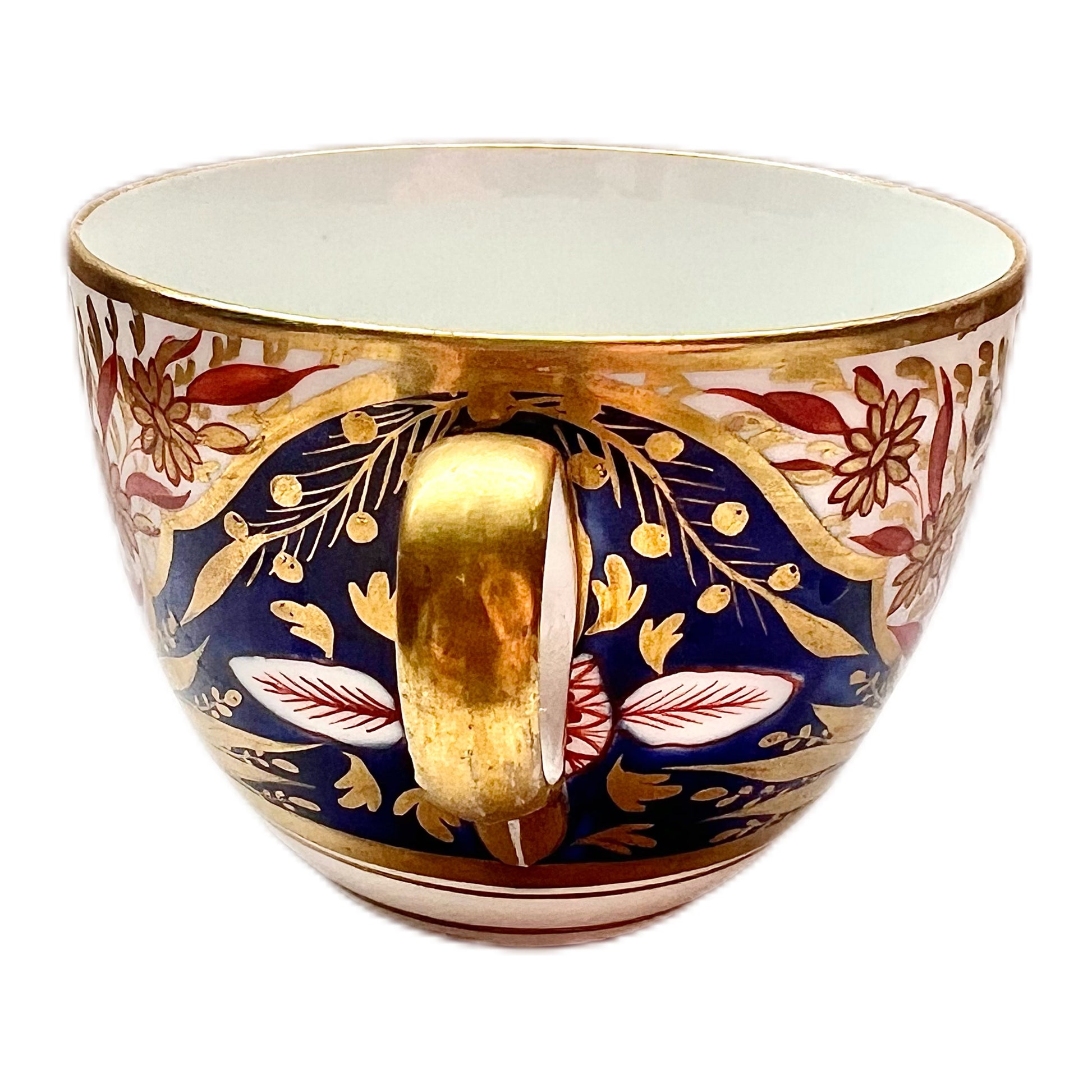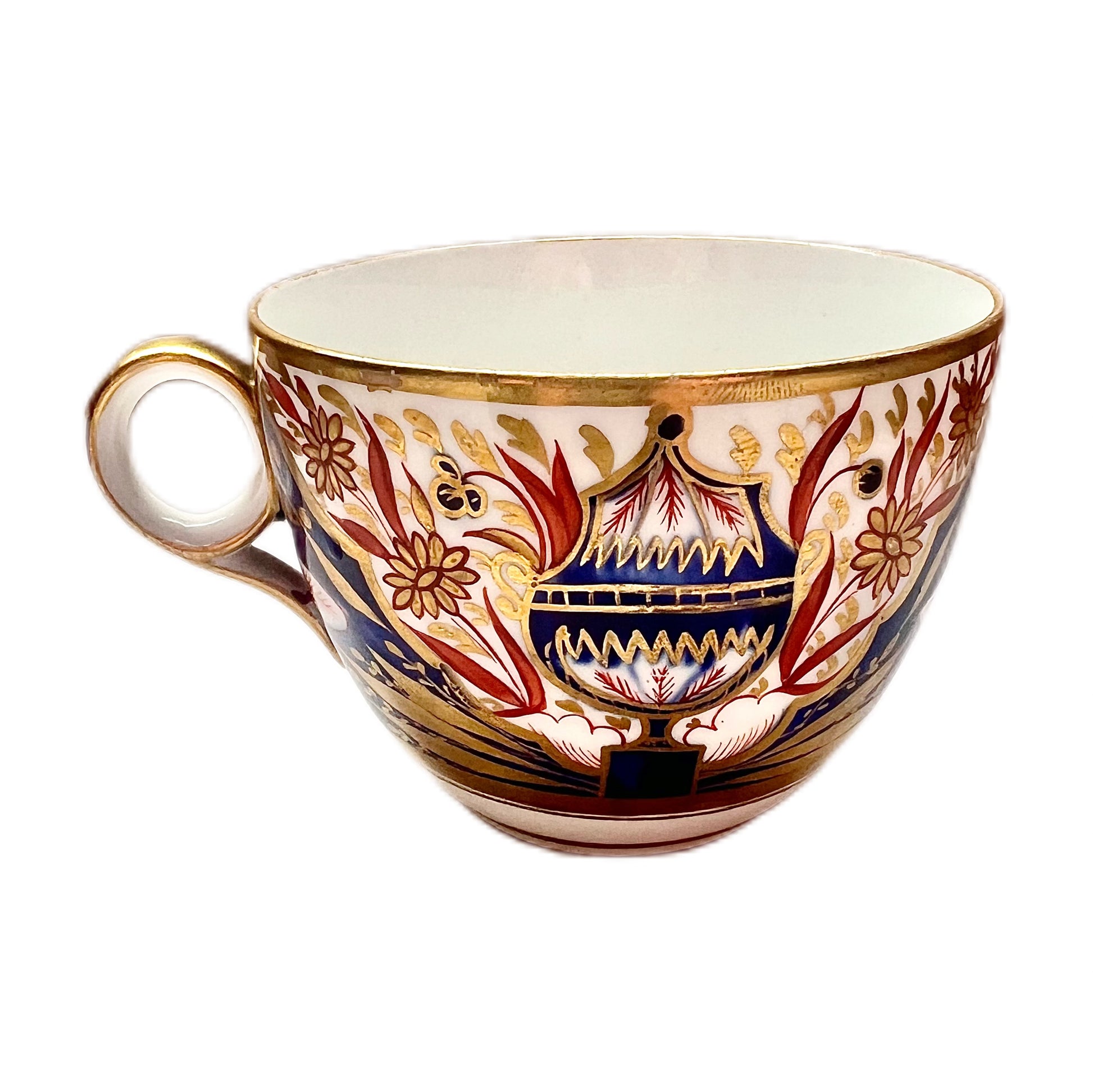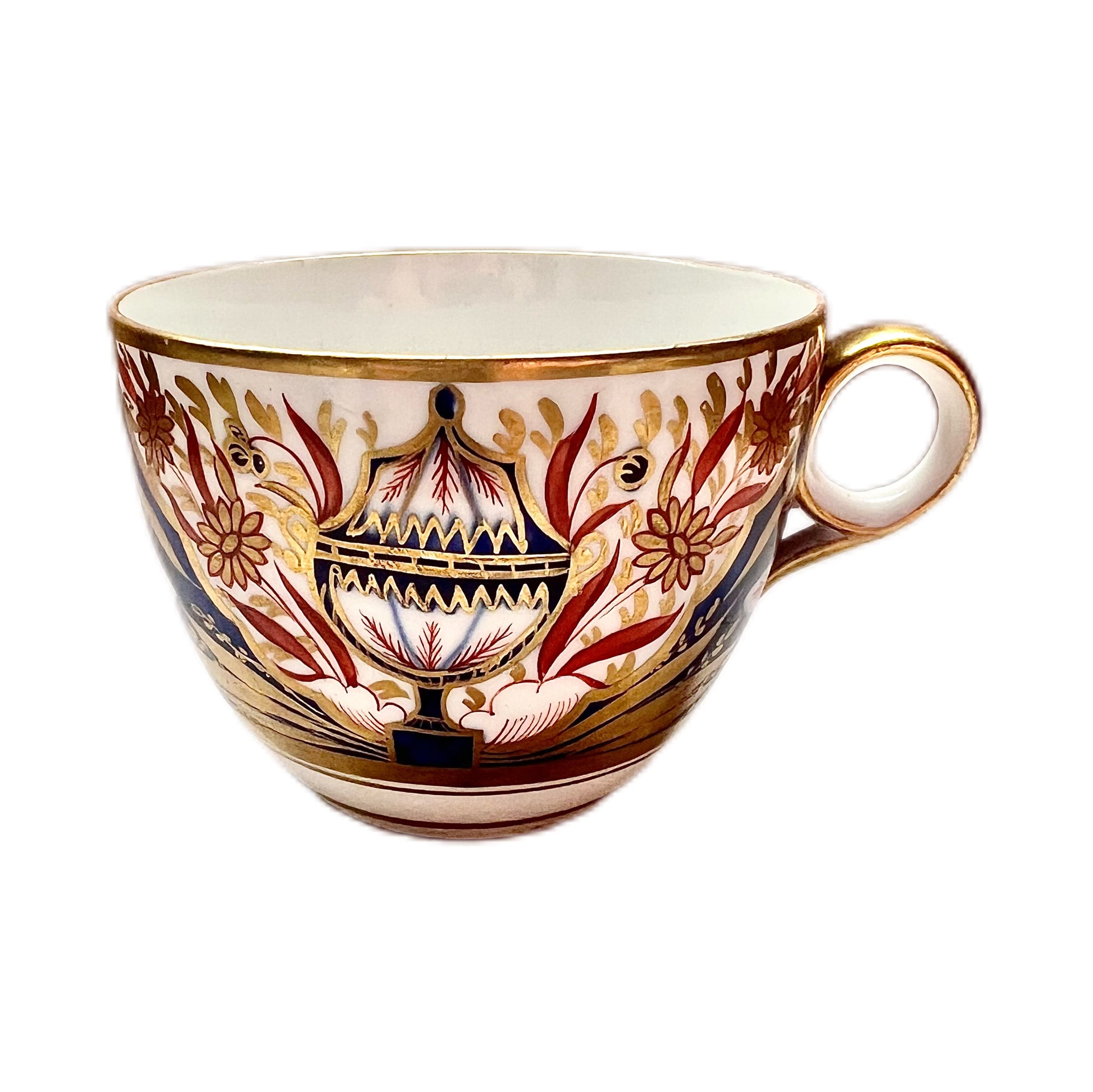 A beautiful Regency period English hard paste porcelain Bute shaped teacup with ringhandle, circa 1800s to 1810s. Intricately handpainted with Imari style colouration with a neo-classical lyre pattern.
