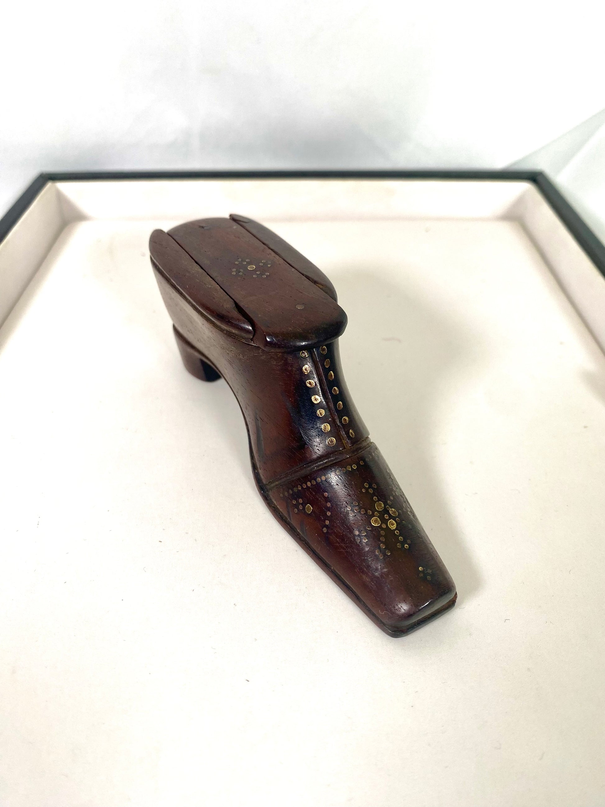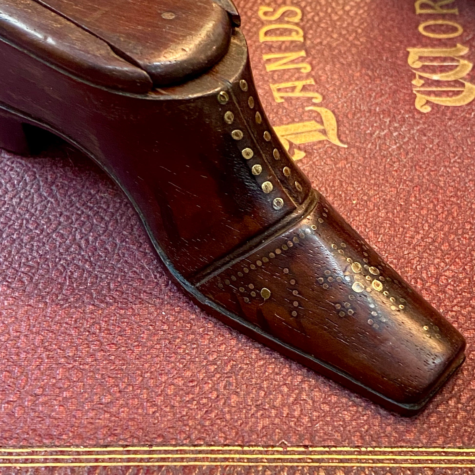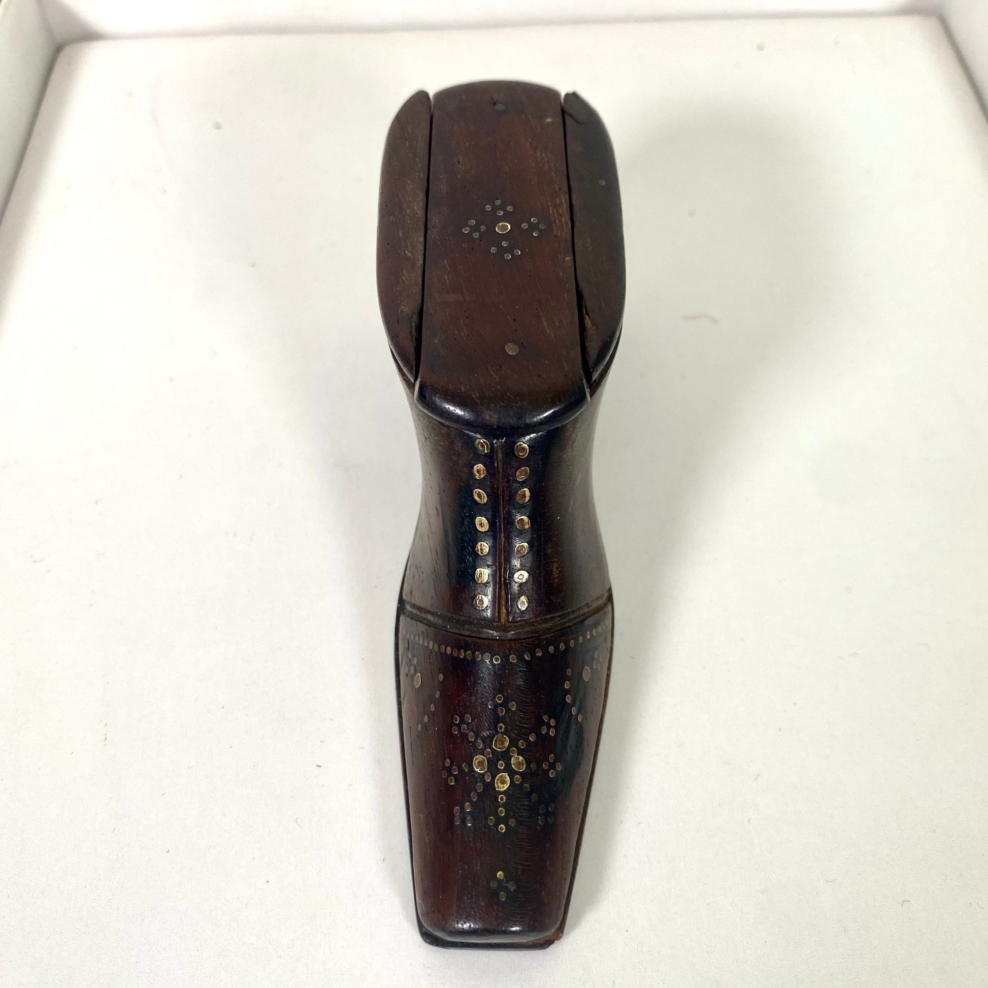 这件作品可能是用果木雕刻而成,是一个很可爱的例子。我们曾见过这种带有黄铜饰件的鞋鼻烟盒,被描述为乔治亚风格,我们认为这件作品的年代不晚于维多利亚时代晚期,即 19 世纪 60 年代。它雕刻精美,鞋面造型感性,精美的黄铜别针凸纹勾勒出顶部的“针脚”图案。特别是凸纹延伸到鞋跟,形成迷人的吉祥马蹄图案。几个世纪的珍贵使用赋予了它令人惊叹的光泽,带有栗色和桃花心木色的色调。