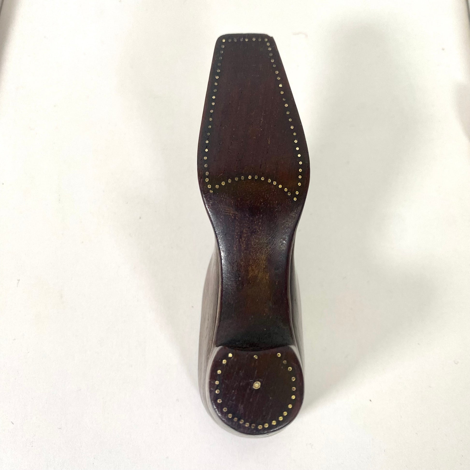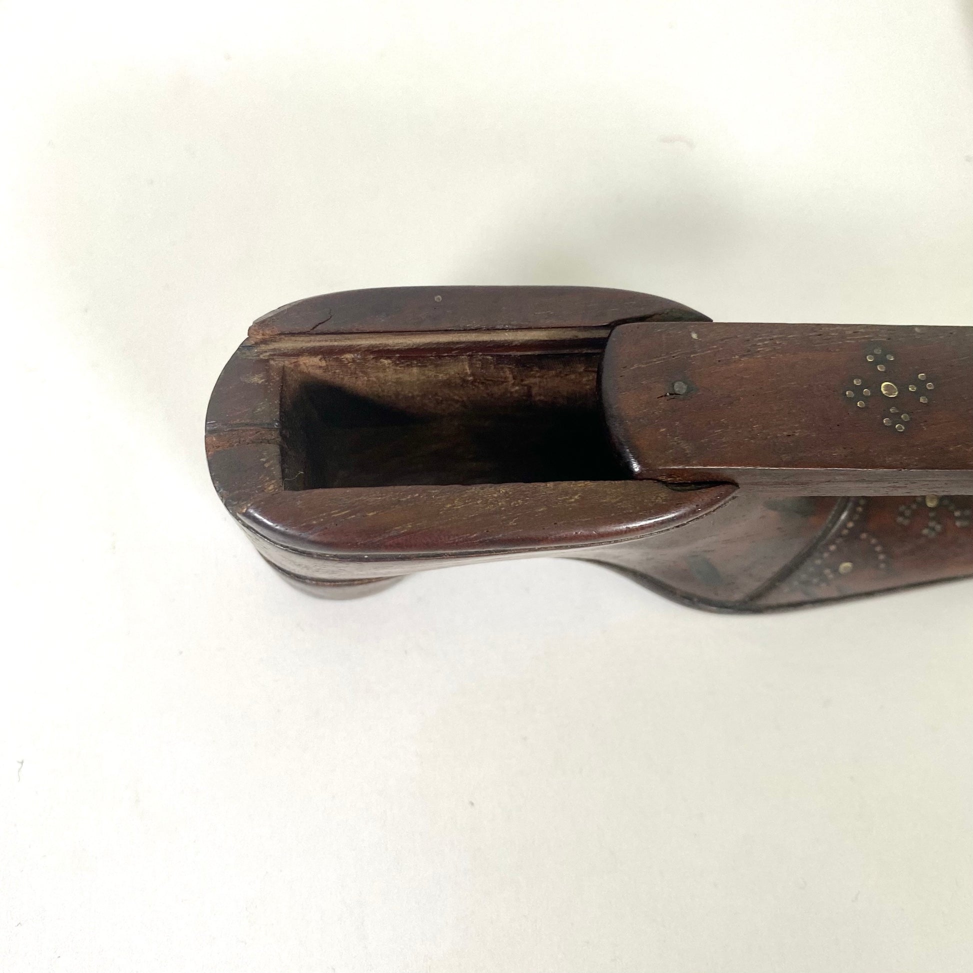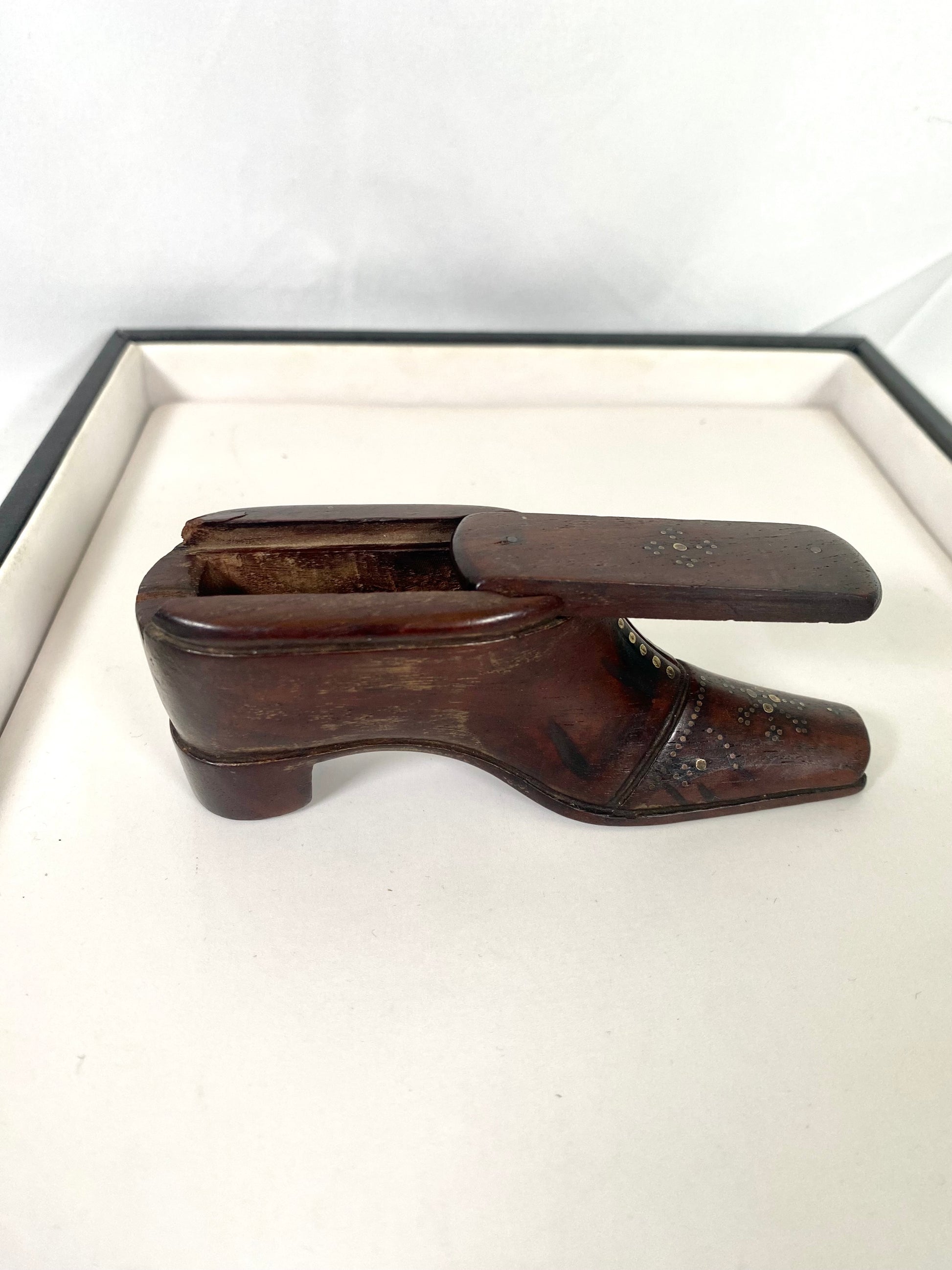 这件作品可能是用果木雕刻而成,是一个很可爱的例子。我们曾见过这种带有黄铜饰件的鞋鼻烟盒,被描述为乔治亚风格,我们认为这件作品的年代不晚于维多利亚时代晚期,即 19 世纪 60 年代。它雕刻精美,鞋面造型感性,精美的黄铜别针凸纹勾勒出顶部的“针脚”图案。特别是凸纹延伸到鞋跟,形成迷人的吉祥马蹄图案。几个世纪的珍贵使用赋予了它令人惊叹的光泽,带有栗色和桃花心木色的色调。