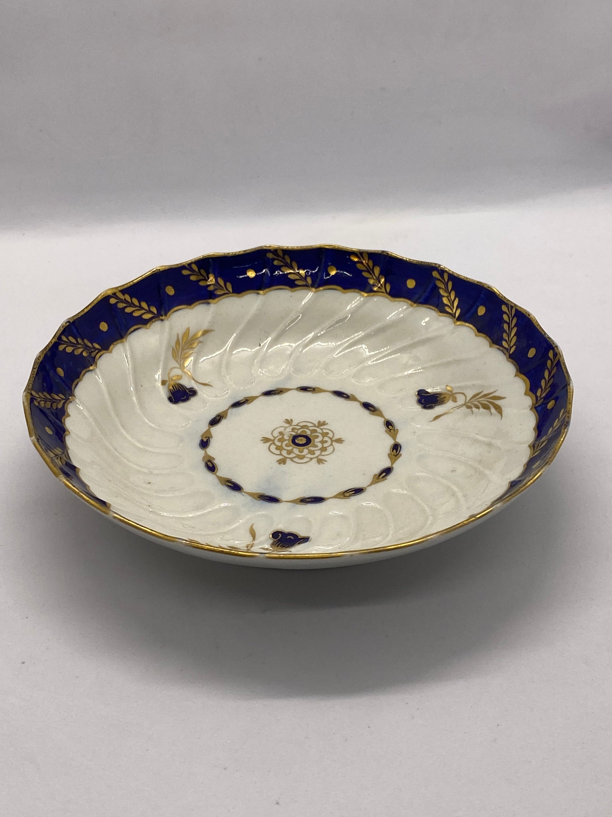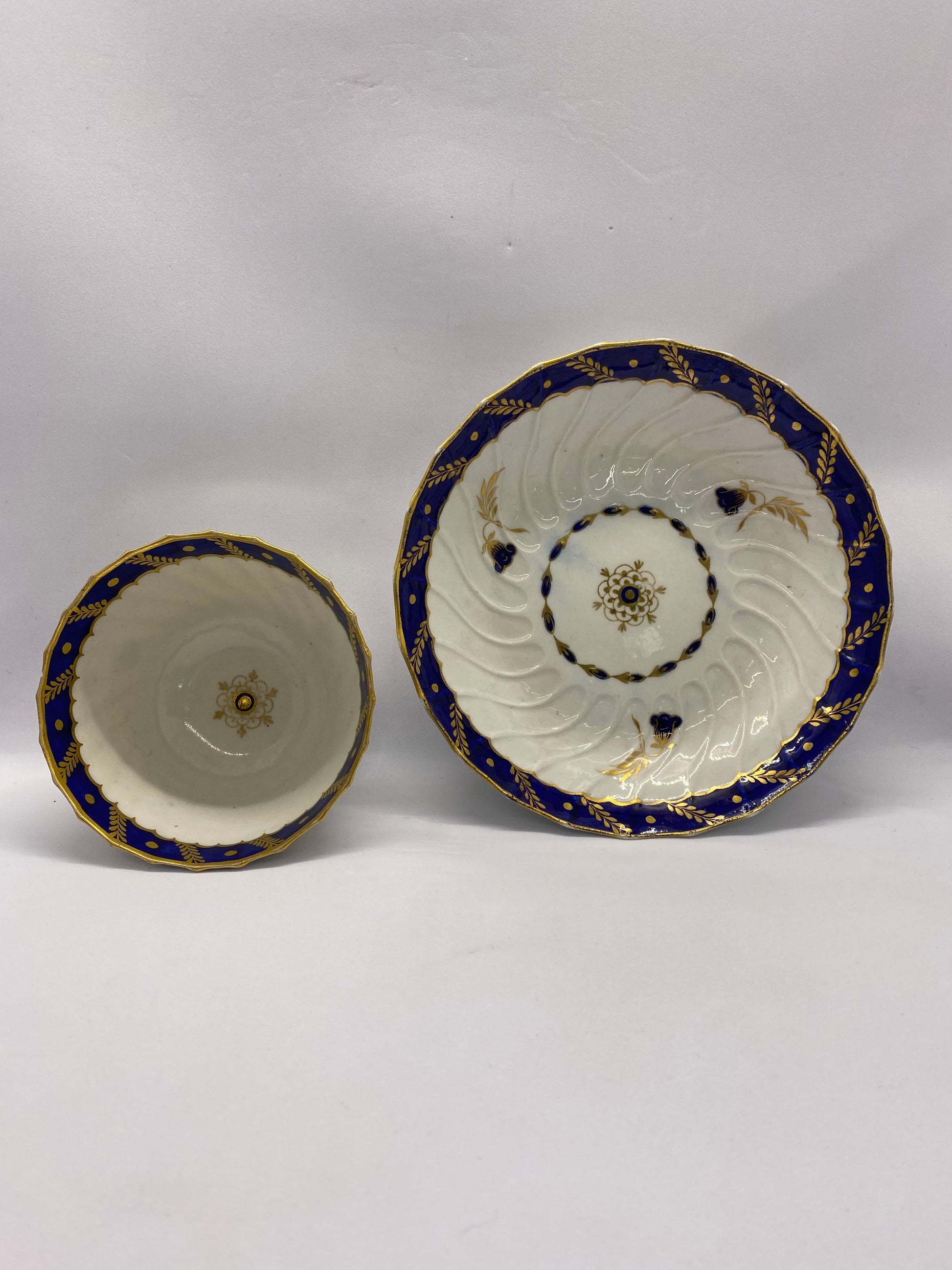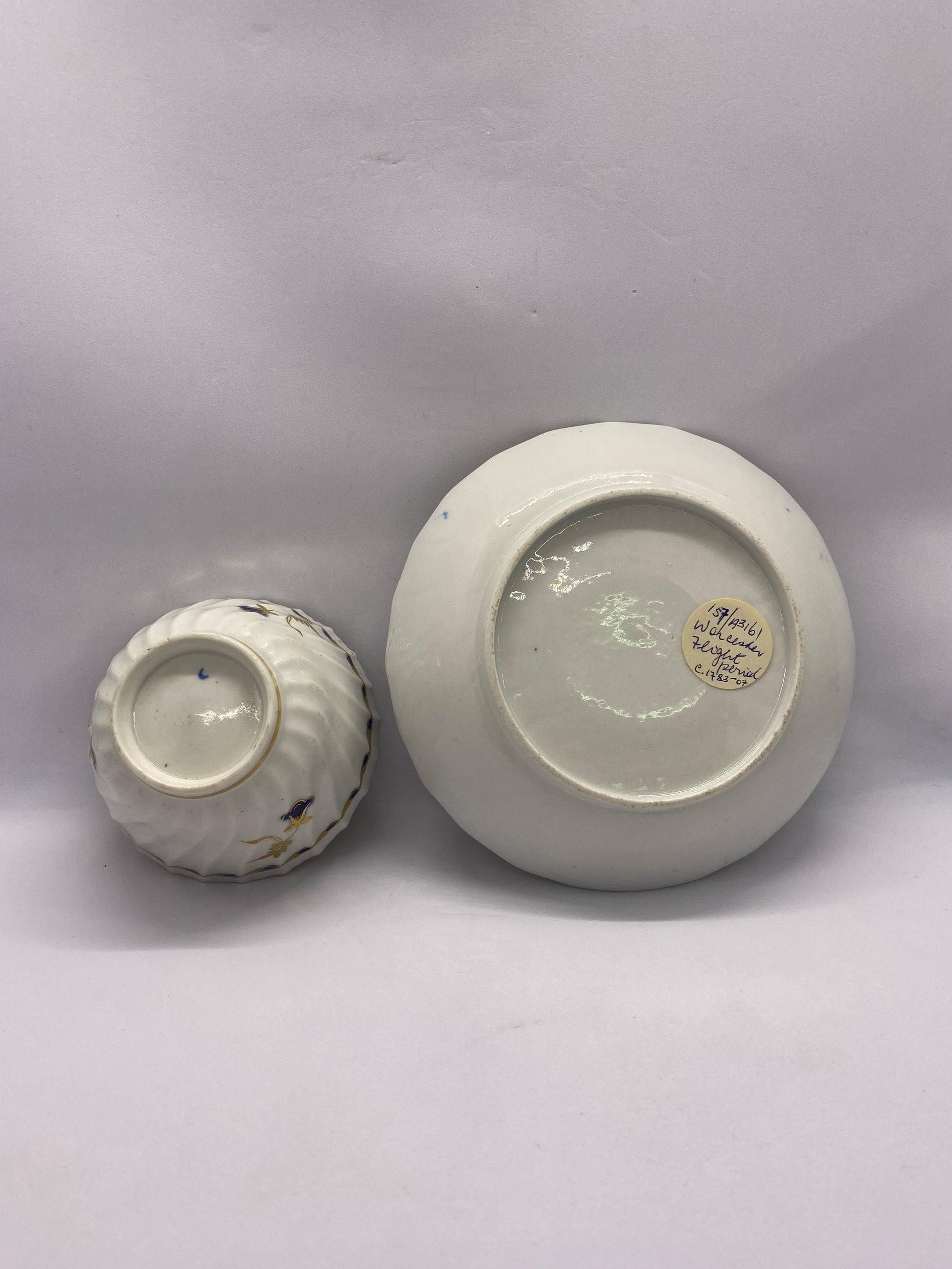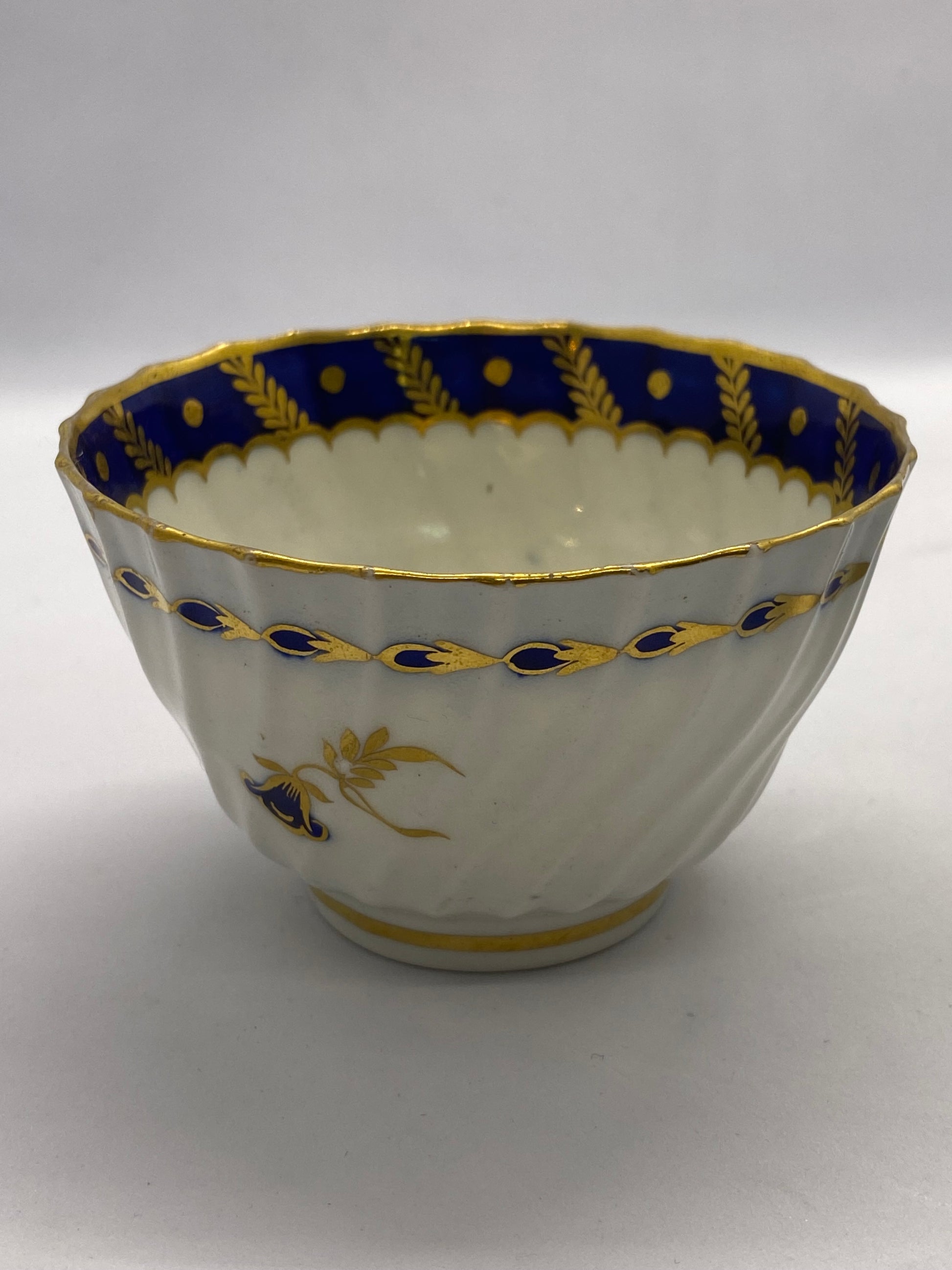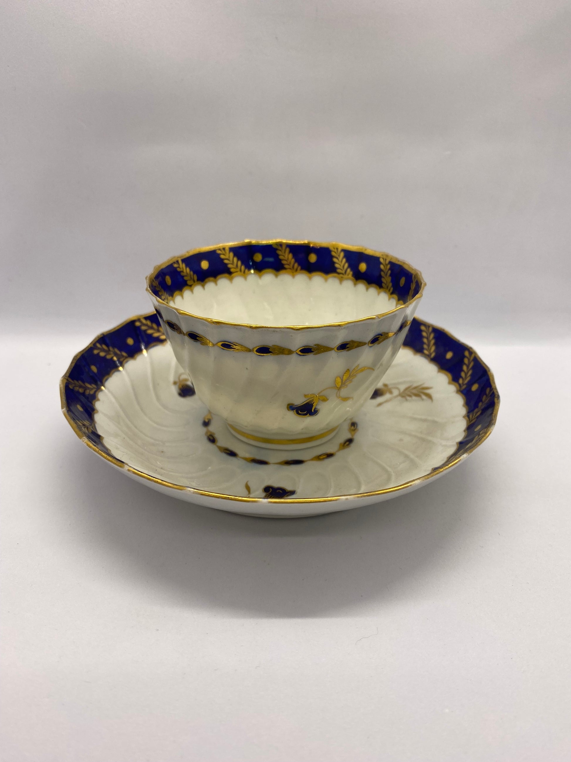 这套精美的茶碗和茶碟套装大约制作于 1785 年,是伍斯特飞行时期瓷器的典范,采用法式螺旋凹槽图案,杯子内部和茶碟饰有美丽的深蓝宝石蓝色边框。镀金玉米穗和圆点以及谷壳图案边框构成了边框图案,而镀金和蓝宝石蓝色点缀的风格化风铃草则构成了画龙点睛之笔。 两件瓷器的中心均饰有风格化的花卉图案。两件瓷器均带有蓝色新月图案,这是当时伍斯特瓷器的标志性特征。