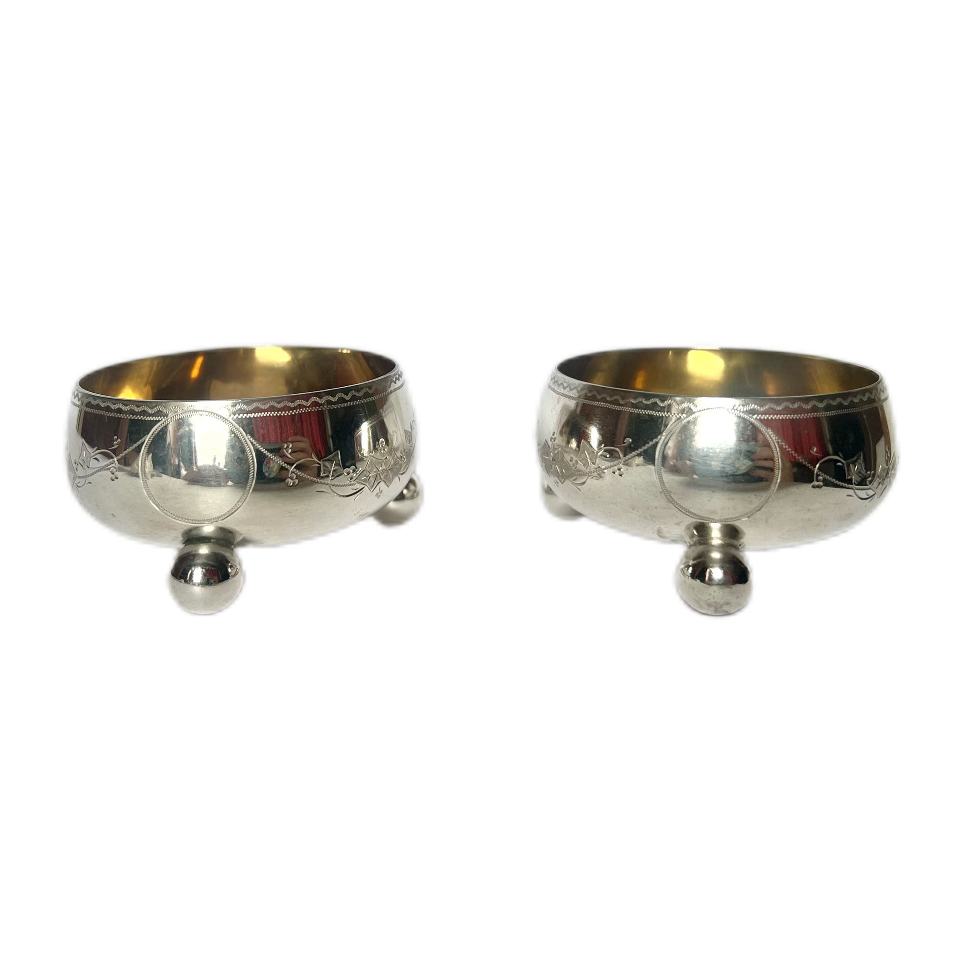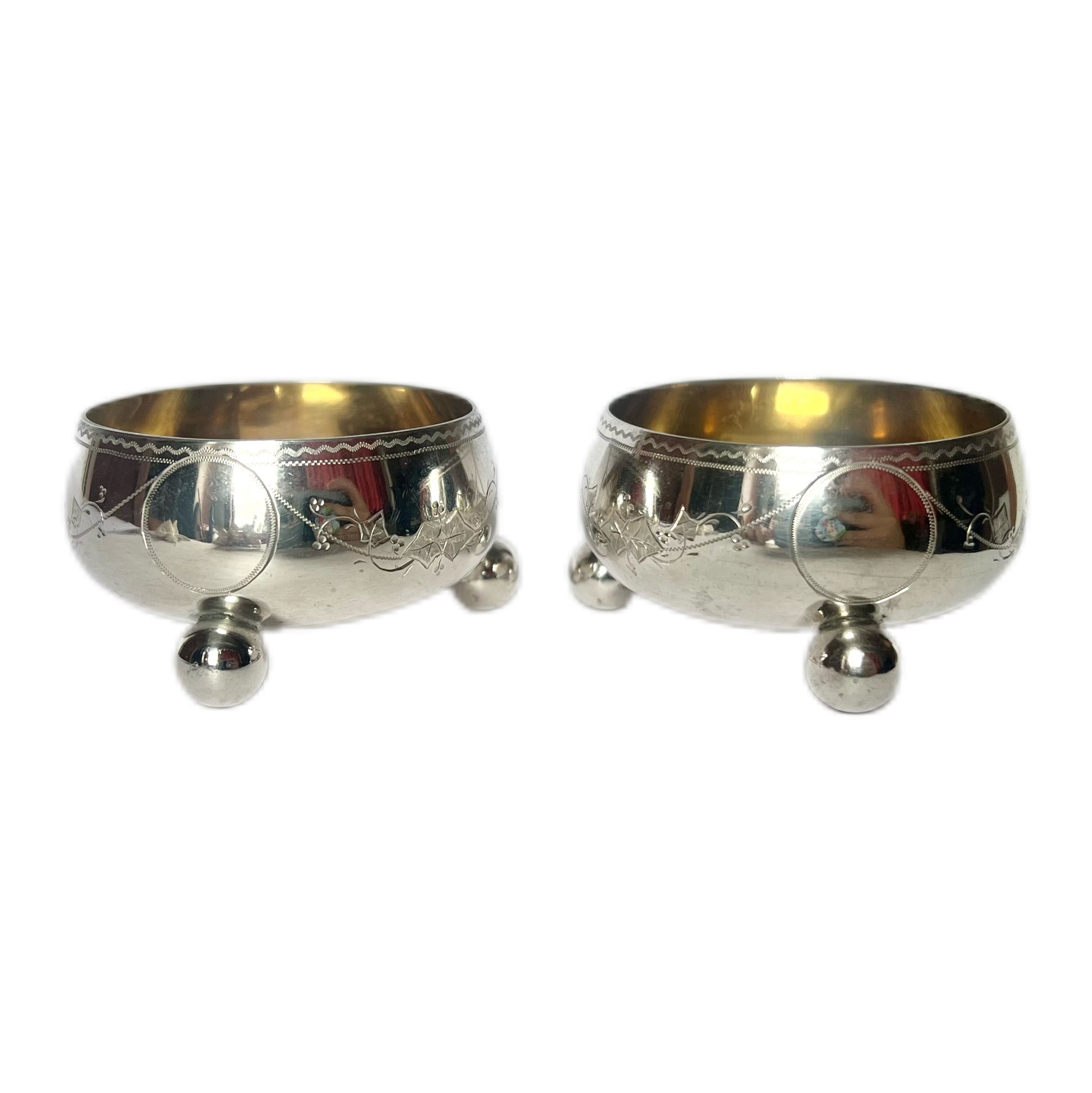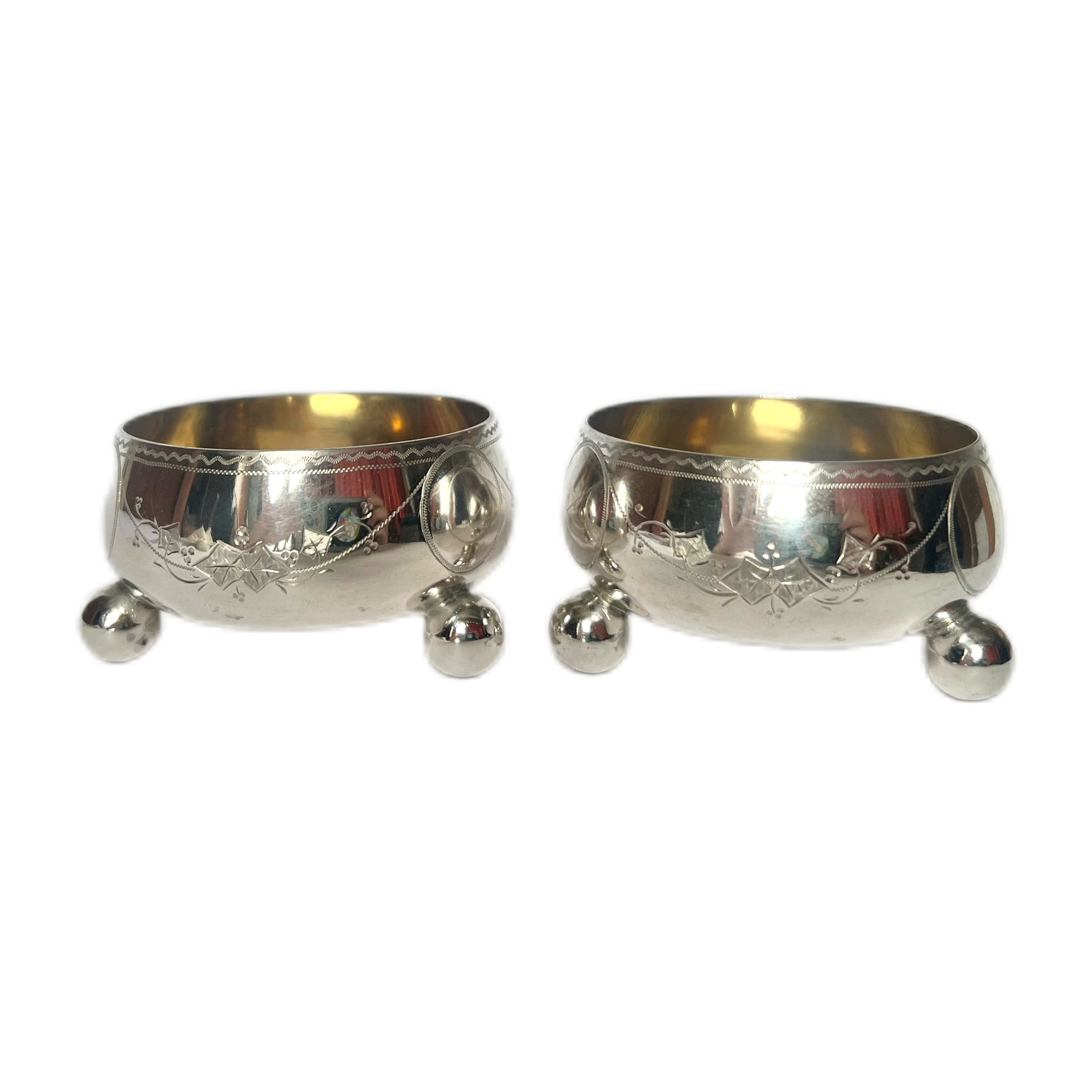 Very elegant pieces with a nod to the Aesthetic Movement, with engraving around the body, ball feet and richly gilded interiors. Christopher Dresser designed for Martin and Hall during the late 19th century, and these pieces reflect his signature avant garde, ‘proto-modernist’ style that Dresser made famous.