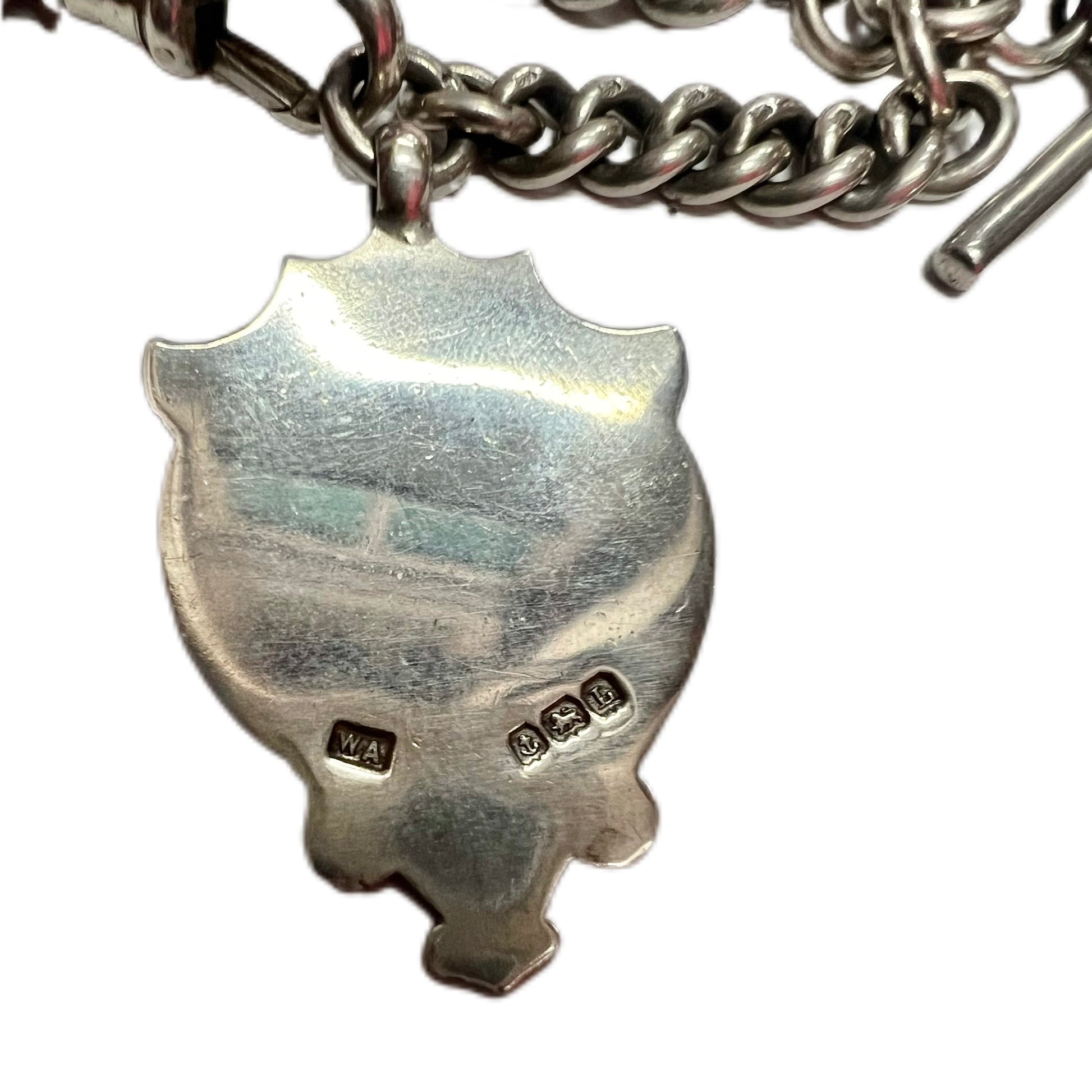 The shield fob is marked for Birmingham, 1935, William Adams Ltd. The firm was located on Barr St, Birmingham and was active from 1900 to 1978.