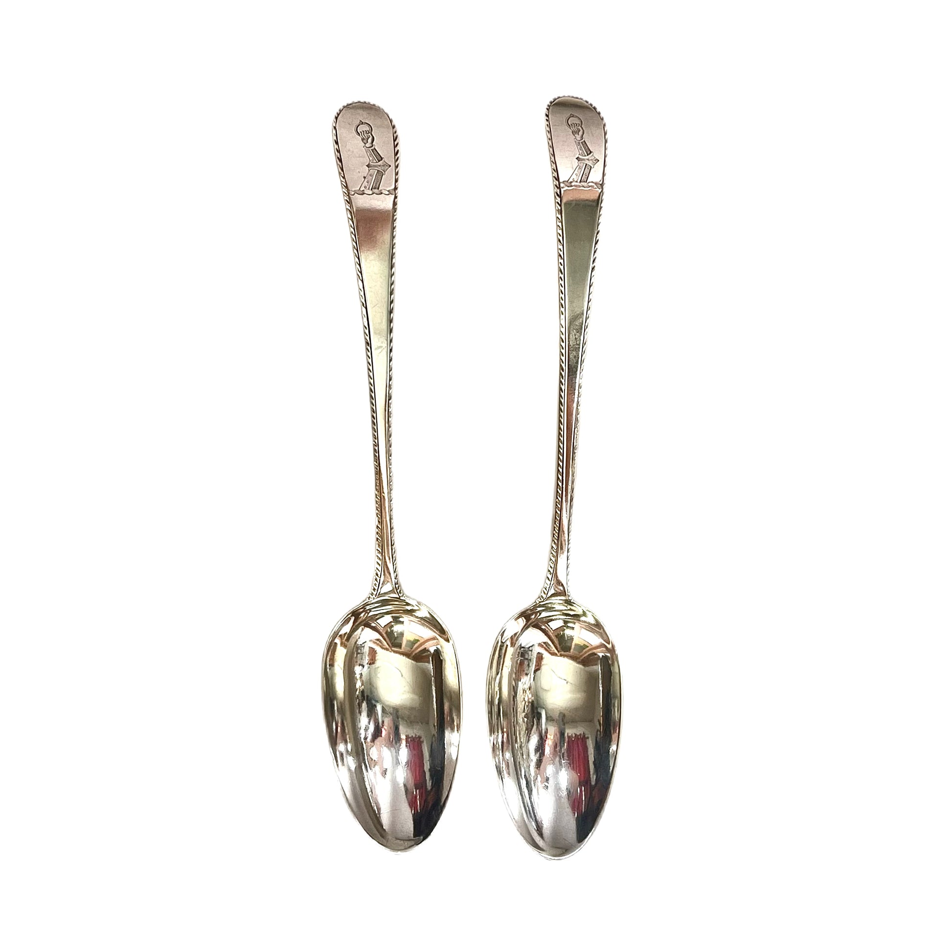 Matching pair of crested George III sterling silver serving spoons by Hester Bateman