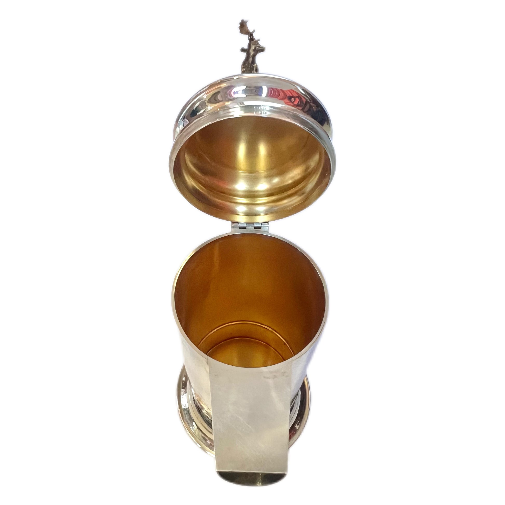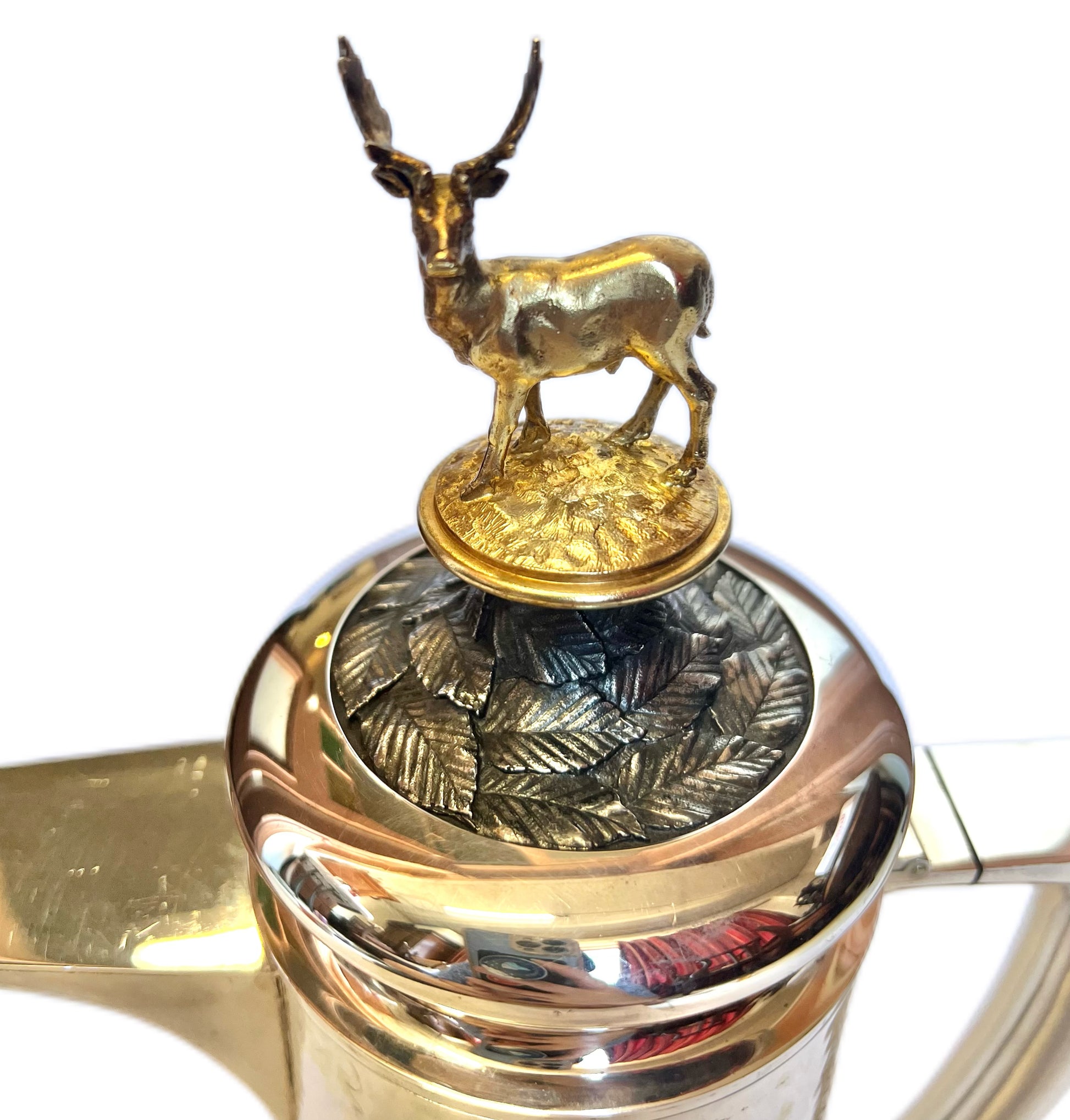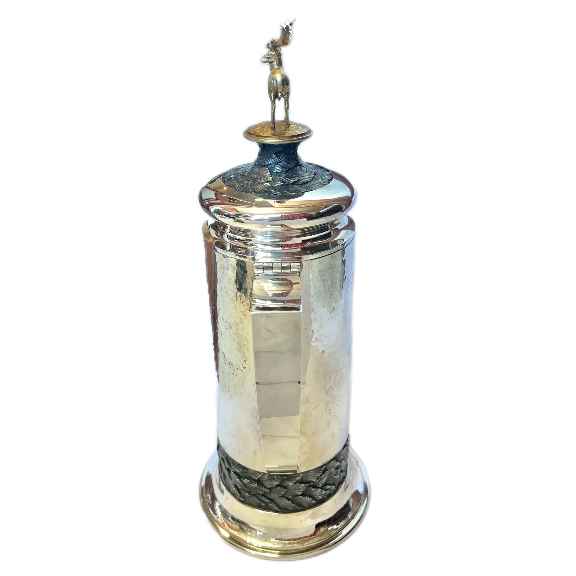This was commissioned by the Epping Forest Centenary Trust to commemorate the centenary in 1978 of the Corporation of London's role as conservators of Epping Forest. With a capacity of 2 pints, this is of substantial size and the craftsmanship is excellent as befitting Aurum, with planished body, blackened silver details and a gilt silver stag finial to the top.
