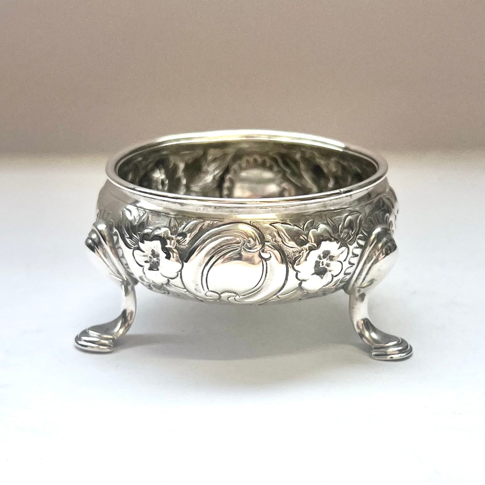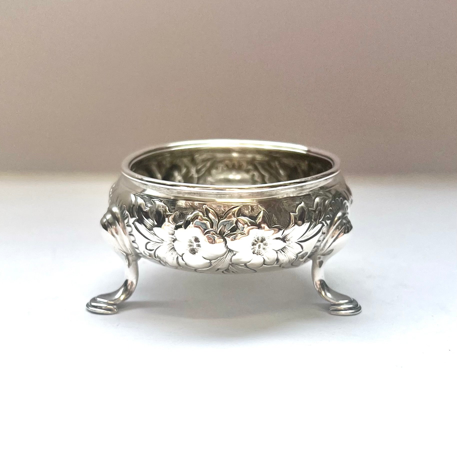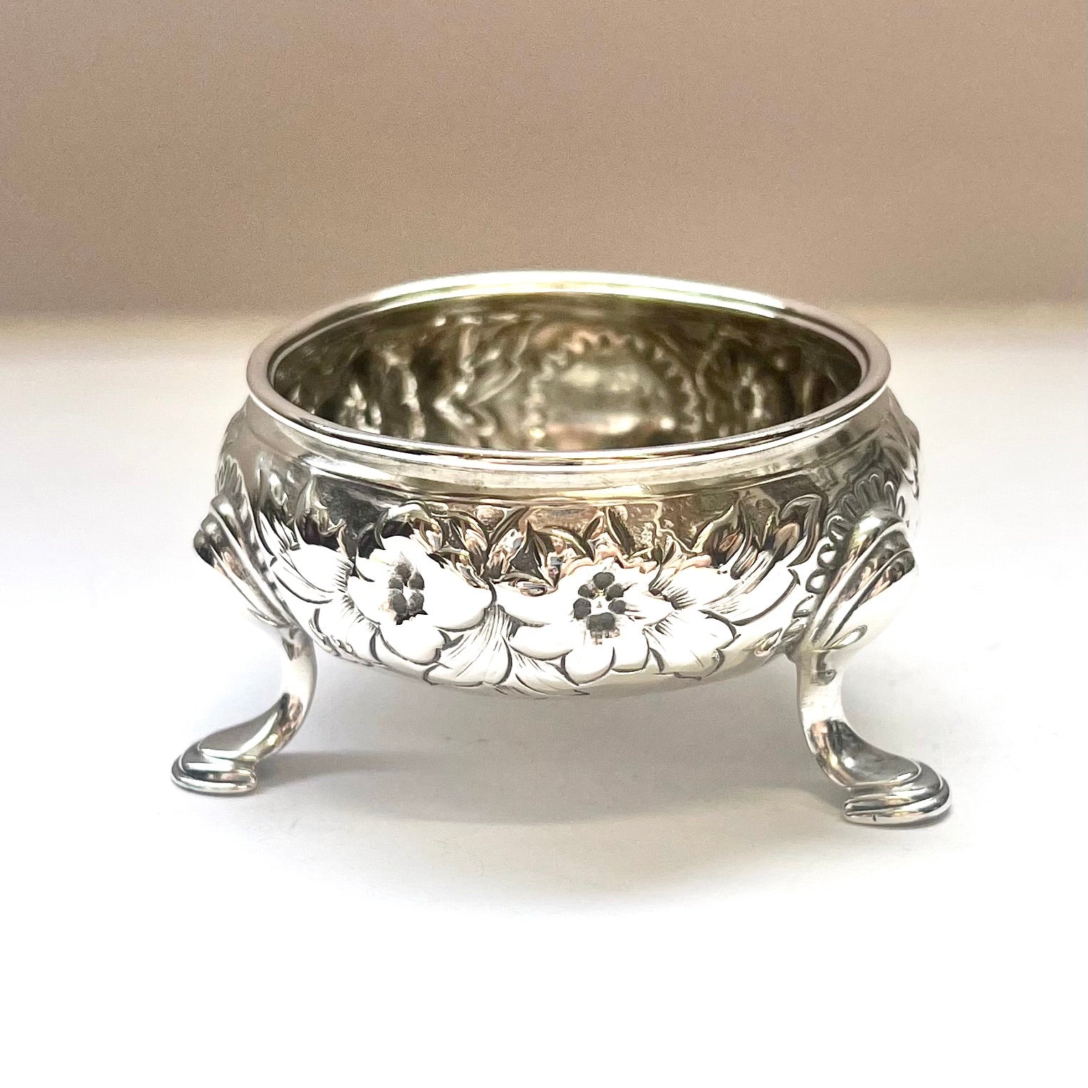精美的乔治二世纯银盐窖,带有伦敦标记,1751 年,大卫·亨内尔一世。亨内尔活跃于 1739 年至 1755 年,是“亨内尔王朝”的创始人,该王朝是一长串著名的银匠家族,他们以精湛的雕刻工艺而闻名,尤其是与盐、茶和葡萄酒有关的器皿。亨内尔的传奇以伦敦邦德街的 Frazer & Haws 和 Hennells 的名义延续下来。