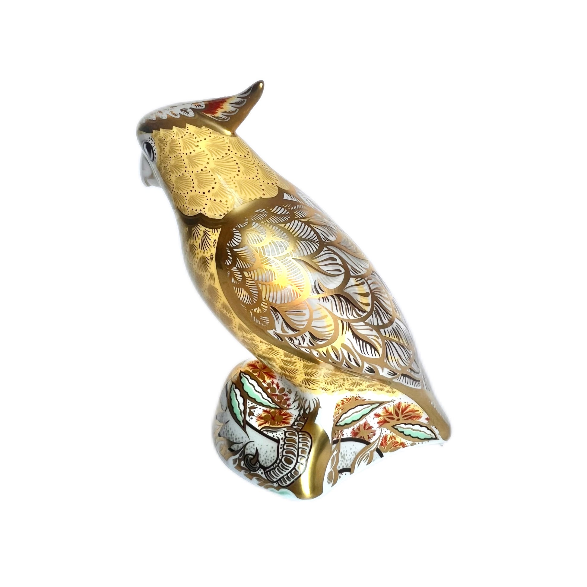 A beautiful and rare Royal Crown Derby Citron Cockatoo paperweight figurine circa 2004, this was a pre-release limited edition piece. Beautifully made with 22kt gilt details and handpainted Imari inspired motifs. With beautiful 22 carat gold plated stopper denoting first quality, this is a highly collectible and stunning piece.