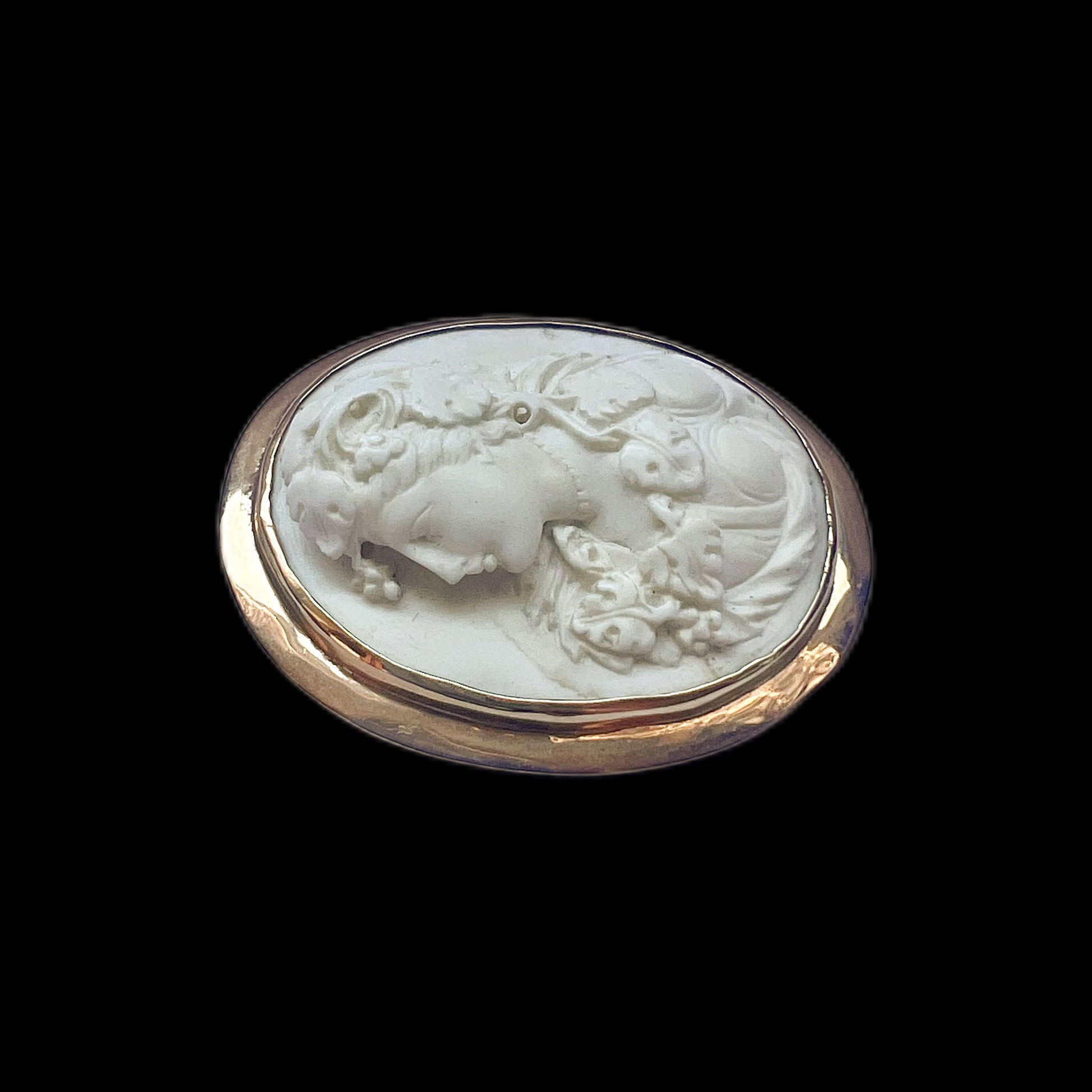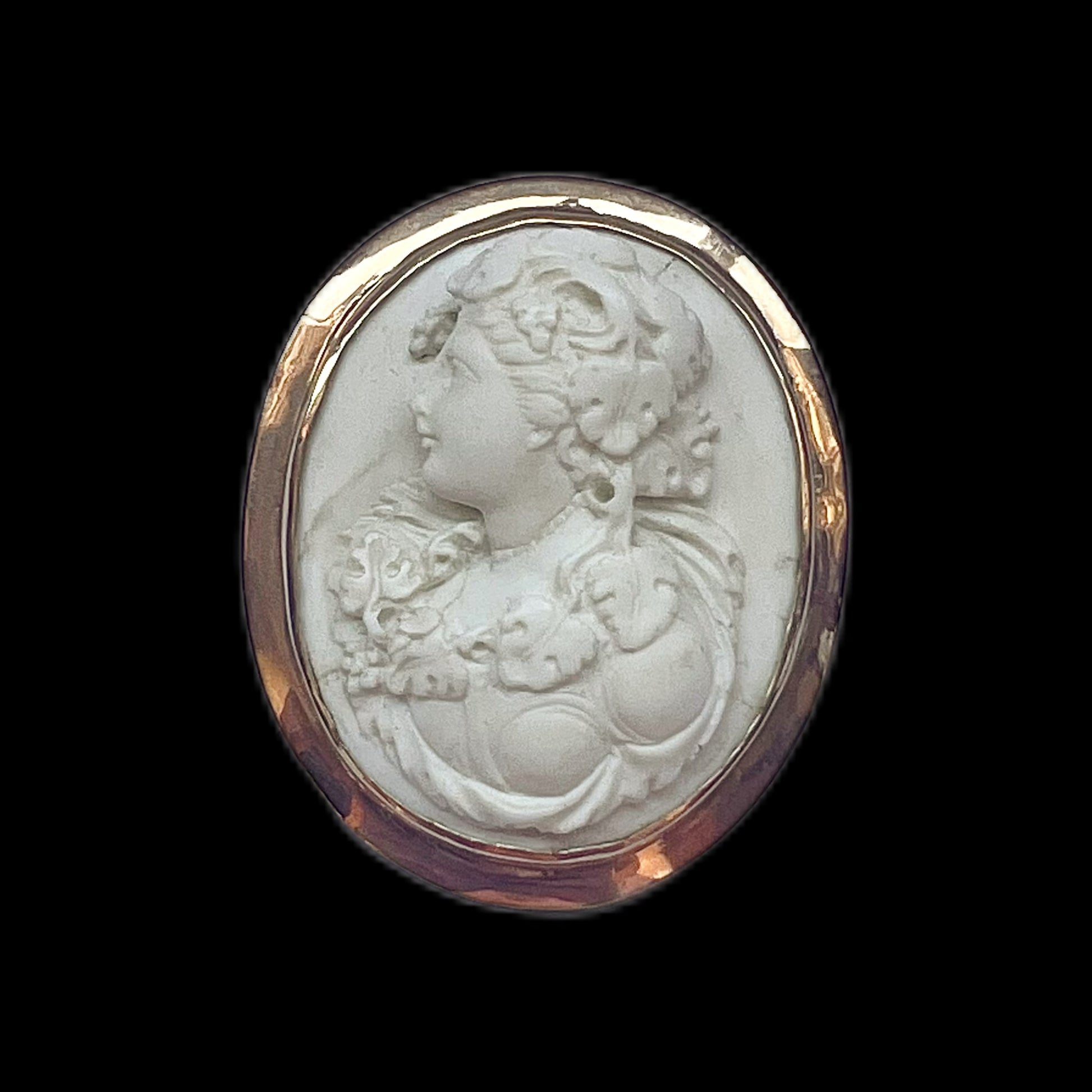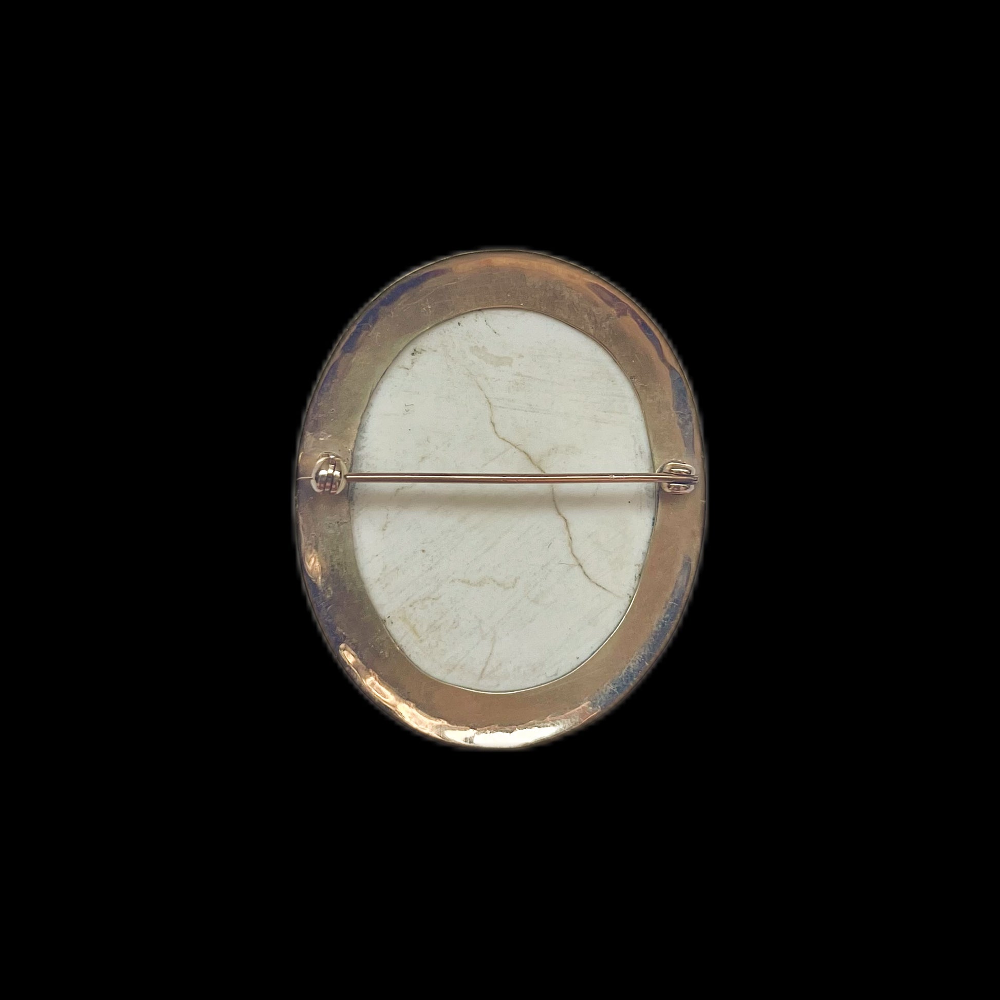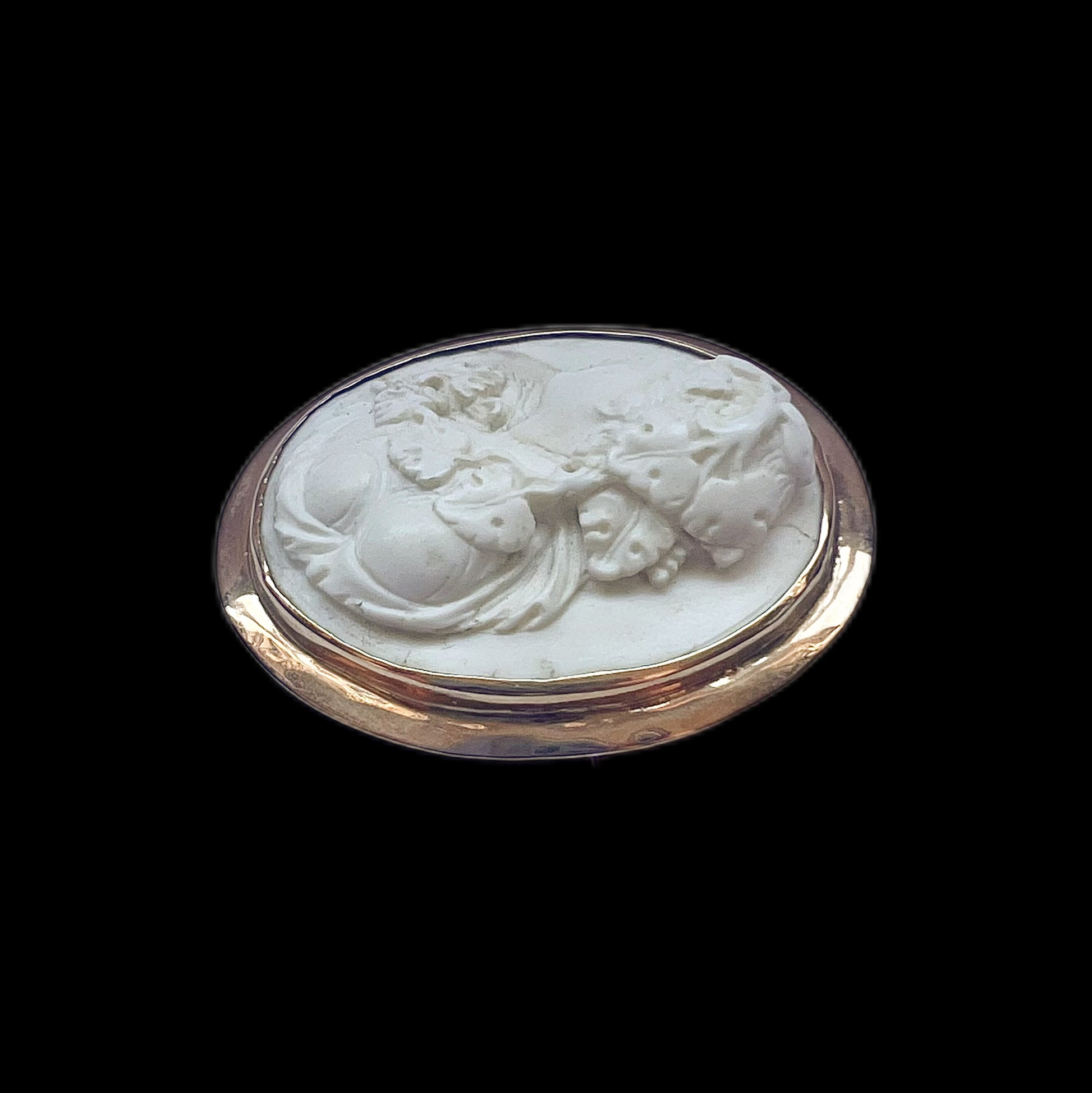 Beautiful and rare Regency period 9ct gold and white lava cameo brooch depicting a woman in the neo-classical style. Unmarked but XRF tested as 9 carat gold. The carving is of exceptional quality and stands in high relief; this was likely a Grand Tour souvenir circa first quarter of the 19th century. Lava cameos such as this one were originally sold near Pompeii so that visitors could commemorate their visit to the Pompeian ruins, and were highly popular during the 19th century.