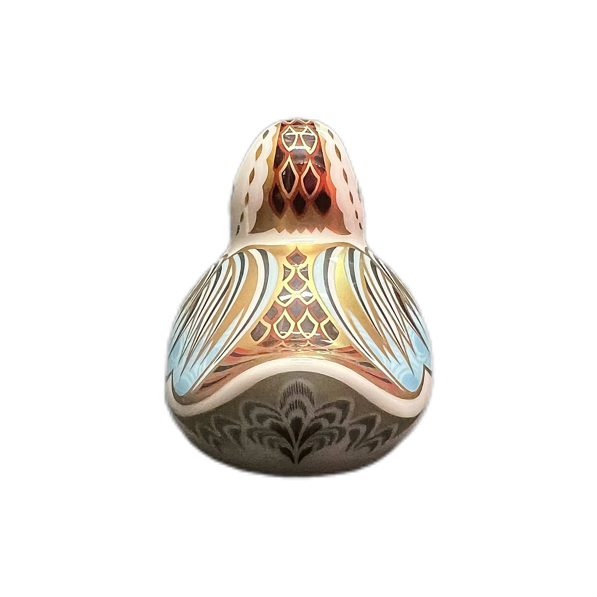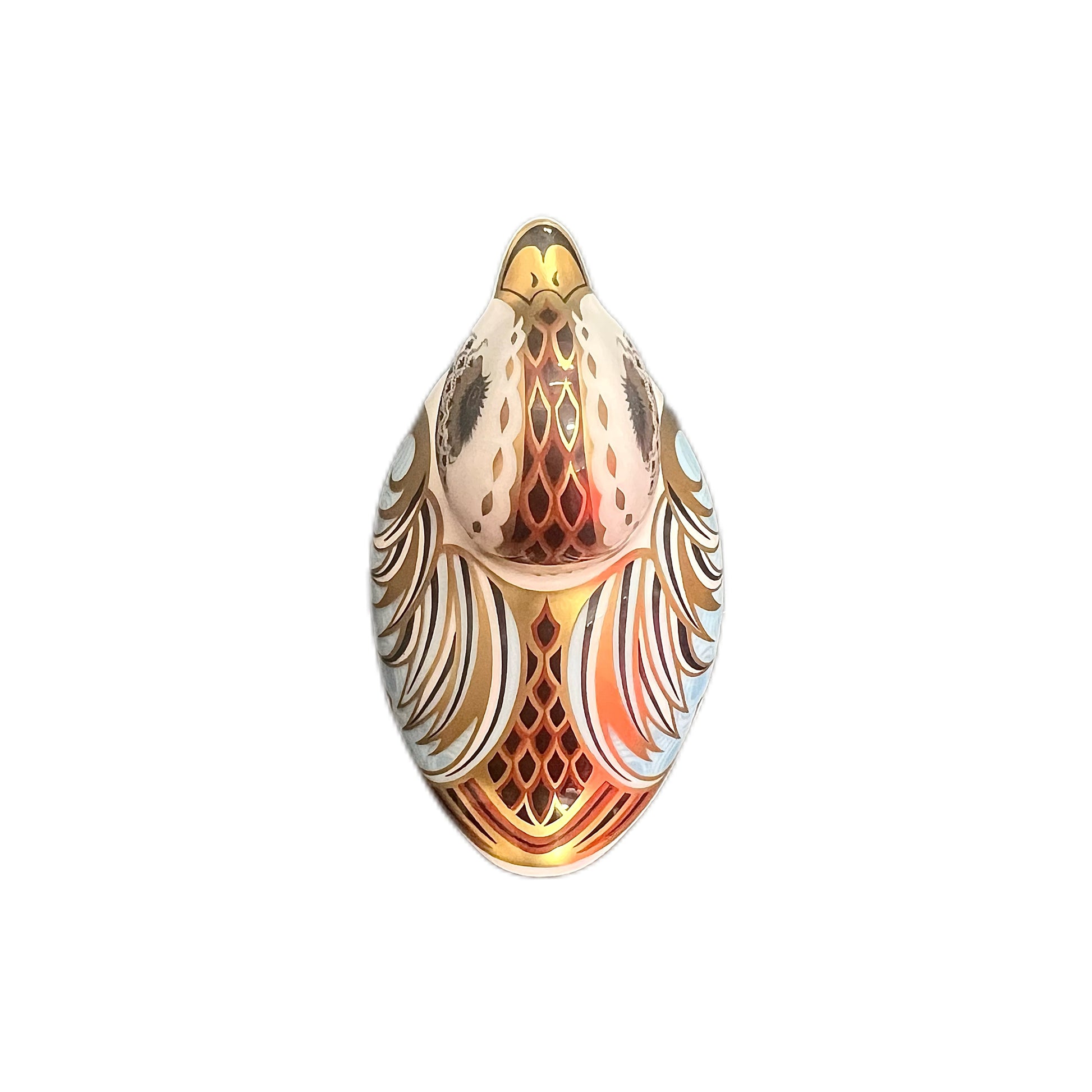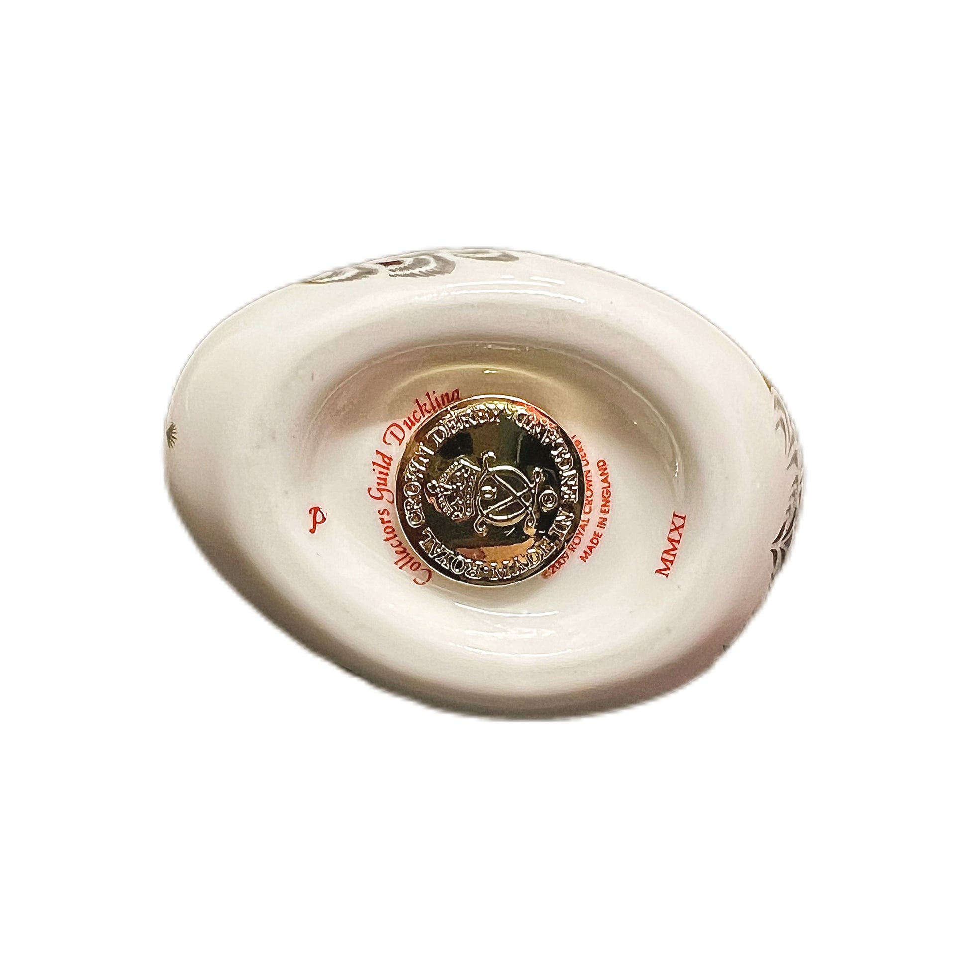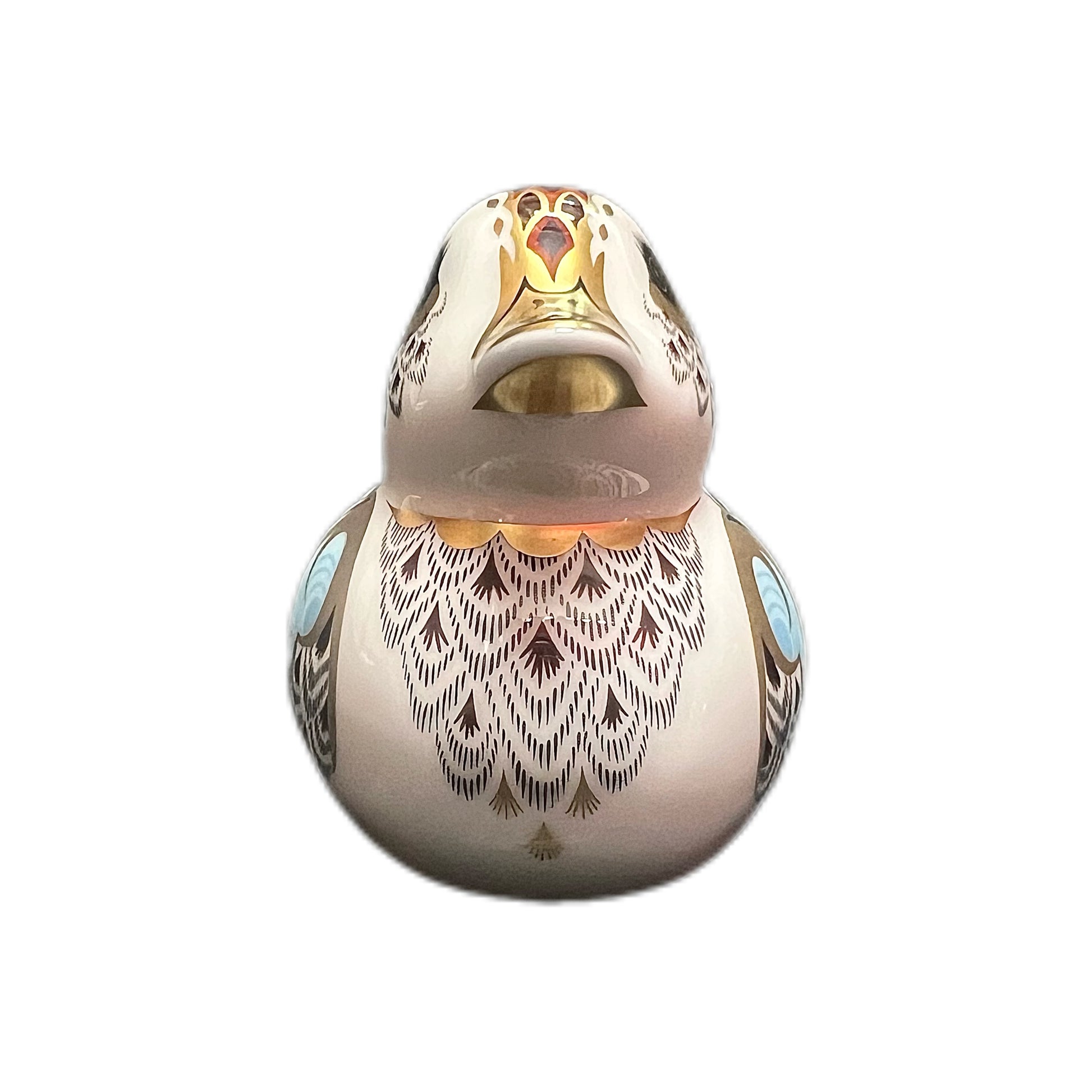 A beautiful and rare Royal Crown Derby Guild Duckling paperweight figurine circa 2009, this was a Collectors Guild Exclusive limited edition. Very well made with 22kt gilt details and handpainted Imari inspired motifs. With beautiful 22 carat gold plated stopper denoting first quality, this is a highly collectible and stunning piece.