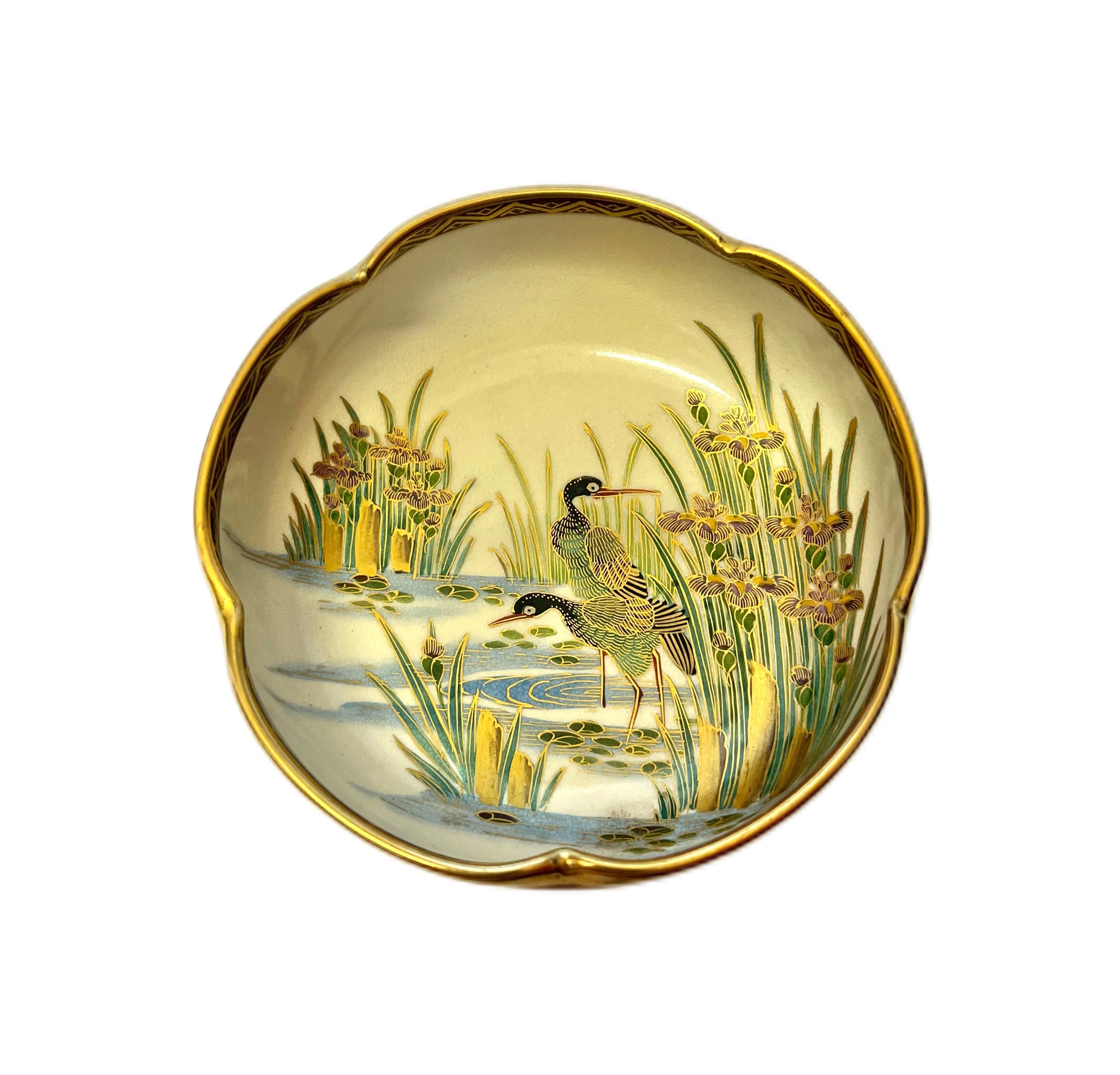 A beautiful vintage blossom-shaped Satsuma ware bowl by Koshida 越田, which we believe to have been made circa 1950s to 1960s. Decorated with gilt border rim, handpainted motifs of autumn leaves and ducks and beautifully gilded, the Koshida kiln during late Meiji to Taisha period was known for its exemplary work. Although briefly revived post WWII, their output was affected by postwar circumstances and the kiln would eventually close.